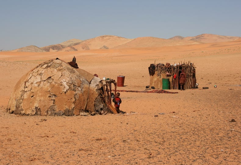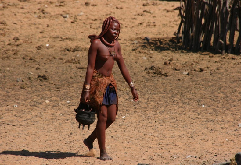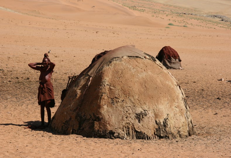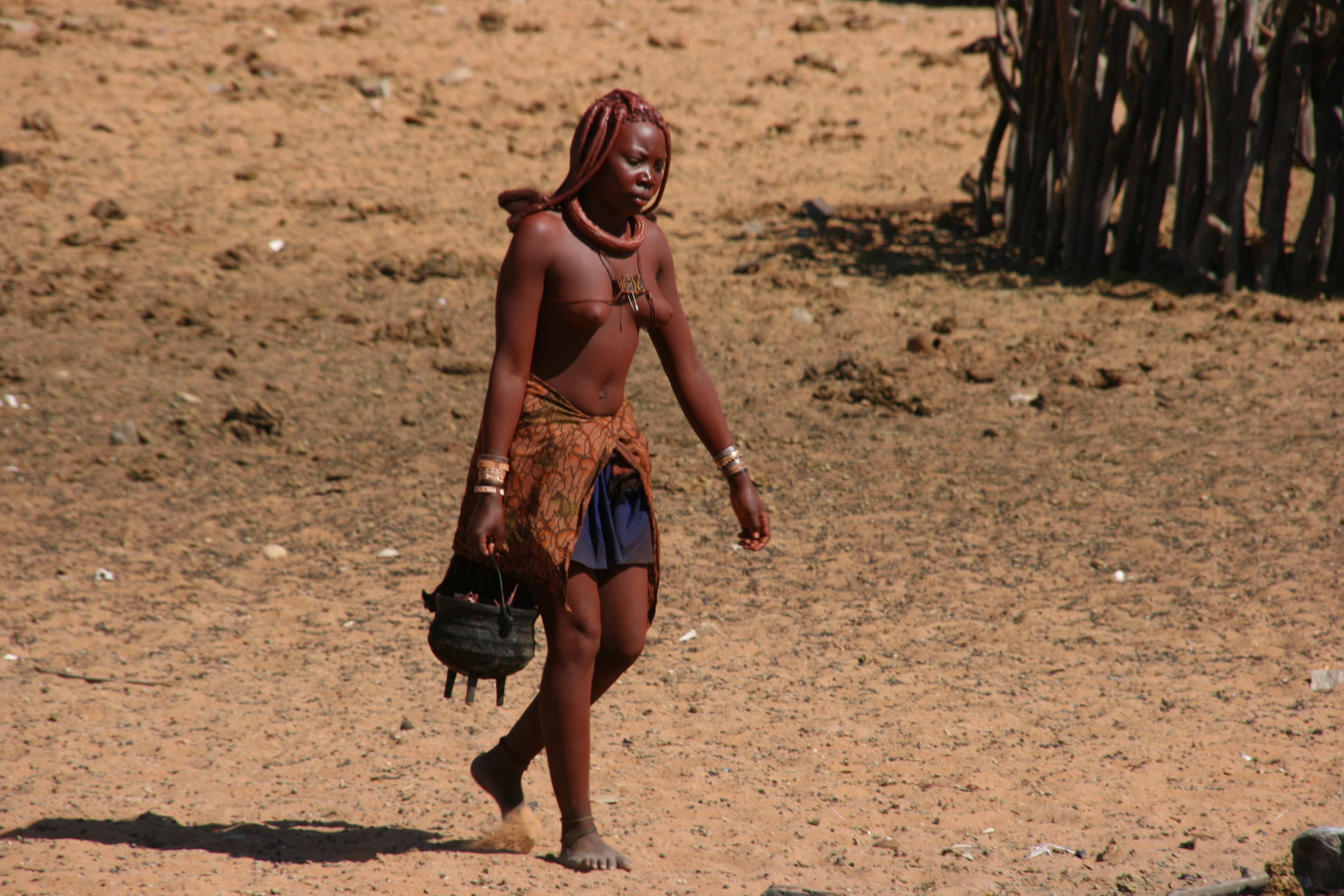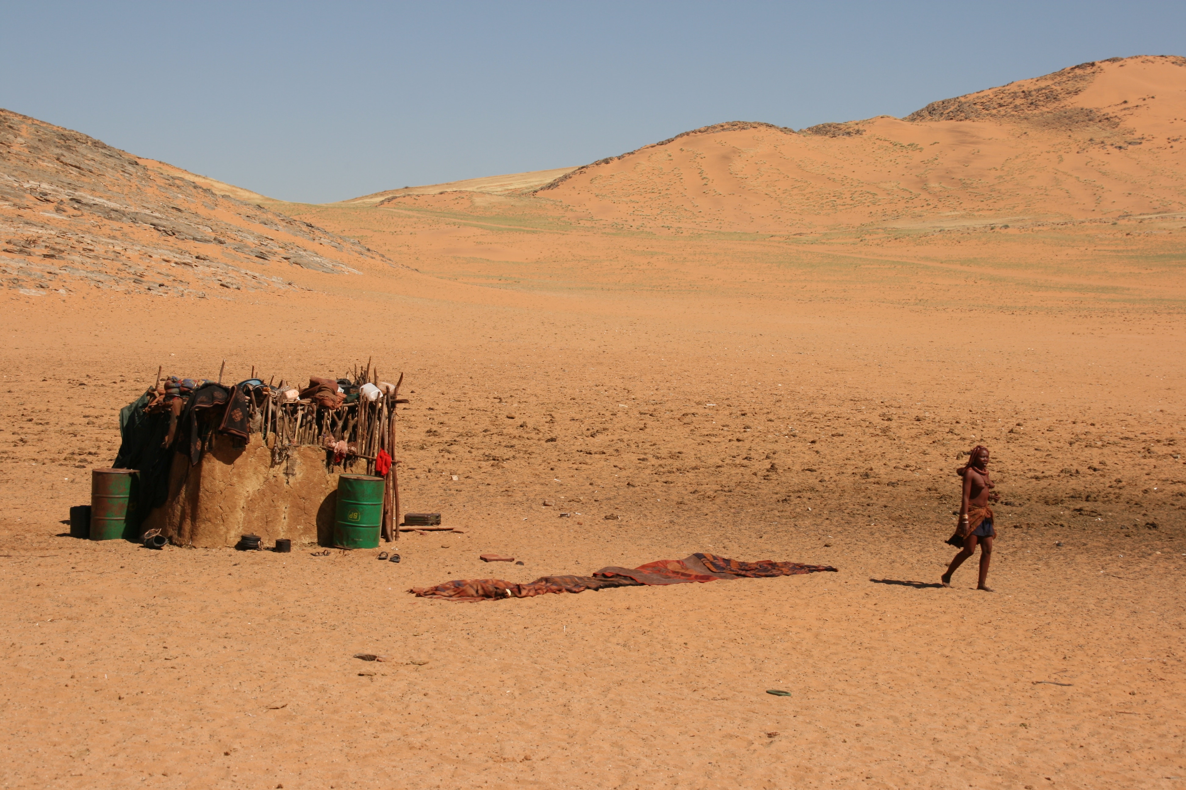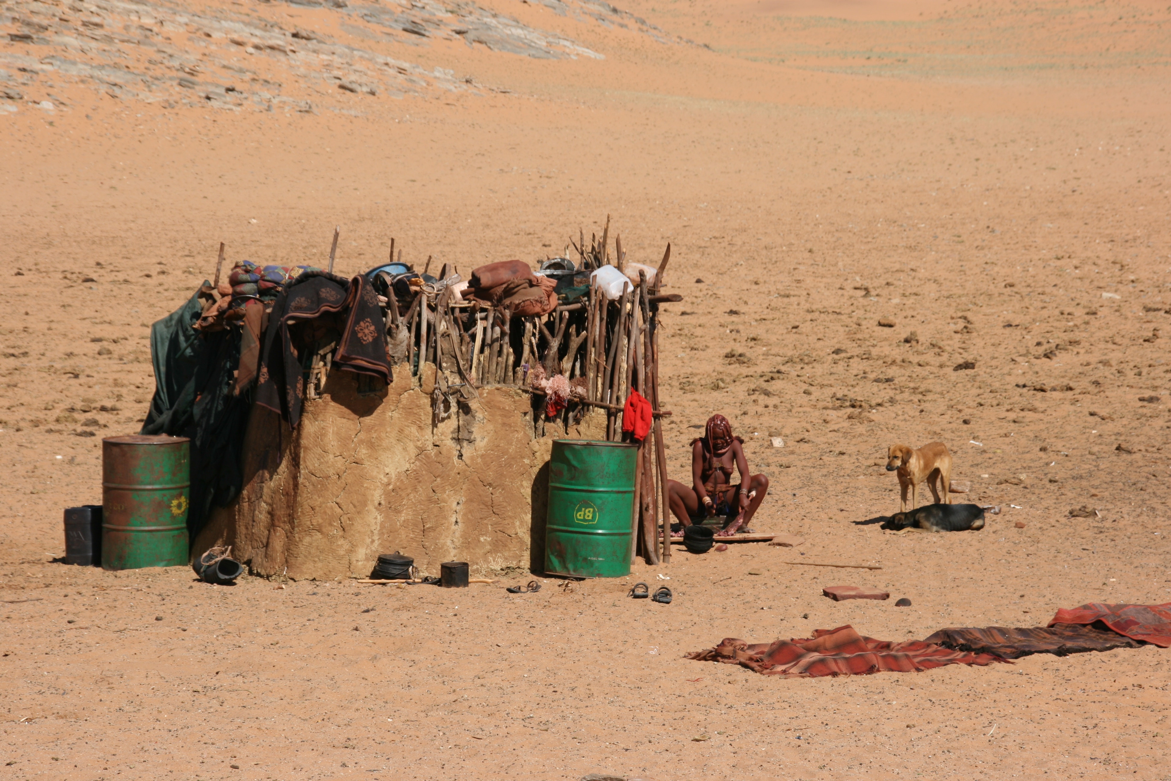 We returned to our accommodation at about 9:30 am, totally caught up in the magic of our experience on the river. After a short rest, we set out at about 10:00 am to visit a Himba encampment that was about 20 minutes drive from our camp. The Himba are a nomadic tribe of pastoralists who still largely retain their traditional lifestyle. We passed a couple of abandoned Himba encampments before arriving at our destination, an encampment inhabited by a family comprising a married couple, several children (of which only a teenage daughter and a young son were present at the time of our visit), and their aunt.