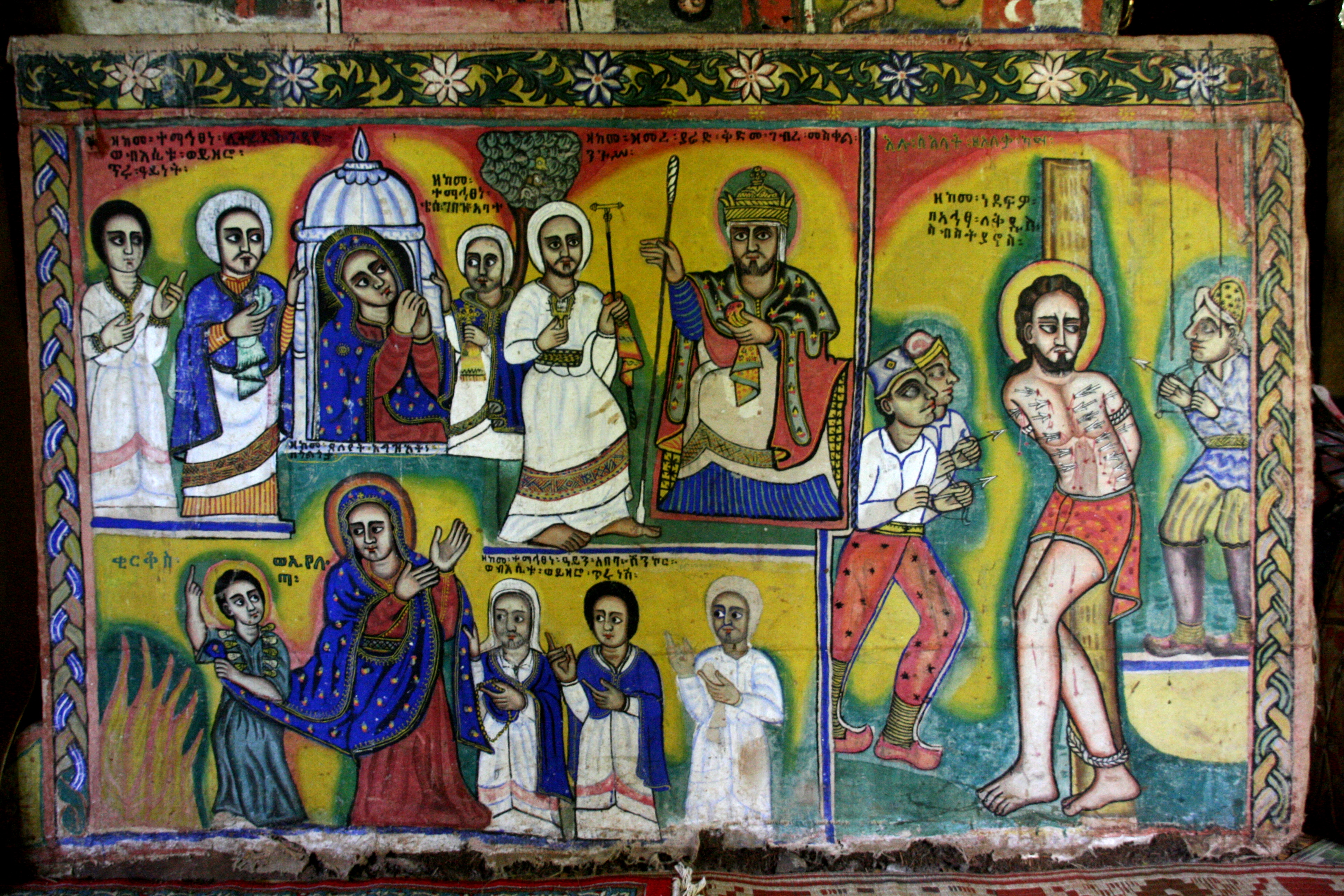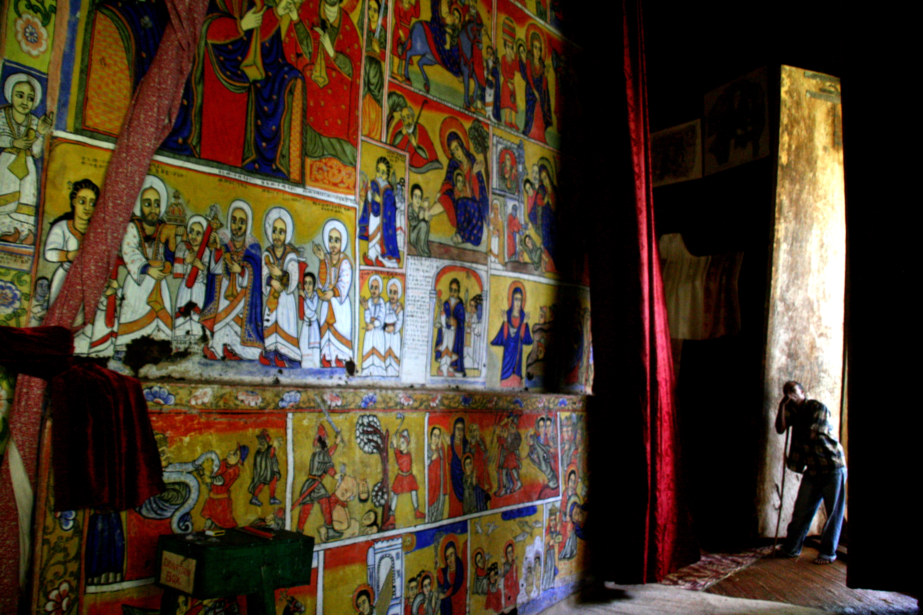 The high walls separating the inner ring from the monastery’s central Holy of Holies are collectively known as its ‘maqdas’. At the Ura Kidane Meret. hundreds of bright frescoes have been painted on the maqdas to illustrate various biblical scenes and stories, together with some events which relate to early Ethiopian martyrs and some uniquely apocryphal events (see top photo). The paintings are very beautiful and fresh, as some of the lower ones that had become worn were repainted in the 19th century. The main reason that the monasteries have these wonderful paintings is for use as a teaching device during pre-literate times. With its high roofs, the building was cool and contemplative, the silence broken only by the periodic overhead roar of Ethiopian Air Force MiG-23 fighter jets which were doing practice runs over the lake.