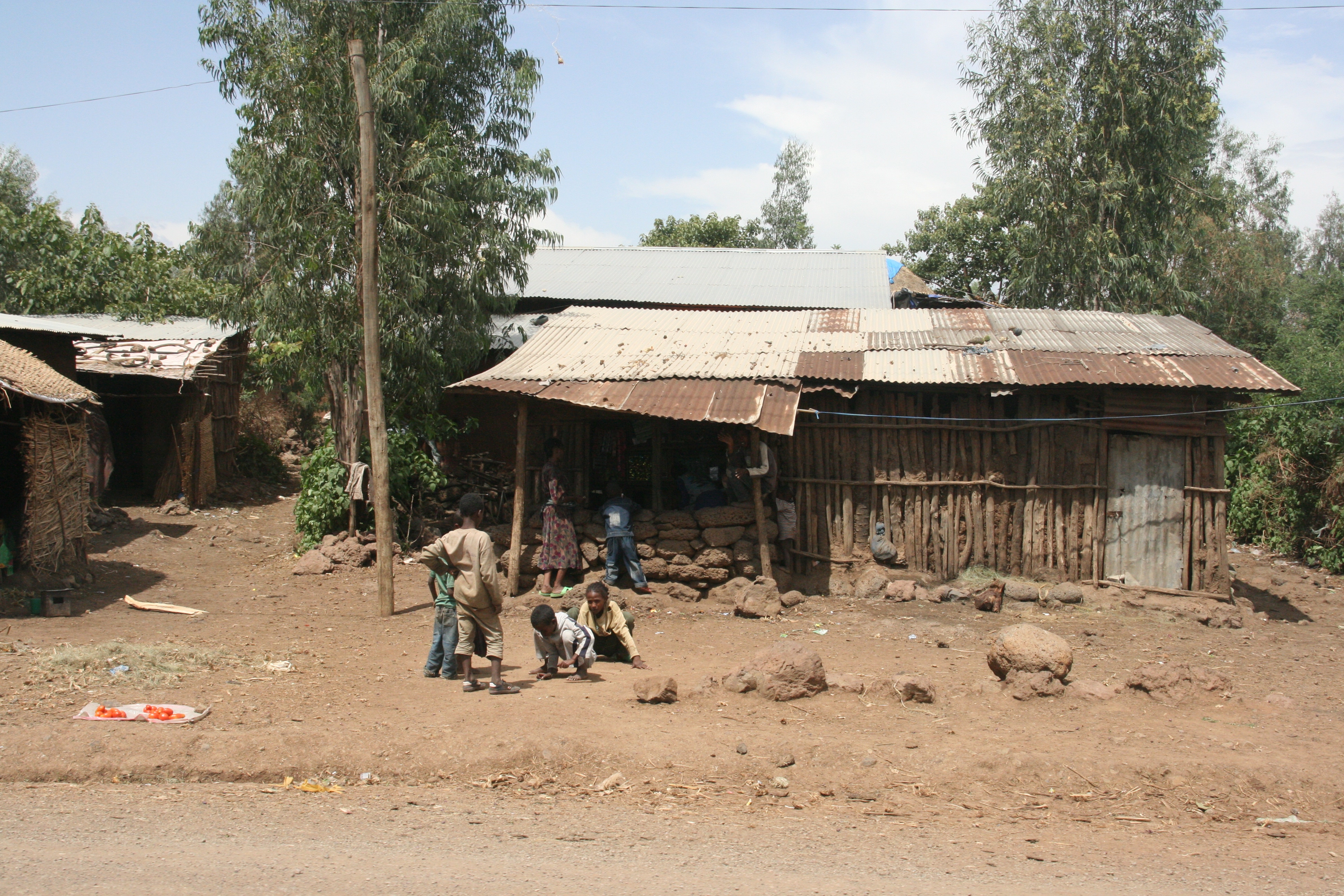 We returned to Bahar Dar the same way that we came, via a one hour boat trip. It was lunch time, so we went to a small local restaurant to enjoy Ethiopia’s national dish, “injera”. Injera tastes better than it looks. The basis of injera is a large, flat, mid-to-dark grey pancake made from Ethiopia’s staple cereal crop, tef. The injera has a slightly bitter, sour taste, and thus goes very well with spicy food that is placed in an assortment on top of the injera. It is eaten with the fingers by tearing off pieces of the injera and wrapping up small pieces of the meat or vegetables that have been served on top of it. Injera looks like a cross between a sheet of dirty latex rubber and a dirty discarded kitchen wash cloth, but Andy and I really enjoyed the one that we shared between us.