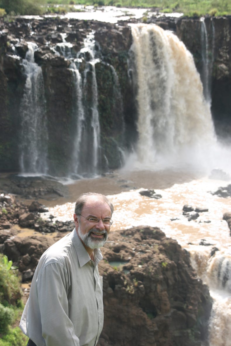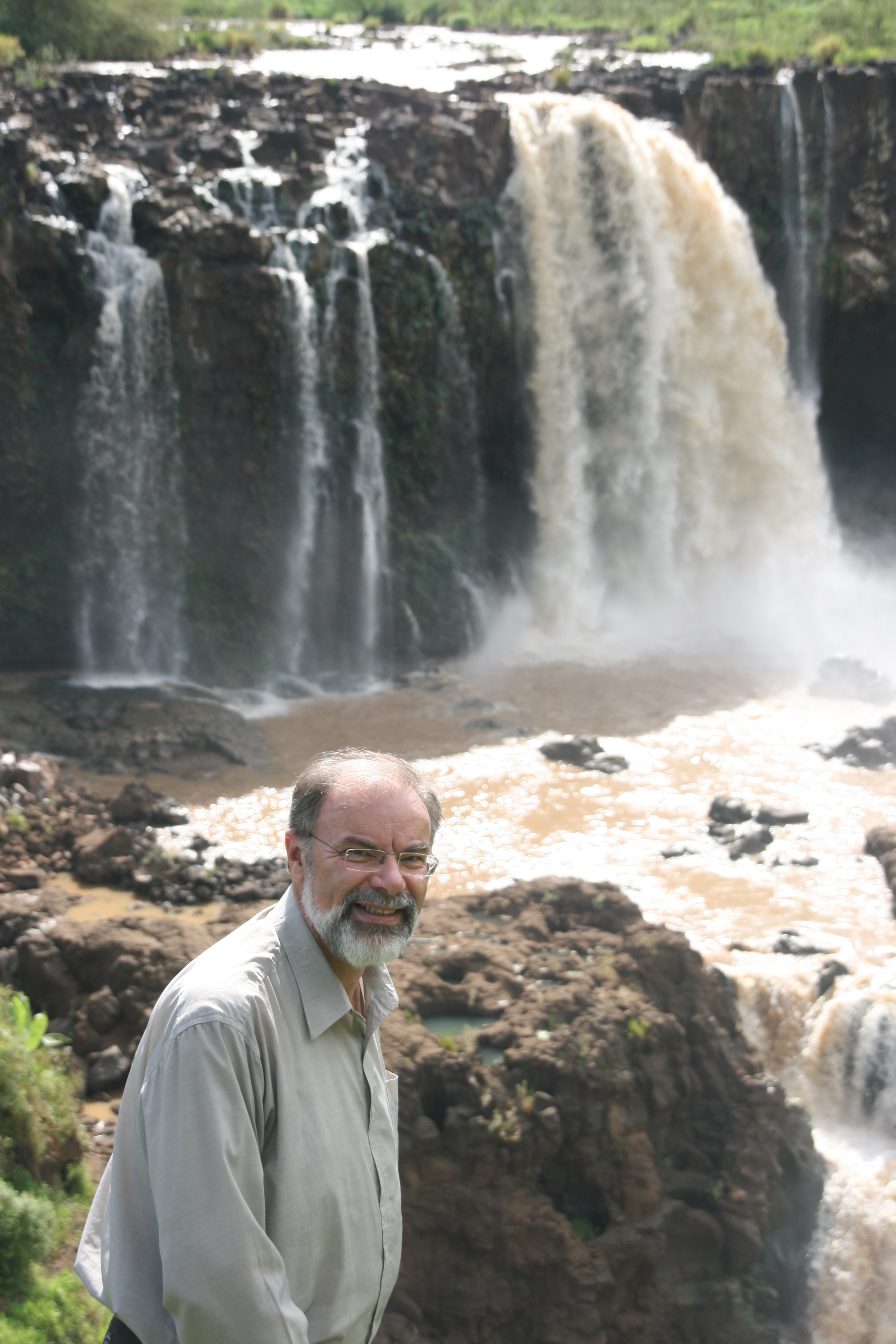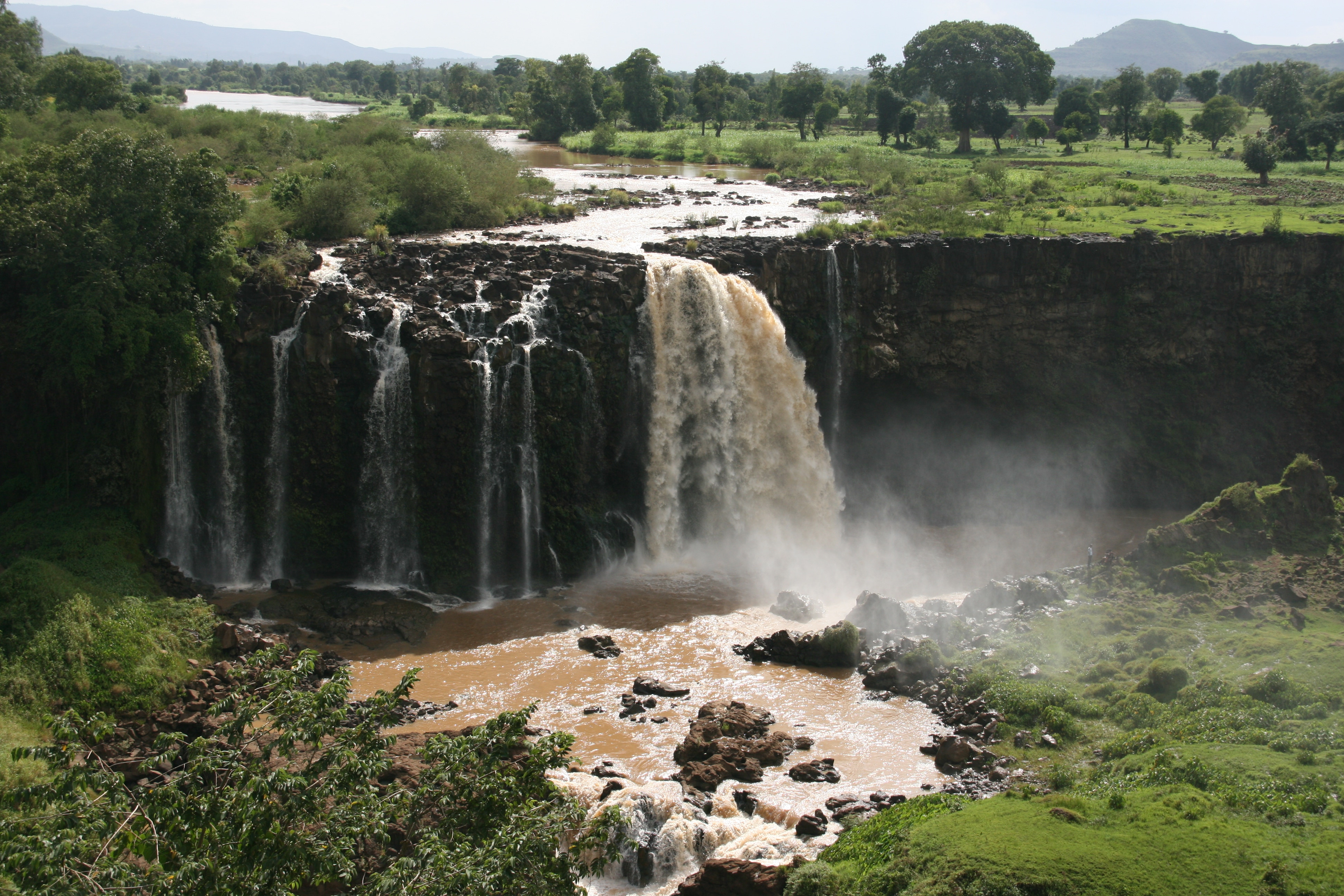 To get to the falls, we got out of the minibus a couple of kilometres of the falls and hiked. First we descended down a steep track and crossed a beautiful stone bridge built in the 17th century by the Portuguese. A climb up the hill on the other side took us through a pretty little village where there was a buzz of building and other activity, before we trekked up and over a hill to the falls themselves. The water in the Blue Nile was anything but blue - it was a bright reddish brown that told a sad story of severe soil erosion somewhere upstream following recent rainfall. With the wet season about to hit Ethiopia, it signalled a serious problem that ought to be addressed as a matter of some urgency.