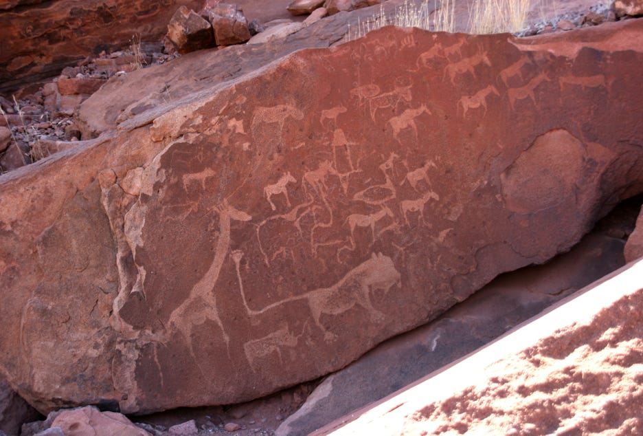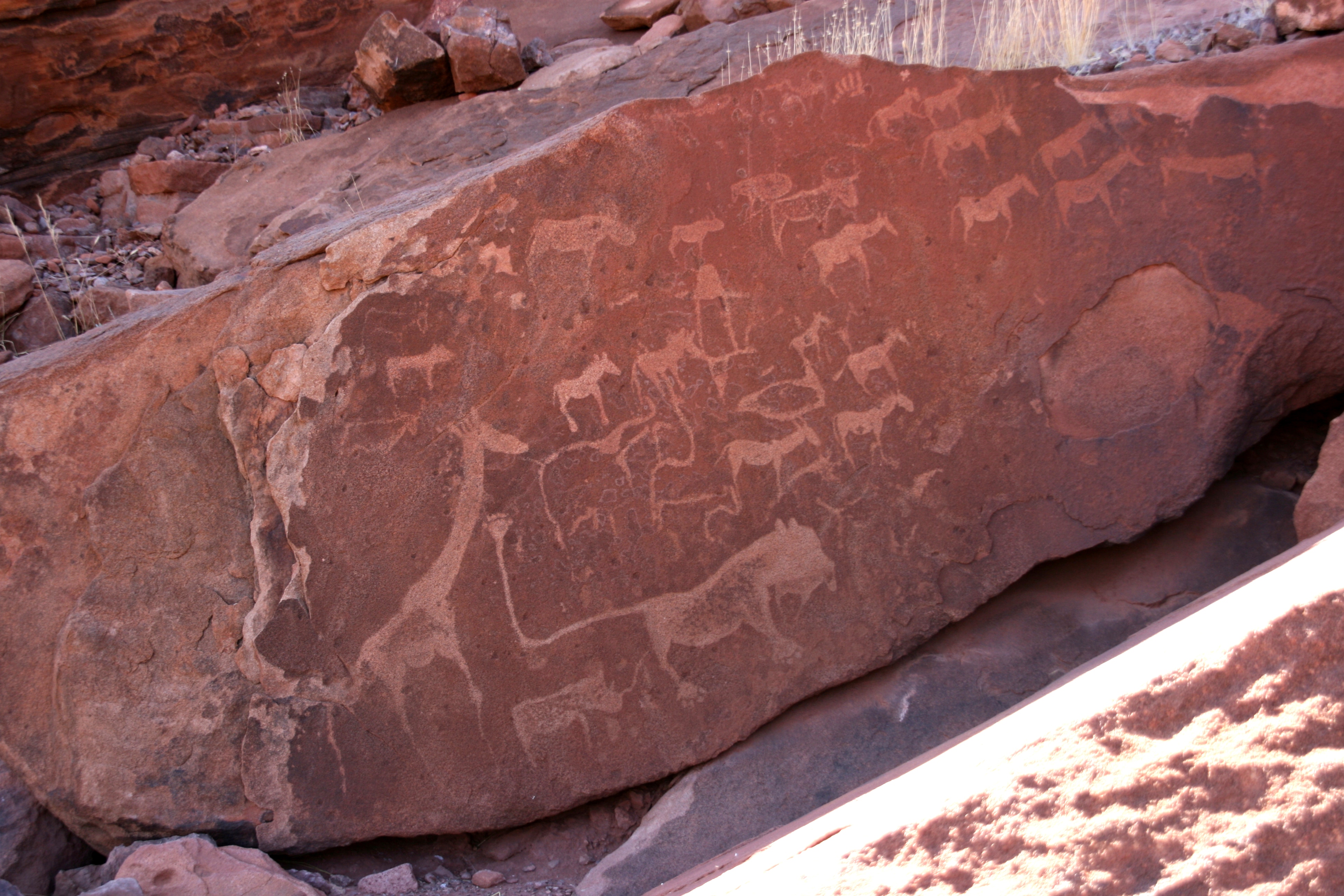 Having helped our driver to maintain his run of bad luck in finding elephants, it was time to see something of Twyfelfontein’s geography, which was actually why I had chosen to include the place in our itinerary. Our first stop was the ancient (6000 years old) rock engravings made by San Bushmen. This was much better than I had expected. There are many boulders with engraved pictures, mostly showing animals with some also showing hands and other details. It is speculated that the engravings were made by Bushmen as teaching tools and to communicate with other Bushmen groups who would come to the area at a later time. In that context, one engraving that especially captured my interest showed a map of waterholes together with the animals that were found there. This must be one of the oldest maps in existence.