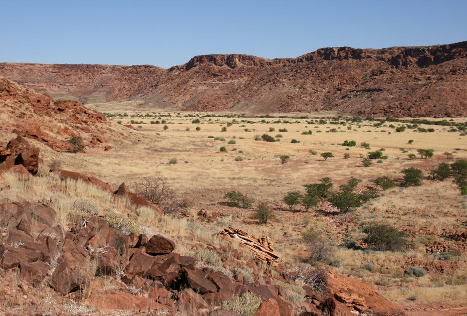 From Burnt Mountain, we embarked on quite a long drive to the Petrified Forest. Actually, the drive was about 50 kilometres longer than it should have been as our driver either mis-read his map or didn’t consult his map, and we headed out of Twyfelfontein quite confidently for about 50 kilometres on the wrong road before he realised the mistake. This necessitated a 46 kilometre drive across the countryside to the correct road, and then a drive back towards Twyfelfontein along that road.