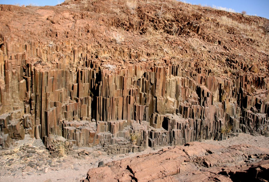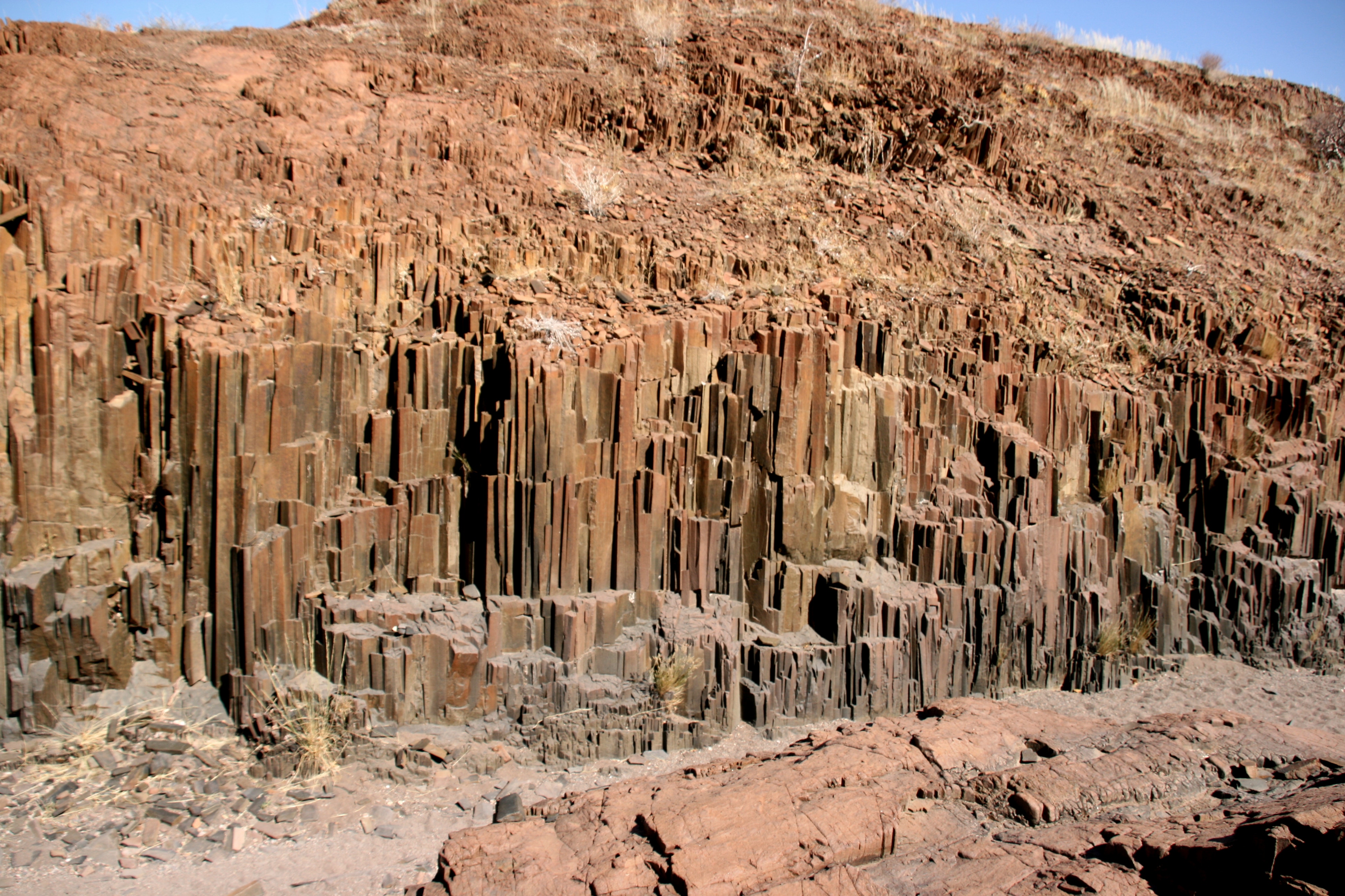 After this fascinating visit to the rock engravings, we drove just a few kilometres to a dry river bed housing a feature known as the Organ Pipes. The steep, almost vertical sides of the valley resemble a pipe organ because they contain thousands of columns that have formed by weathering in the dolerite (coarse grained basalt). It was one of the best and clearest examples I have ever seen on columnar weathering.