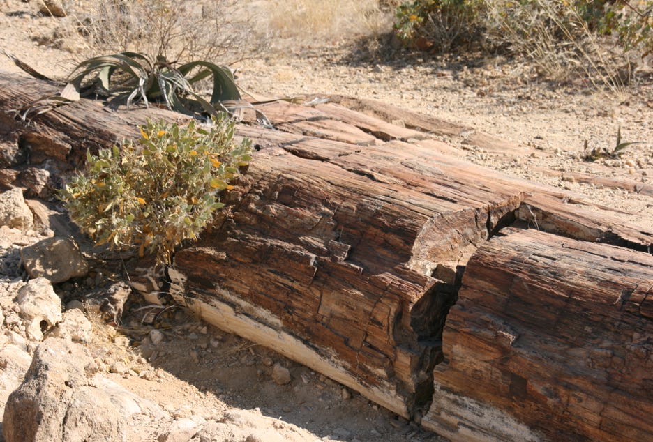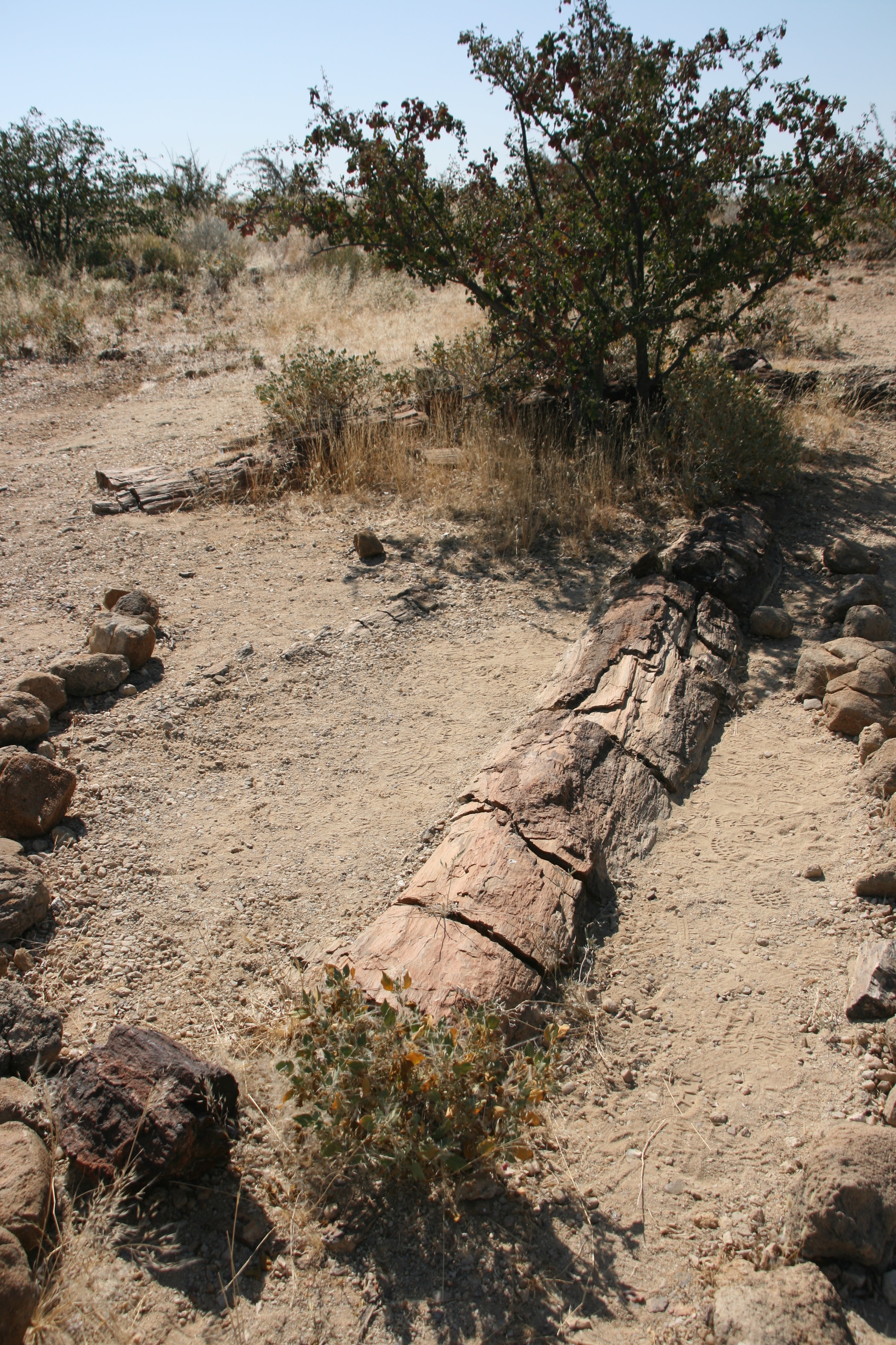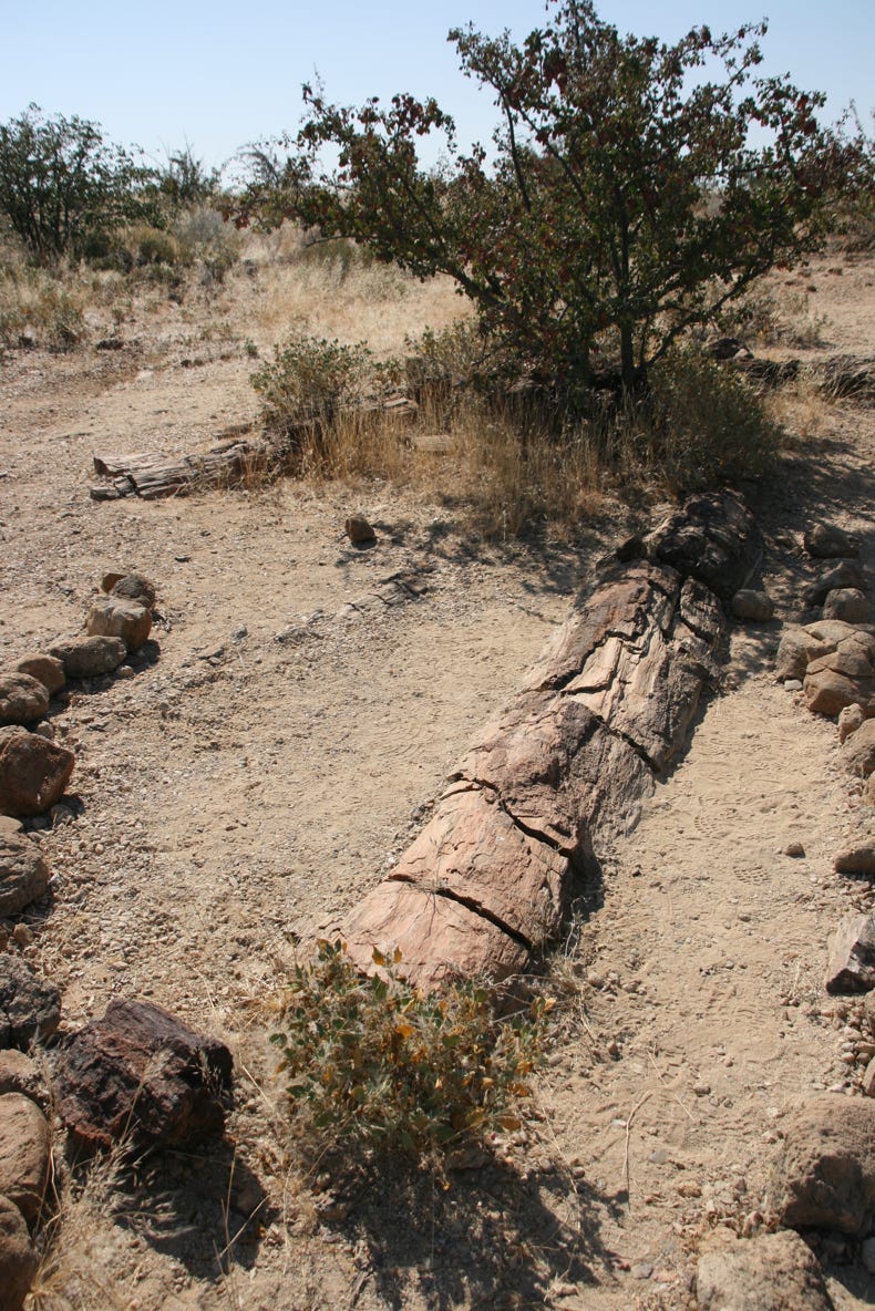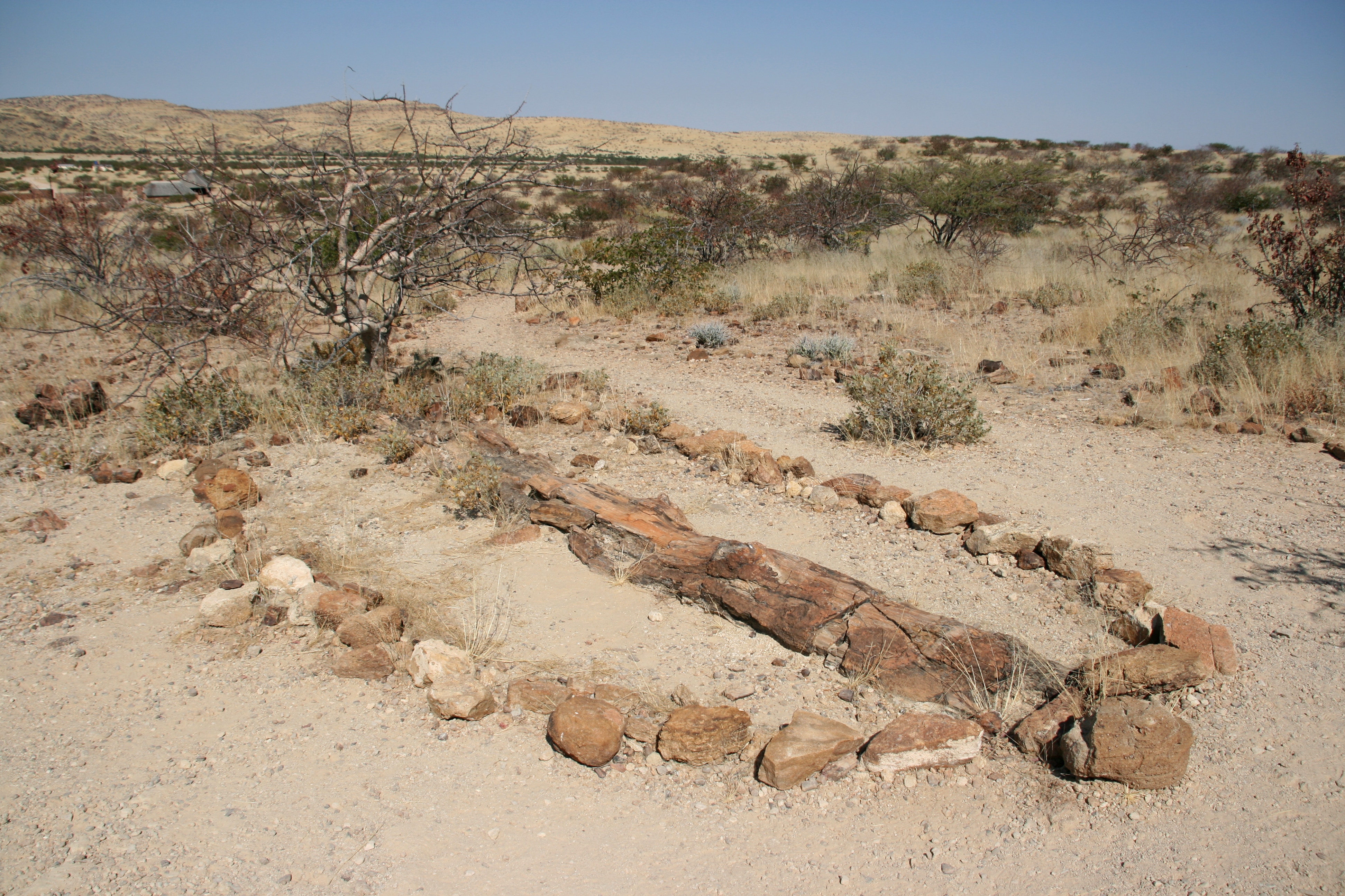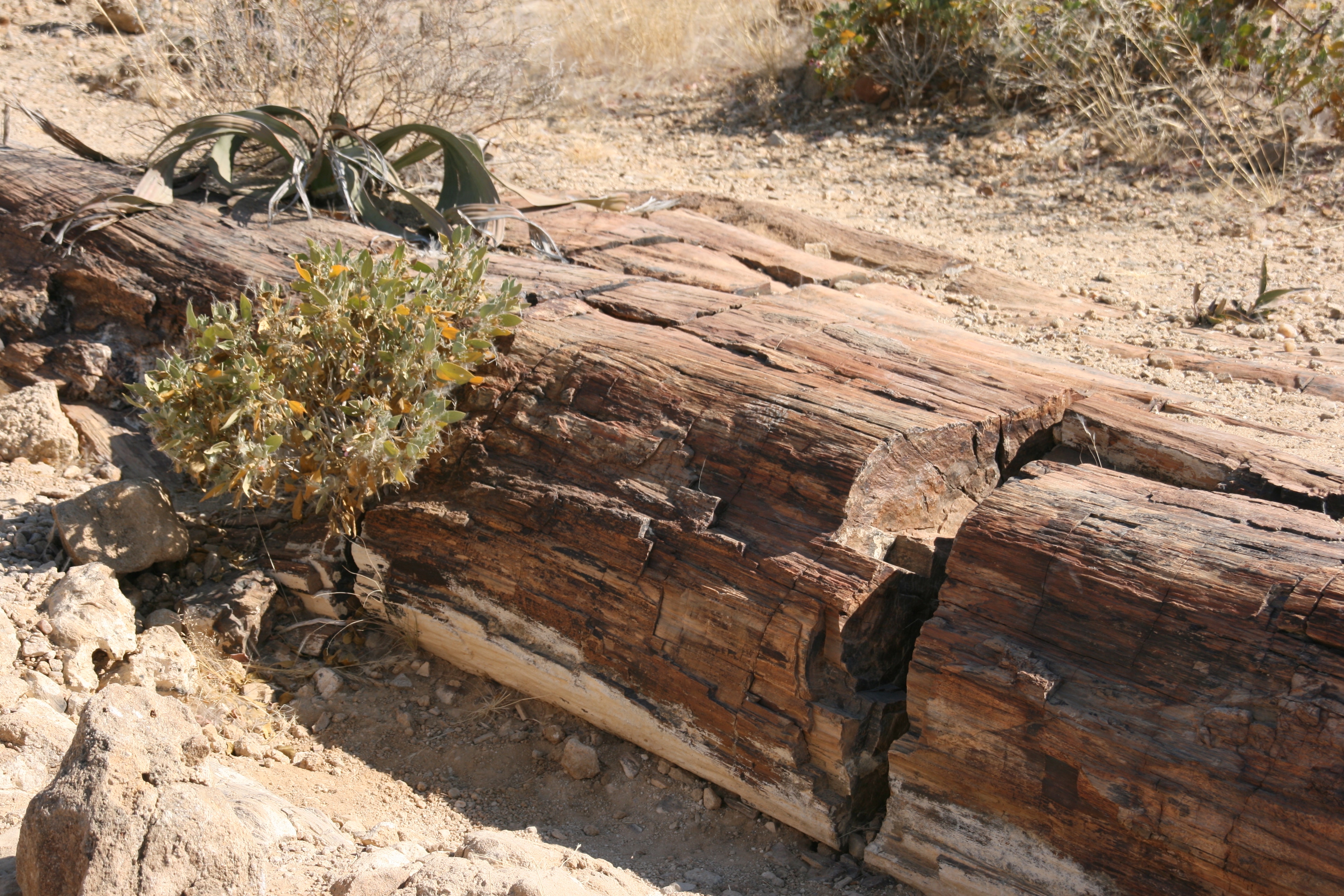 The Petrified Forest was an area of open scrubland that has a large number of petrified tree trunks. The longest log is 45 metres in length, and others are also of considerable size. The area is also covered with the smaller fragments of trees that have been broken up, such as the pieces shown in the photo to the left. The original logs, which were of a type of conifer, were supposed to have been washed down from central Africa in a major flood about 280 million years ago. After the logs arrived in Namibia, they were buried and subjected to extreme heat and pressure which turned the timber into rock. Today, the rocks still resemble timber in appearance, but they are definitely hard as you would expect rocks to be.