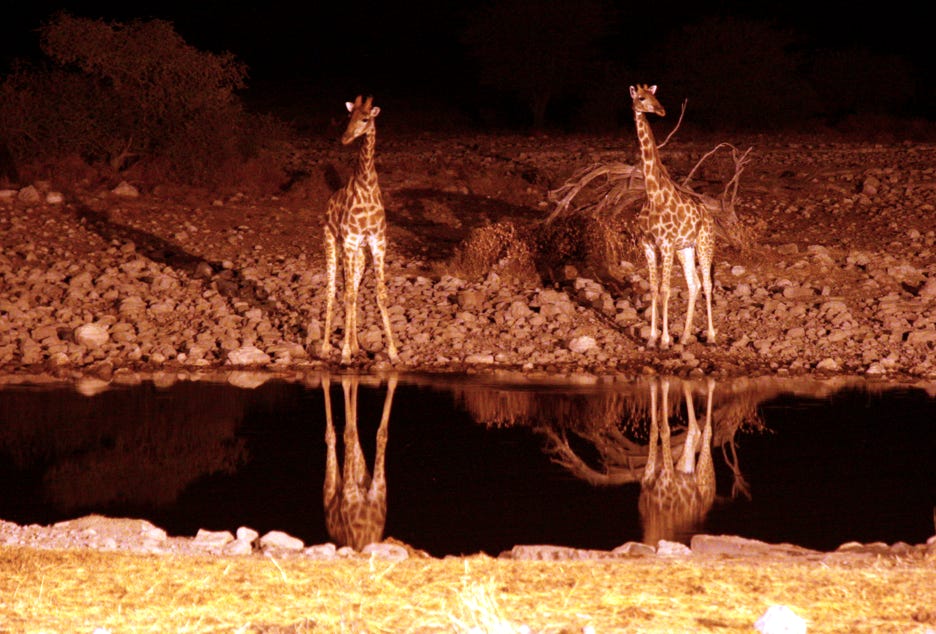 The rest of the journey was completed shortly before sunset, a necessary deadline as the gates to Etosha National Park closed at that time. Our room at the campsite is a recently renovated cabin that is situated only about 30 metres from a floodlit waterhole where animals come and drink after dusk. After settling into our room, Andrew and I paid a first visit to the waterhole, which is when the photo of the giraffes at the top of this page was taken.