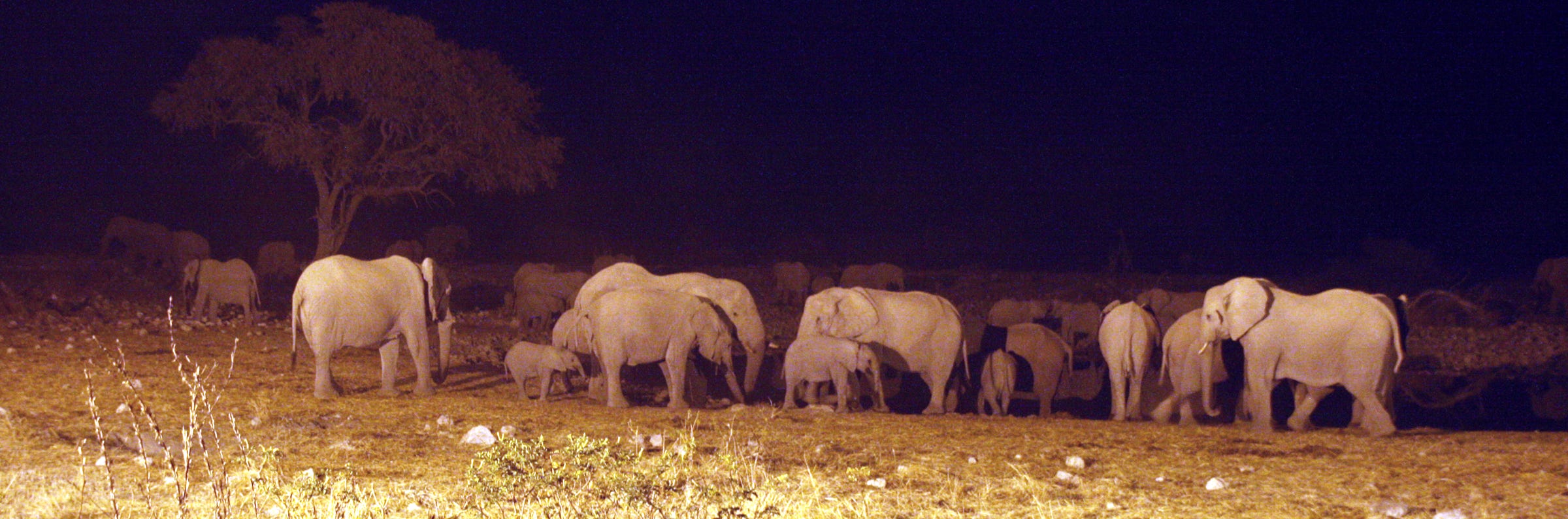 After dinner, we paid a few more visits to the waterhole, and saw springbok, rhinos and elephants coming to drink. Perhaps the highlight was at about 10 pm when a herd of about 35 elephants came to drink. What a fantastic experience, to watch a herd of elephants plus about three rhinos drinking simultaneously, all the time with a solitary jackal wandering about - just a few tens of metres from where we would sleep for the night. Simply magic!