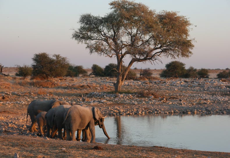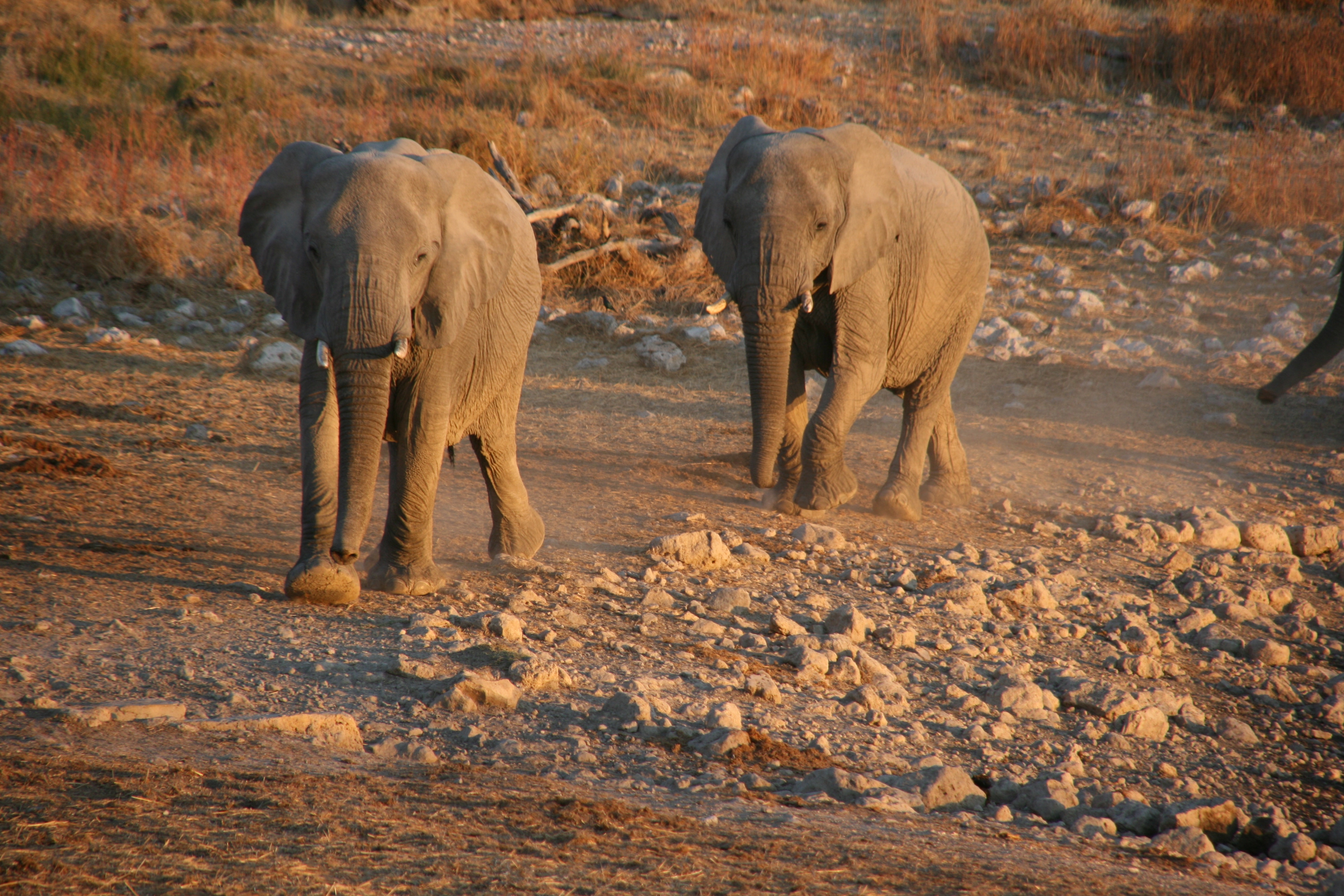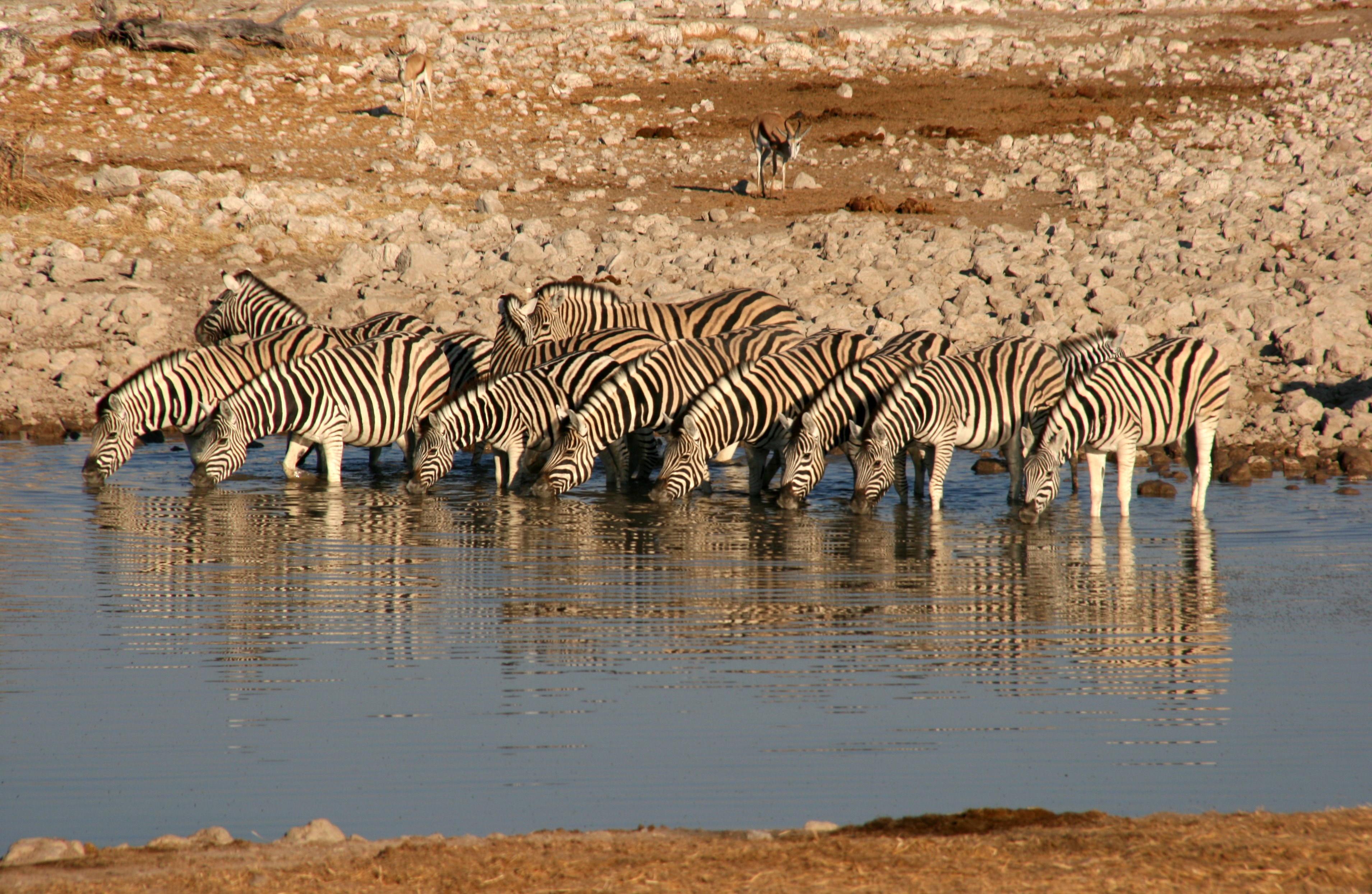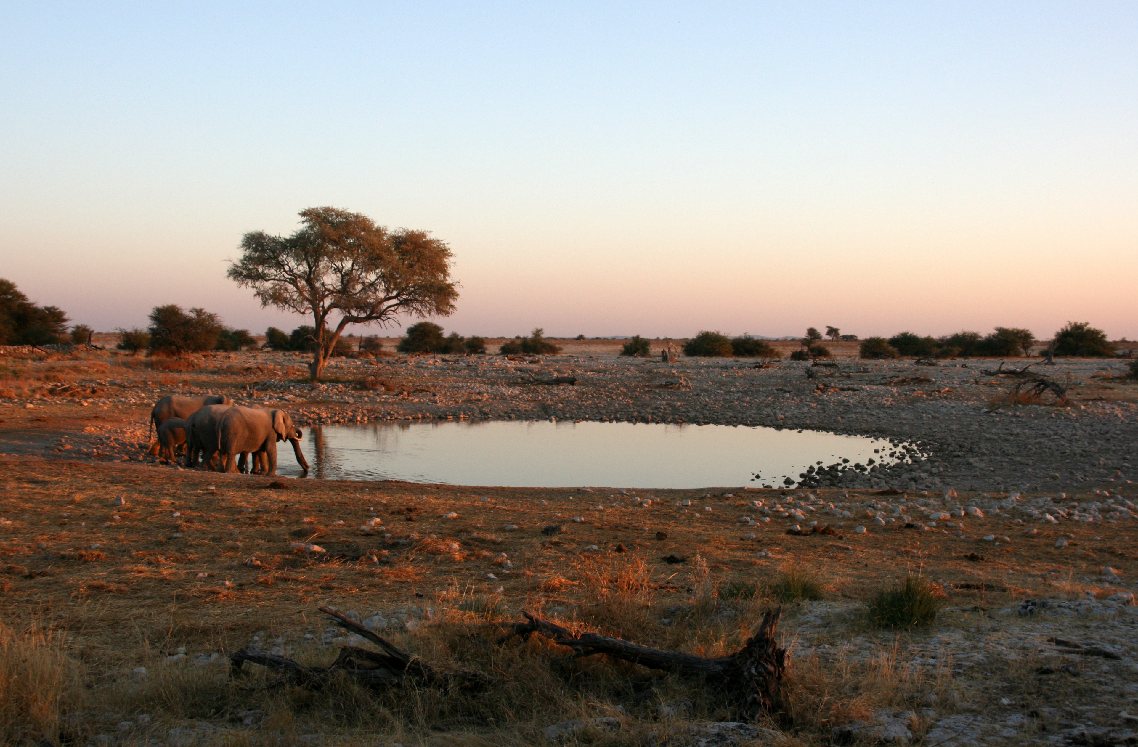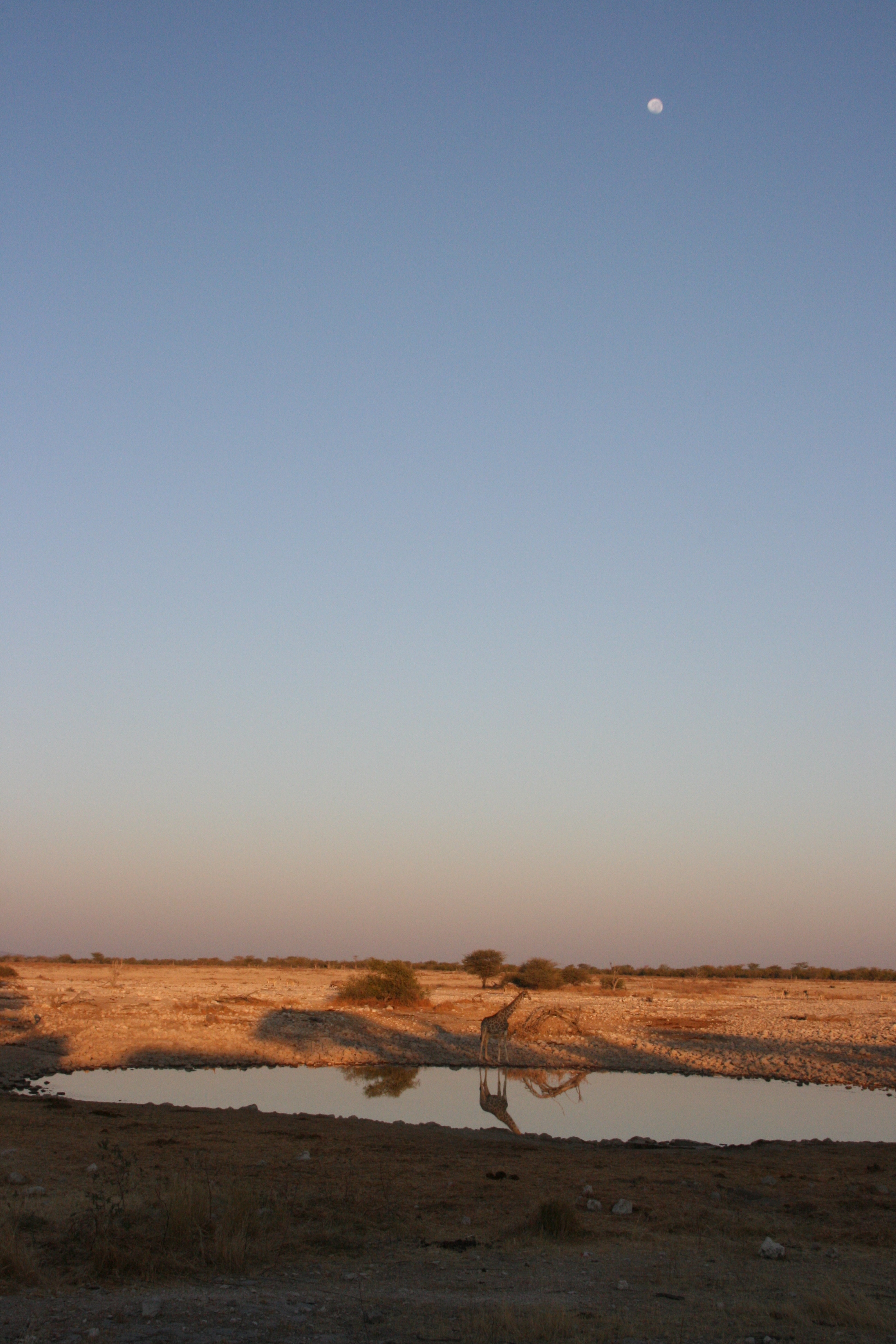I know that the place names will not mean anything to anyone who has never visited Etosha, but from our campsite at Okaukuejo, we drove north to the waterhole at Okondeka, then south-west to the waterhole at Leeubron, and then back through Okaukuejo and east past waterholes at Nebrowni, Gemsbokvlakte, Olifantsbad and Aus before driving further east to the campsite and waterhole at Halali. Our driver told us that he had studied the typical movements of animals in Etosha and that we could expect to see a herd of elephants at Halali. Sadly, the elephants hadn’t bothered to check their arrangements with our driver, and the only animal at Halali was a sole oryx. We had a picnic lunch in the shade overlooking the waterhole, and then started heading back to Okaukuejo via waterholes at Nuamses and Rietfontein, the latter waterhole containing a pride of eight lions. We reached Okaukuejo about half an hour before sunset, which gave us the opportunity to watch a small herd of seven elephants come and drink from the waterhole near our cabin in the golden glow of the late afternoon sunlight.