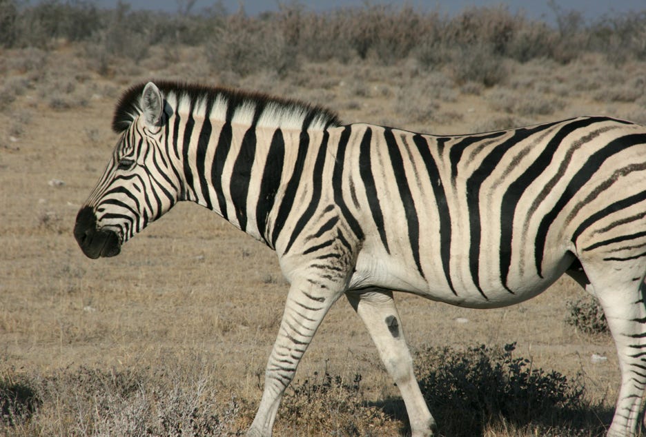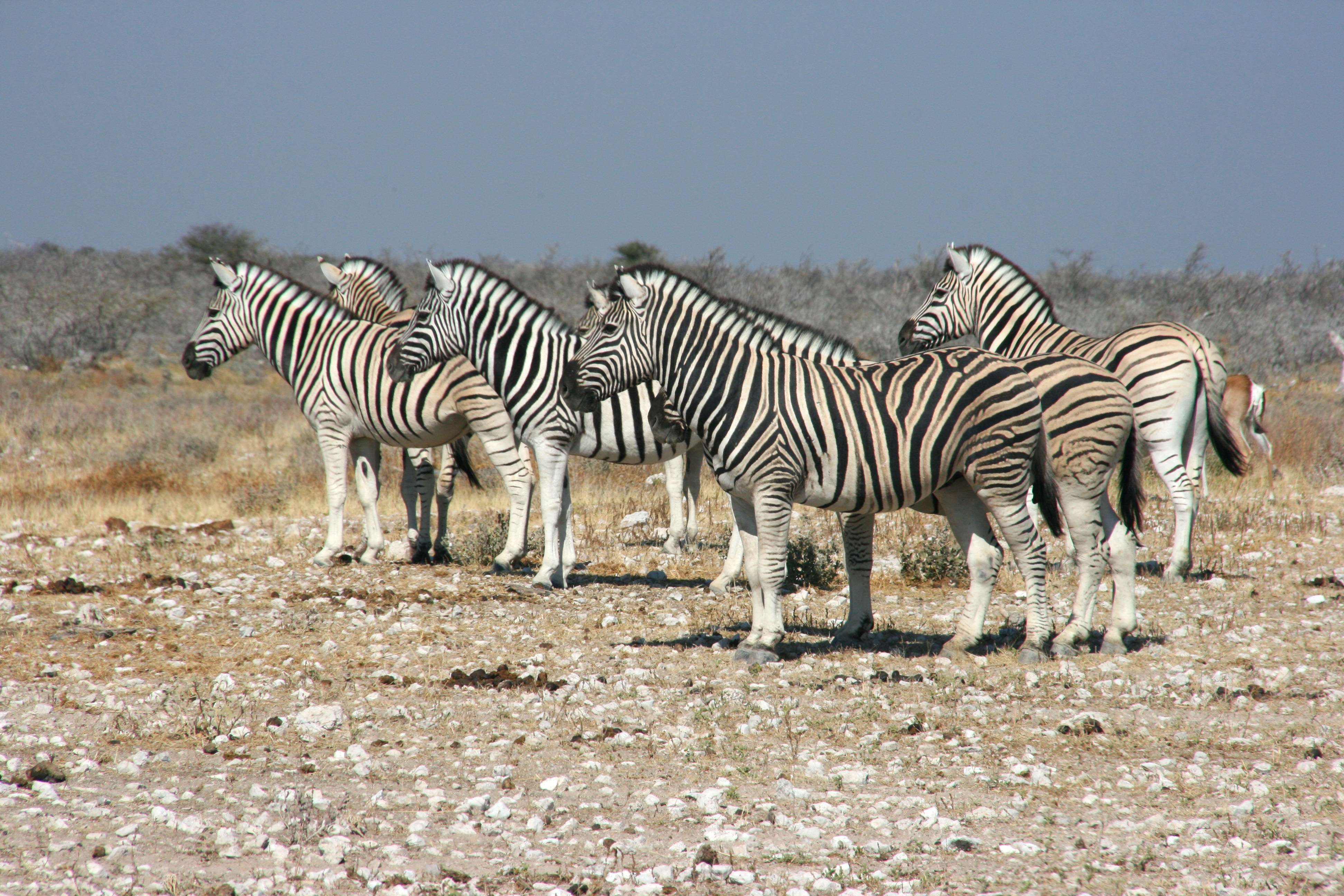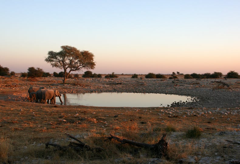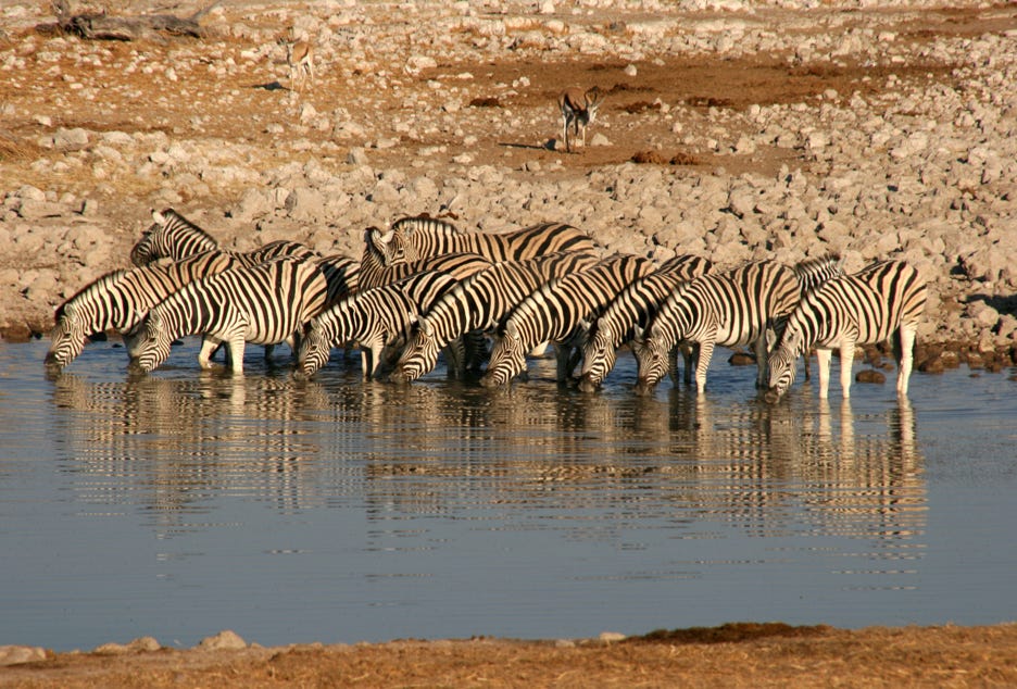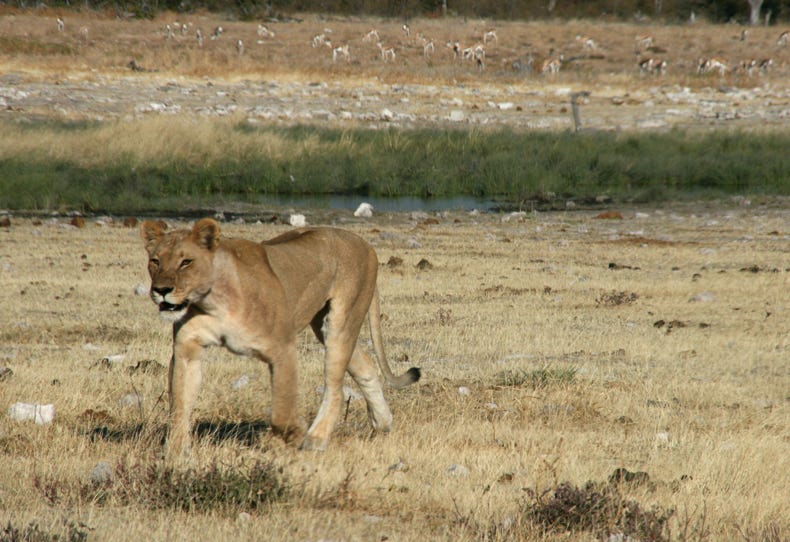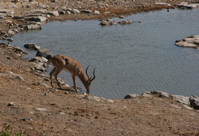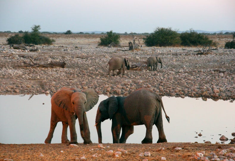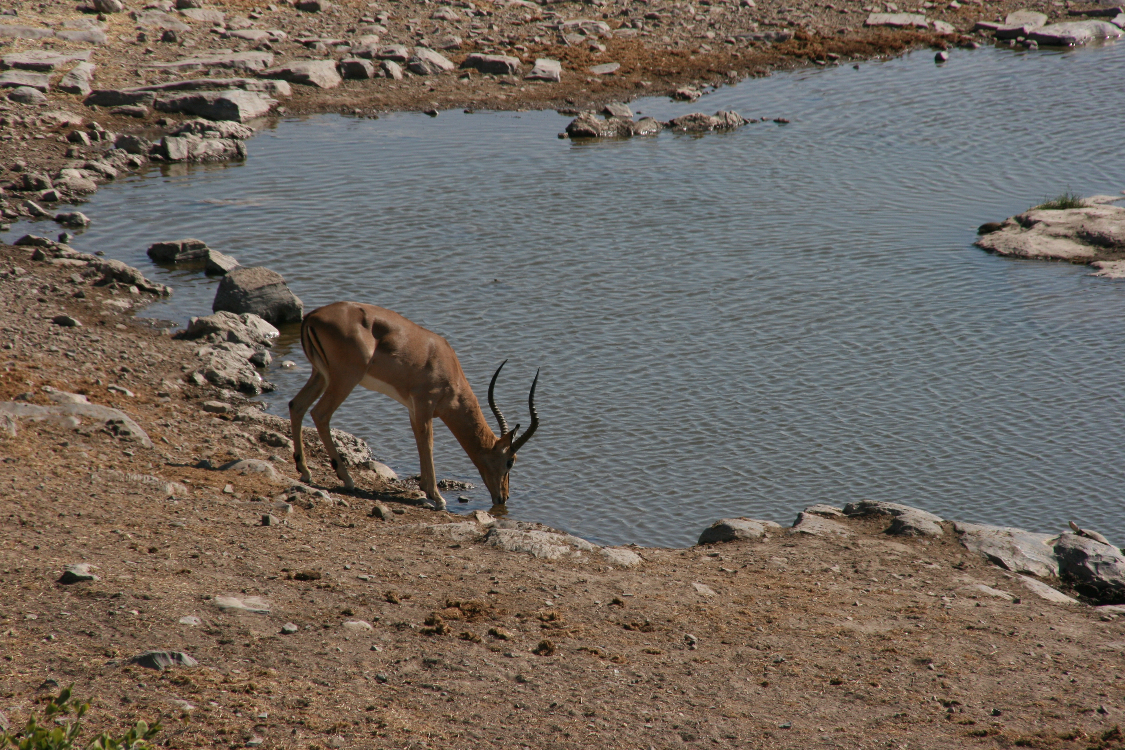 I know that the place names will not mean anything to anyone who has never visited Etosha, but from our campsite at Okaukuejo, we drove north to the waterhole at Okondeka, then south-west to the waterhole at Leeubron, and then back through Okaukuejo and east past waterholes at Nebrowni, Gemsbokvlakte, Olifantsbad and Aus before driving further east to the campsite and waterhole at Halali. Our driver told us that he had studied the typical movements of animals in Etosha and that we could expect to see a herd of elephants at Halali. Sadly, the elephants hadn’t bothered to check their arrangements with our driver, and the only animal at Halali was a sole oryx. We had a picnic lunch in the shade overlooking the waterhole, and then started heading back to Okaukuejo via waterholes at Nuamses and Rietfontein, the latter waterhole containing a pride of eight lions. We reached Okaukuejo about half an hour before sunset, which gave us the opportunity to watch a small herd of seven elephants come and drink from the waterhole near our cabin in the golden glow of the late afternoon sunlight.
