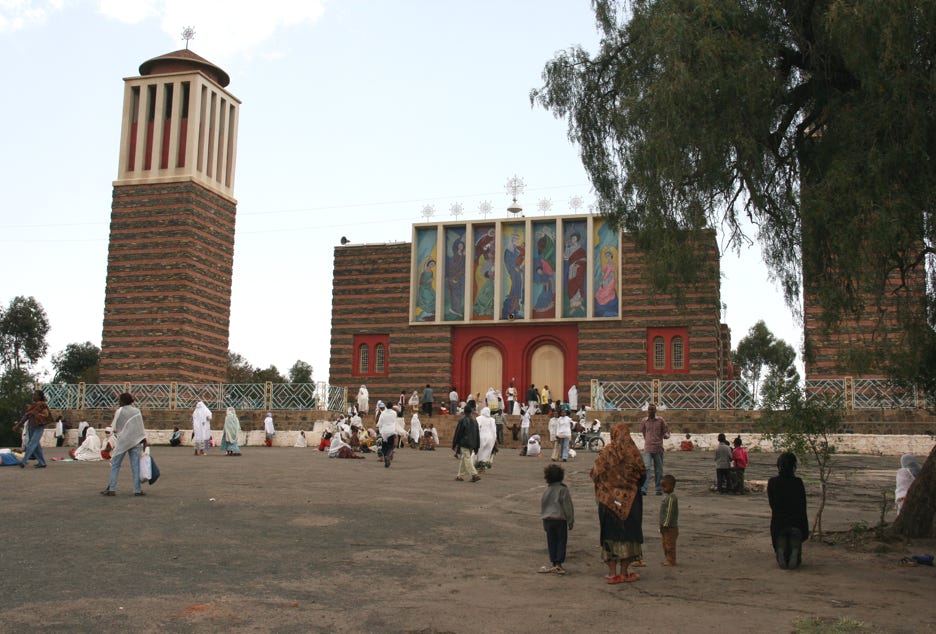 Our aim today was to explore Asmara, and for this purpose we had arranged for a driver and his little yellow taxi to take us around. My initial impressions of Asmara were that it was a kind of African version of Adelaide – clean, orderly, slow (in fact, very slow), wide streets, well laid-out, and low-rise. Many of the buildings had been constructed by the Italian Fascists during the 1930s and 1940s, often in art-deco style, and although sometimes crumbling and lacking maintenance, they combined to make a very elegant city.