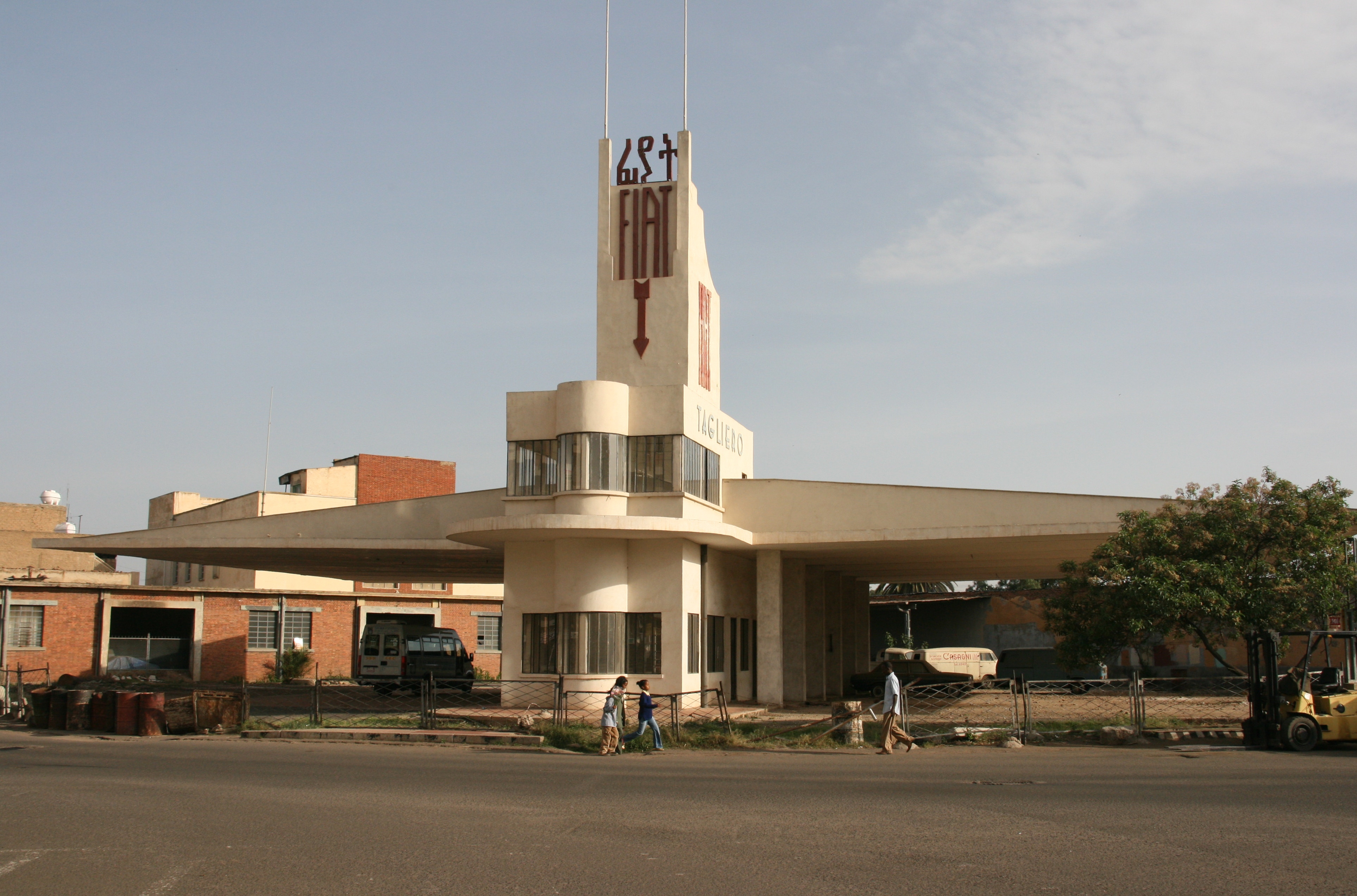 Perhaps Asmara’s most famous art deco landmark is the Fiat Tagliero Building (see today’s top photo). The Lonely Planet guide expresses its significance within Asmara’s architectural wonders with the sentence “Don’t even think of leaving town until you’ve seen the Fiat Tagliero Building”, adding that it is “perhaps the most outstanding (building) in Asmara”. The cynical might claim that this is indeed an accurate statement, and one that says more about Asmara in general than the Fiat Building itself. It was built in 1938 and is designed to look like an aircraft, with the central tower resembling a cockpit and the two huge unsupported awnings resembling wings. Almost next door was another of Asmara’s top art deco buildings, the Irga Building, which is regarded as being so outstanding that it features on many postcards of Asmara.