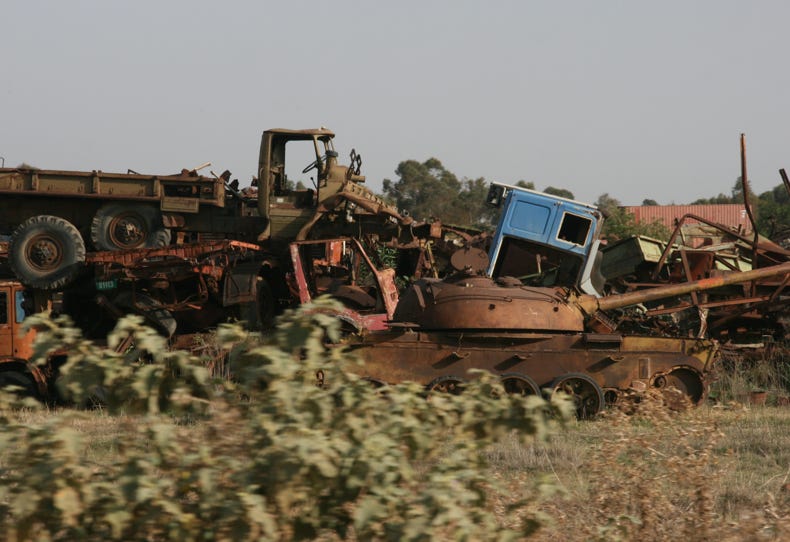 After driving past a huge scrapyard of vehicles and machinery destroyed during the war of independence with Ethiopia, we arrived at the airport, as expected, at a little after 8:00 am. The two hours we allowed for check-in were sufficient, and happily the bureaucratic processes involved with departing, while still excessive, took a fraction of the time of the processes we had encountered upon arrival. Still, four separate people were involved in the stamping and inspection of passports, a new set of currency declaration forms had to be duly completed (but were never looked at), and the security inspection included turning on laptop computers, taking off shoes and belts, and so on.