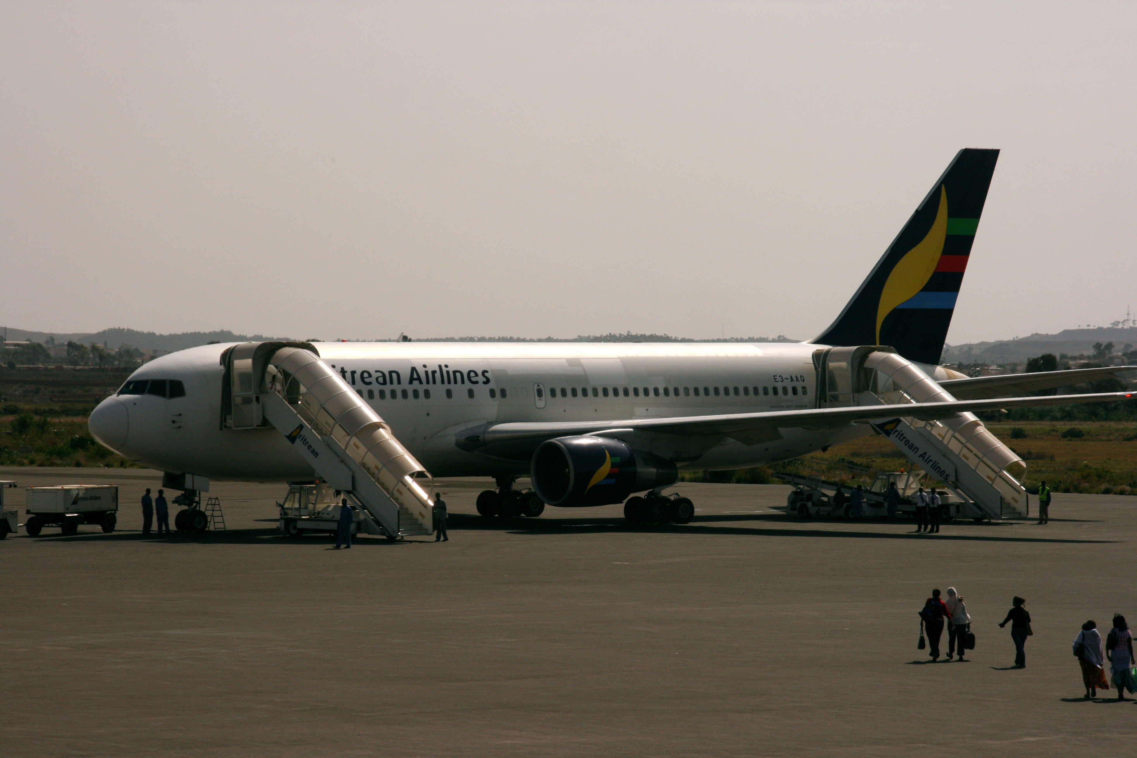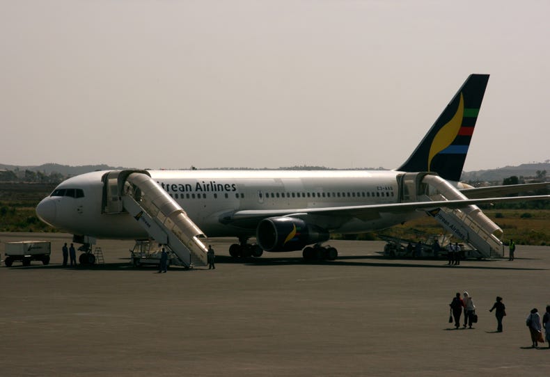The flight from Asmara to Dubai was on a very old Boeing 767-200 operated by Eritrean Airlines. The plane had a very patchy paint job that didn’t really inspire confidence, and although the angle of lighting at the time wasn’t great, you may be able to see what I mean if you click the picture of the plane shown below. Not only was the plane very old, but it was also very full, highlighting Andrew’s and my good fortune in securing seats out of Eritrea.