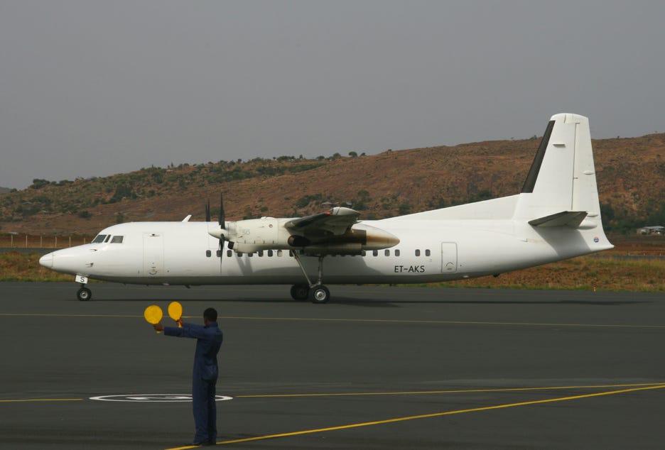 Today was not a day of sightseeing, but of travel and catching up with things. We woke in Axum to the alarm at 5:30 am, and after an excellent breakfast, went to the airport by bus to catch our flight to Addis Ababa. We were scheduled to get a direct flight in a Boeing 737 jet, but the low passenger numbers meant that we were allocated a much smaller and slower Fokker F- 50, and instead of a direct routing, we flew via Gonder to pick up some extra passengers.