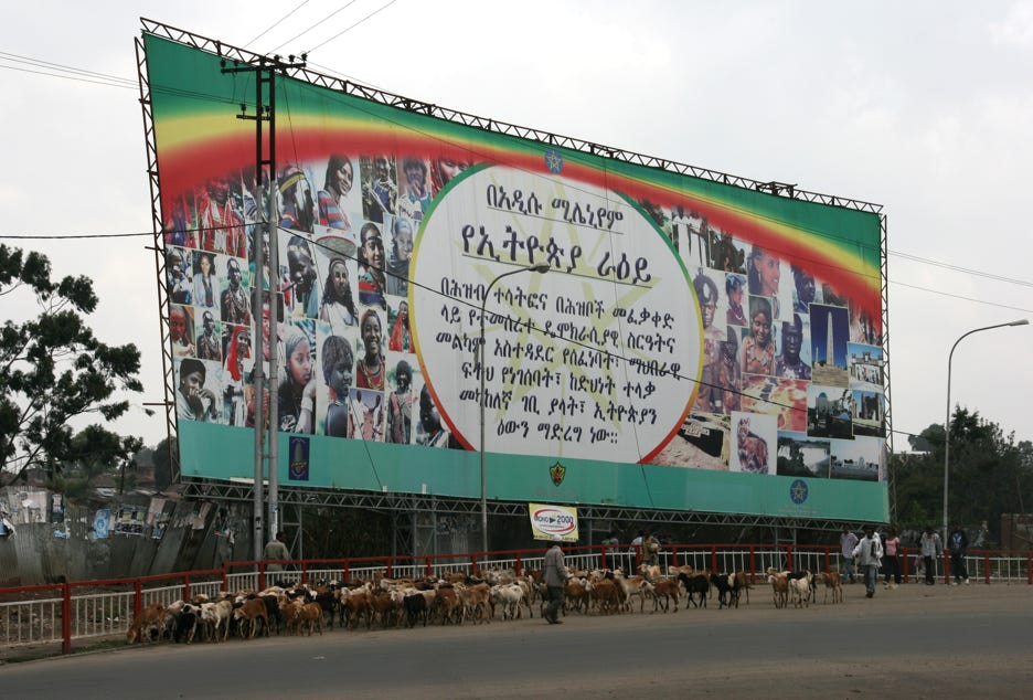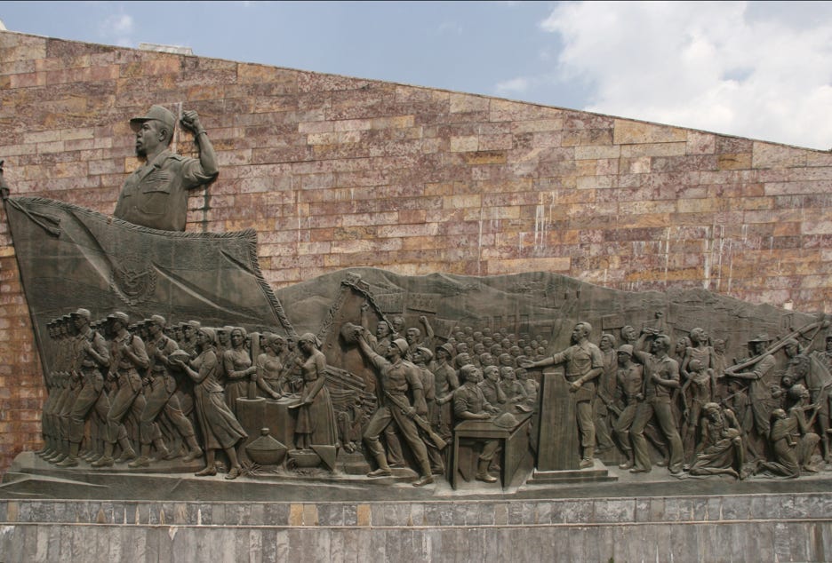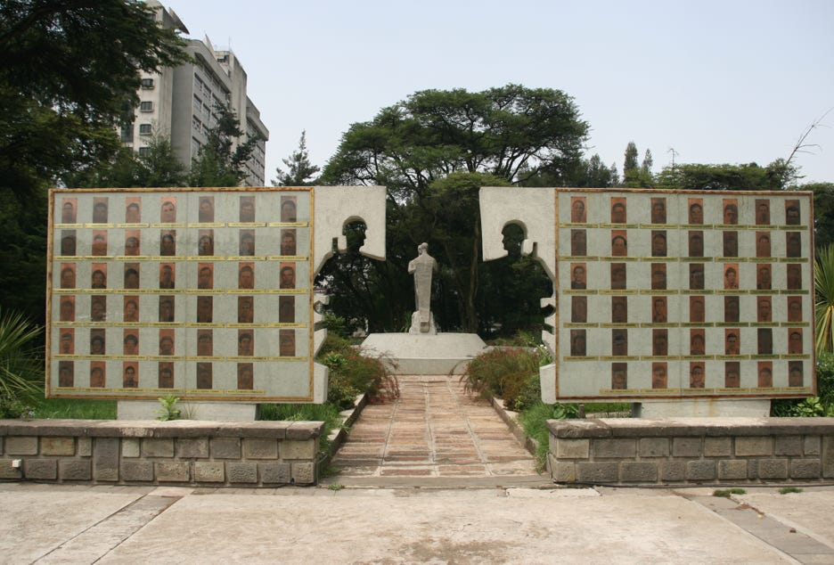 From Meksal Square, we walked a little more than half a kilometre along Ras Desta Damtew Street to the Derg Monument. We had visited this area briefly last week, but this time with the sun shining, we entered the park that contained the monument. This park looked like something uplifted from North Korea or East Germany, and was a memorial to Ethiopia’s painful socialist era following the overthrow of Emperor Haile Selassie in 1974 until 1991. This era coincided with a period of war with Somalia, a tragic drought and famine, war with the separatist movement in Eritrea and a series of failed policies to promote rural collectivisation.