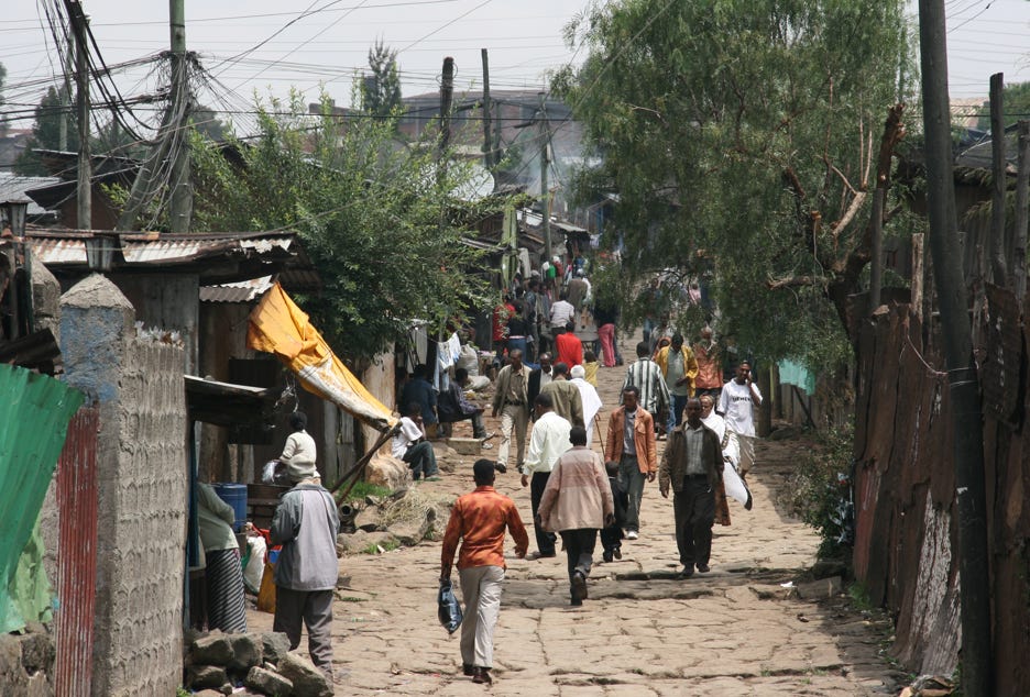 Our third destination was a further one kilometre walk from the Derg Monument, and we approached it with some trepidation. We were heading to the area known as Merkato, a crowded zone of markets, shanty housing and narrow laneways whose mere mention always brought the comment “Be Careful!”. The area is famous for its pick-pocketing, and several people had warned us to leave all our valuables behind before going there (which I did), to be on guard, and to enter only in the company of another person, and so on. I had read about scams where a person does something to cause alarm, and while you are recovering from the surprise, his friends have bumped into you and emptied your pockets. I had read about another scam where a local person squirts liquid manure on your shoes as you walk through, and then in the resulting confusion, removes your valuables before showing you to his friend who runs a shoe cleaning business.
