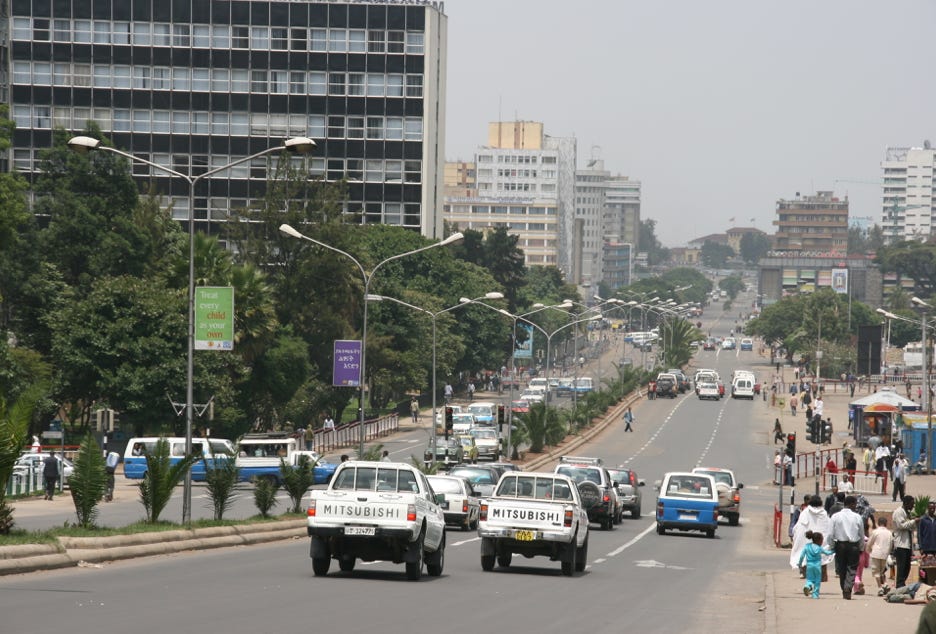 Having finished washing the clothes, we decided to use the sunny weather to explore Addis Ababa on foot. We resolved to try and see four places before the inevitable afternoon rains began, and we almost met our target. First stop was Meksal Square, situated just a couple of hundred metres from the hotel. This was the same square with the 16-lane road through the middle that we had been exploring last week when the heavy rains began, and we wanted to see it more fully than last week’s weather permitted. It was also the same place where yesterday’s photo of the grotesque dove in overcast conditions was taken. The experience this morning was quite different, with clear sunny weather, bright lighting, and lots of activity with children playing football on the paved surface, together with throngs of people walking, sitting, jogging, and simply enjoying the sunshine.