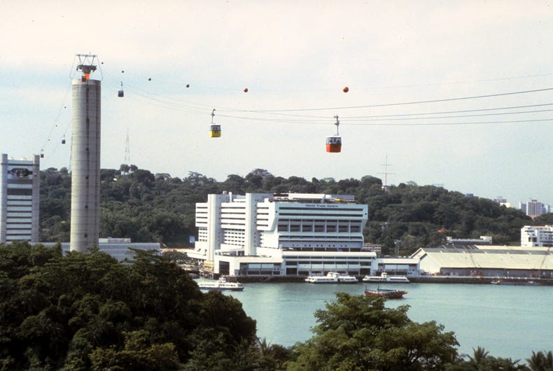 After lunch at Lucky Plaza, the group travelled by ferry to Sentosa Inland, travelled around the island by monorail, and returned to Singapore island by cable car. Upon return to Mount Faber, we experienced the only real mishap in travel arrangements during the entire trip when the Archipelago Travel bus failed to meet us. Repeated phone calls failed to locate the problem (or the bus and its driver), and the group had to be returned to the YMCA by a fleet of taxis and minibuses. The evening was left free for shopping and resting.