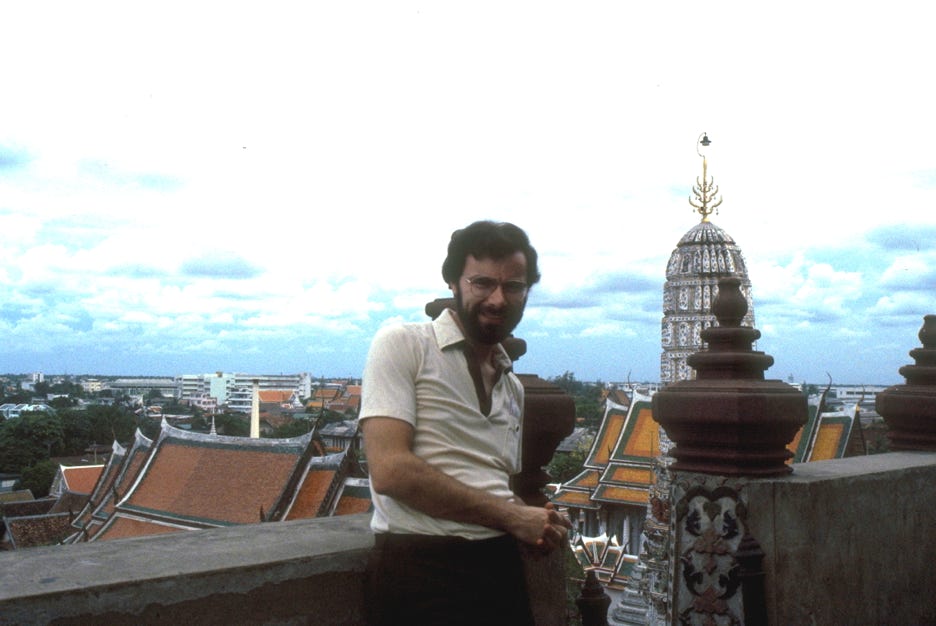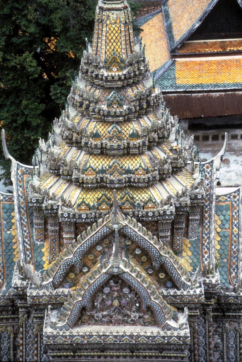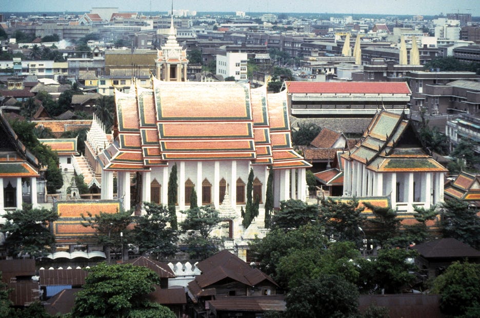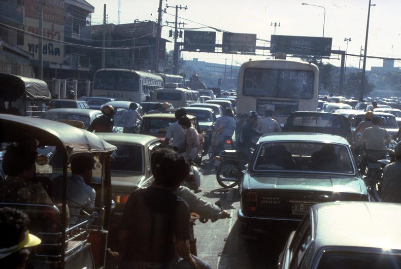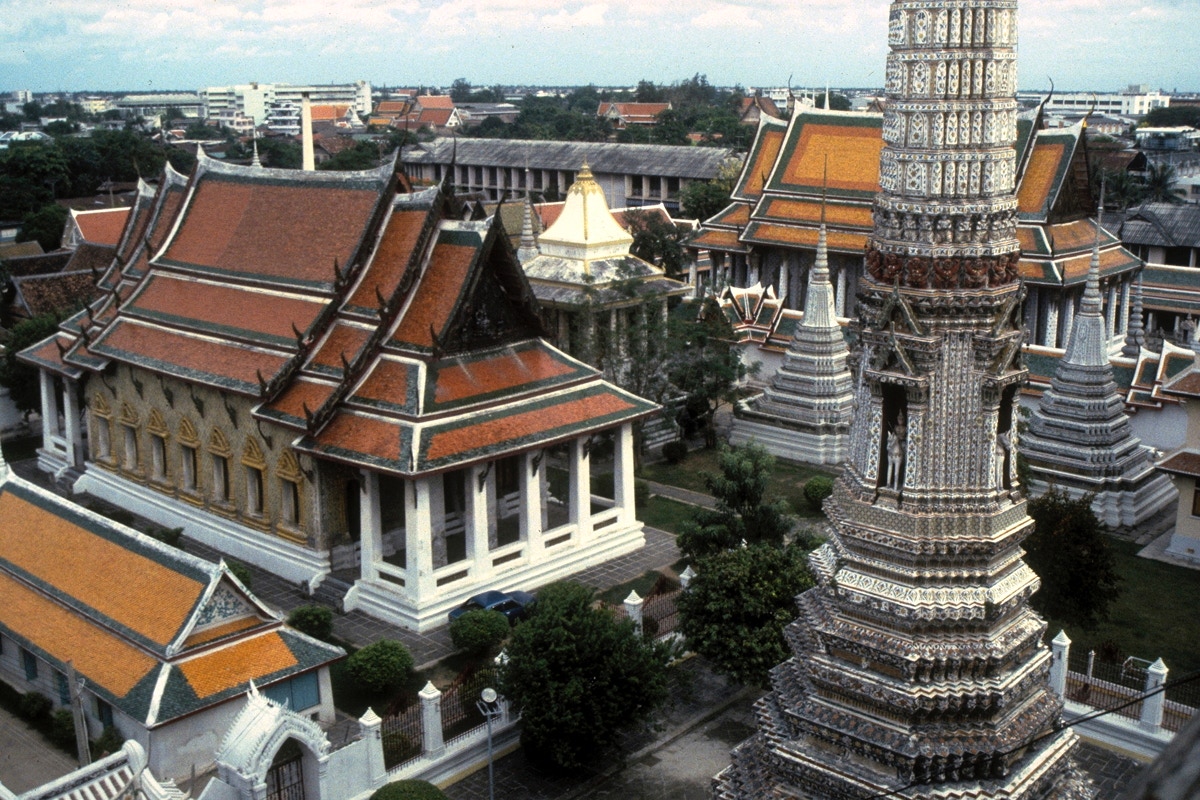 By this stage, we were beginning to realise the truth of the Insight Guide to Thailand’s observations on Bangkok: “Some cities are easy: after only a few days you have a clear sense of their design, their personality, and you do not hesitate to set out boldly on explorations. Others are less accessible: they sprawl, they are confusing, and they seem to have not one but a dozen personalities, often contrary. Almost every visitor without exception would put Bangkok in this second category. For this metropolis of over five million appears at first glance to be a bewildering conglomeration of new and old, East and West, serenity and chaos, the exotic and the commonplace – all thrown together haphazardly into a gigantic urban stew following no apparent recipe… You can stand at one moment in a hushed temple courtyard, lulled by the rhythmic chanting of priests and the silvery tinkle of bells, and at the next, risk life and limb crossing a street down which hurtles some of the most lethal traffic in Asia.”