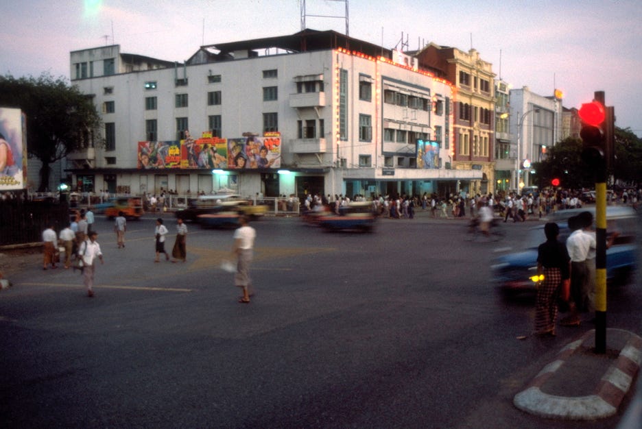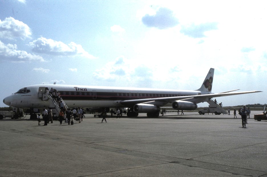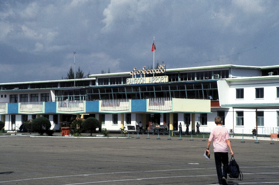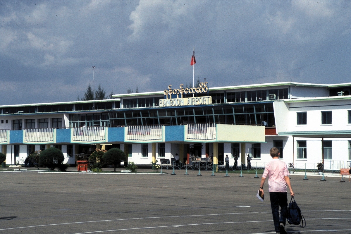 After a flight of only an hour or so, our DC-8 pulled up in front of an old terminal building in Rangoon bearing a plaque that said it had been built in 1947 by the Calcutta Metropolitan Airports Authority, as an independence gift from the British when Burma gained its independence from British India. The interior of the building had obviously been designed for the climate of Manchester rather than tropical Rangoon, and there was no air conditioning, not that it would have made any difference because the daily afternoon power cut was in force.