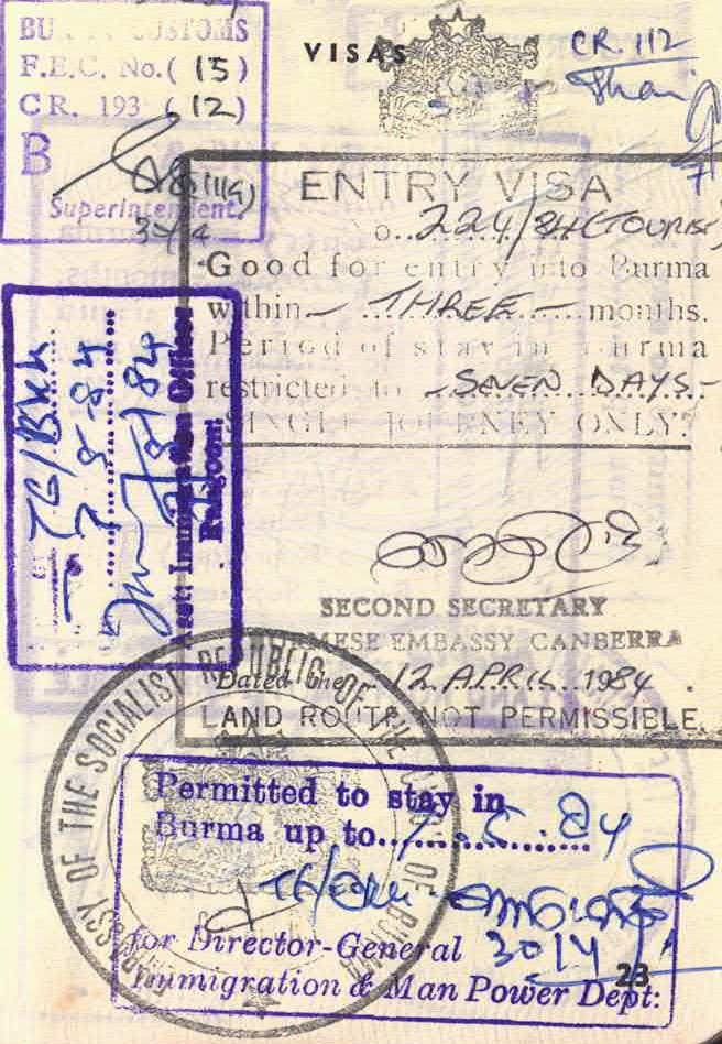We had to pass through quite a number more desks and officers, because the quantity of paperwork to enter Burma is enormous. The customs sheet required arrivals not only to indicate how much cash they had in each currency, but any valuable item such as a camera or jewellery, and even required a statement on the number of rolls of toilet paper, cakes of soap and sticks of deodorant the person had, which was an ominous sign of severe shortages of these things to come during our stay in Burma. Most of the officials asked something like “do you have a small gift for me?” or “may I have my favour now please?”. I gestured towards the senior officer and indicated that we had already given him a small favour. Most of them nodded and proceeded to process our documents, although one went over to the senior officer, who looked across at us, nodded, and indicated for the junior official to continue working with us.