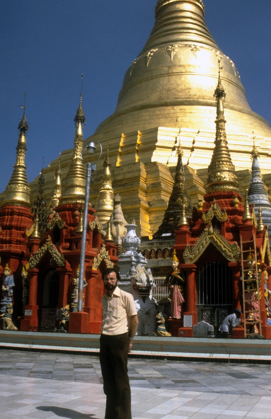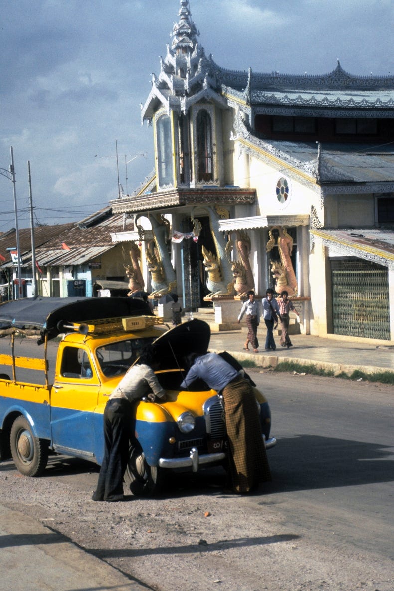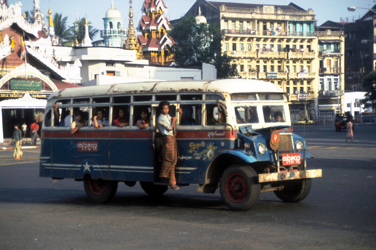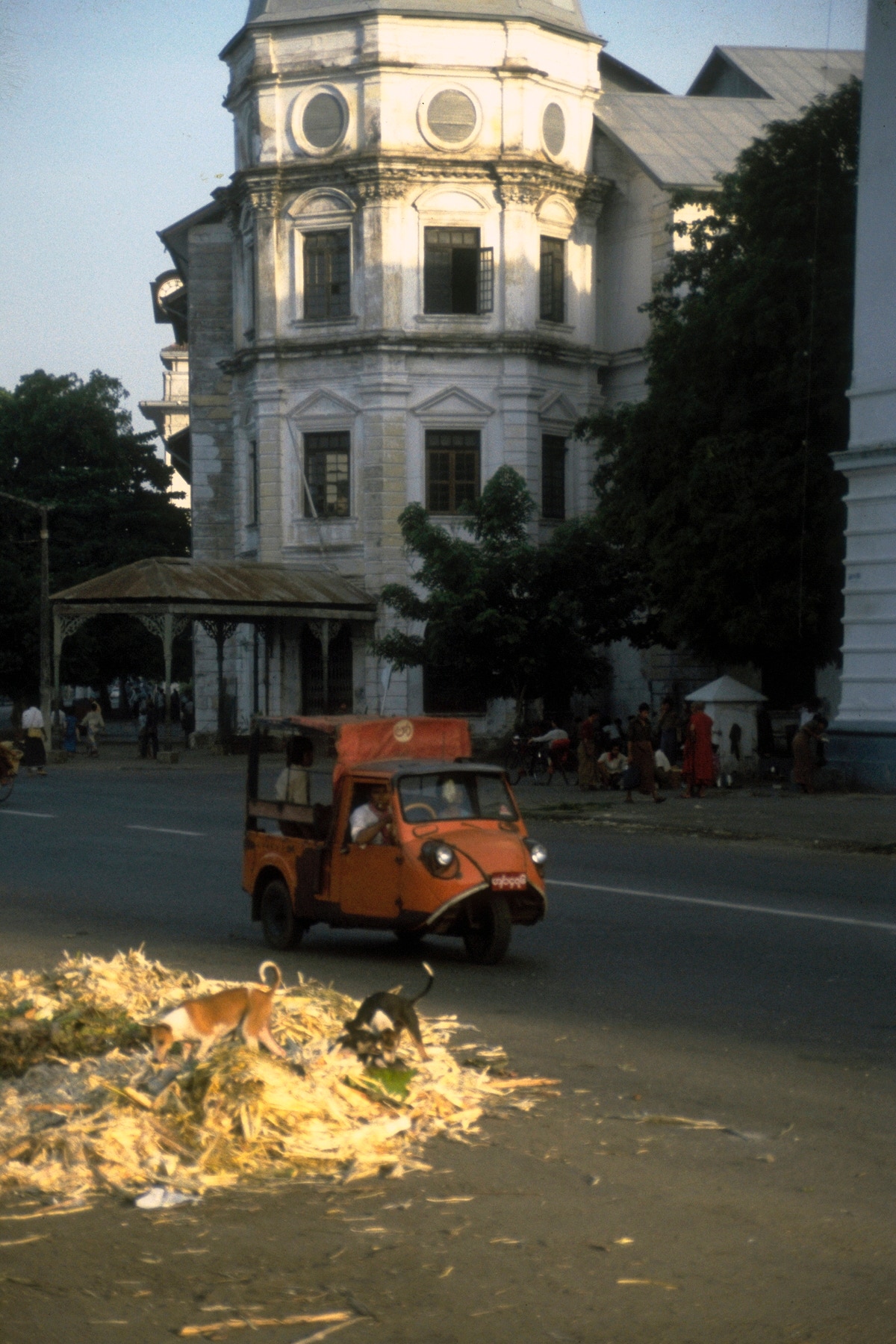 The colonial charm endured, with old overhead paddle fans, and a manually changeable sign beside the reception desk with Rangoon’s air schedules shown (and unfortunately labelling Aeroflot Soviet Airlines as “Aeroflop”). Perhaps the most exquisite feature of the colonial past was the “Lost and Found” cabinet in the foyer, with dusty items that must have been mis-placed at least half a century ago; I say this because I didn’t see much evidence of ladies using miniature folding fans or men using fob watches during my stay in Rangoon. The picture was completed when we stepped out the front door and encountered a line of old Fords and Chevrolets – meet the Rangoon taxi fleet. Despite their large size, each taxi could take only three passengers, all in the back; this was because the three front seats were universally used by three others – the driver, the owner, and the mechanic.