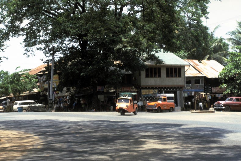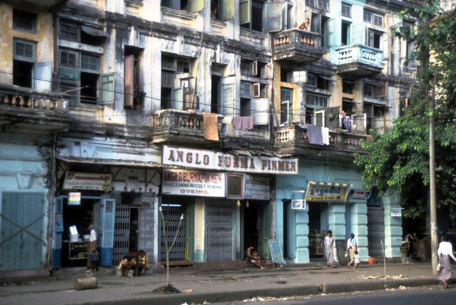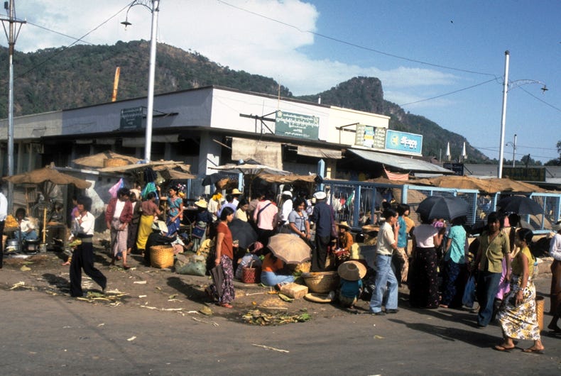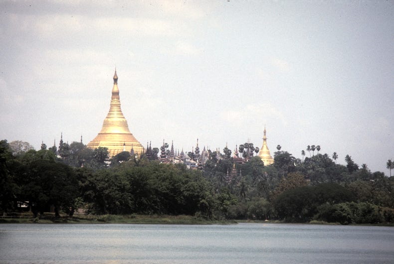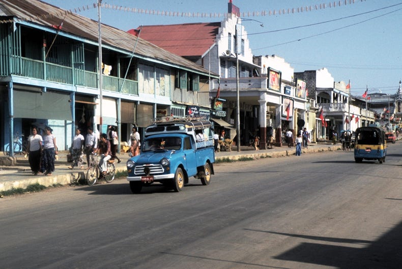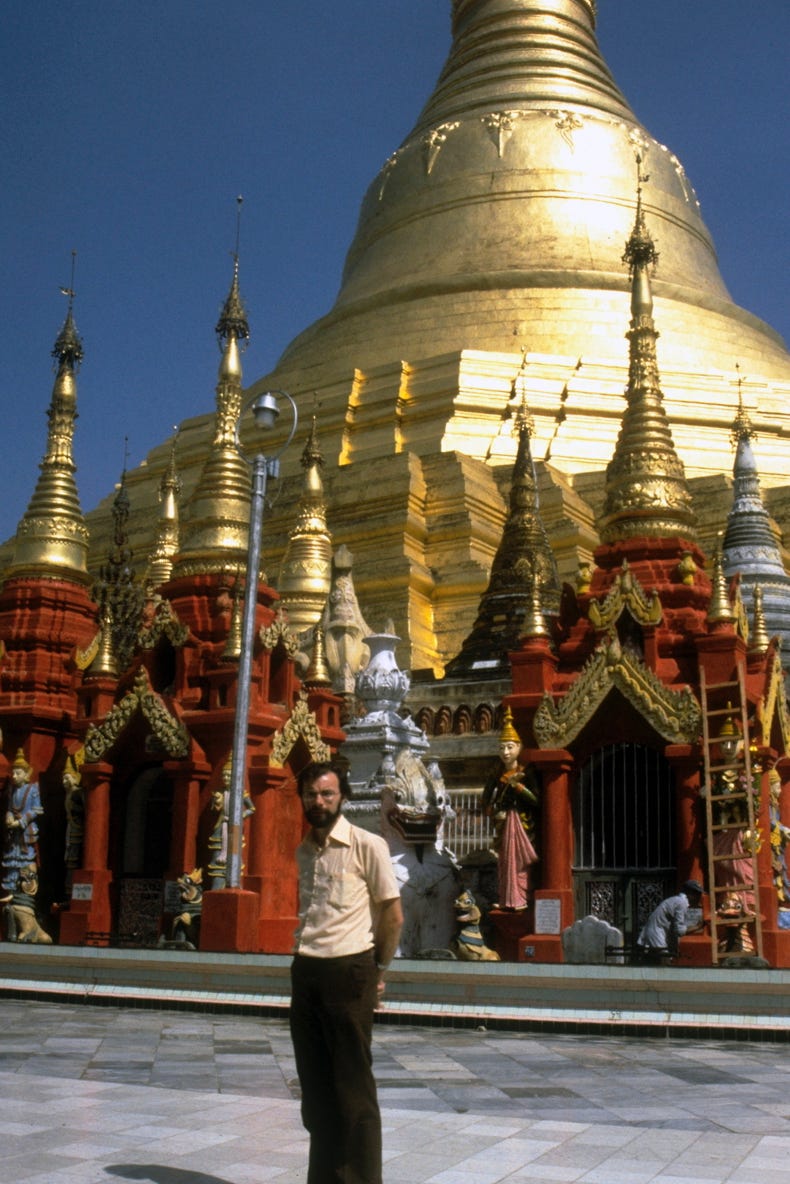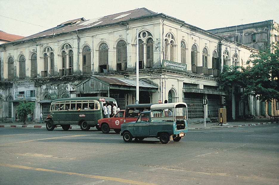 The colonial charm endured, with old overhead paddle fans, and a manually changeable sign beside the reception desk with Rangoon’s air schedules shown (and unfortunately labelling Aeroflot Soviet Airlines as “Aeroflop”). Perhaps the most exquisite feature of the colonial past was the “Lost and Found” cabinet in the foyer, with dusty items that must have been mis-placed at least half a century ago; I say this because I didn’t see much evidence of ladies using miniature folding fans or men using fob watches during my stay in Rangoon. The picture was completed when we stepped out the front door and encountered a line of old Fords and Chevrolets – meet the Rangoon taxi fleet. Despite their large size, each taxi could take only three passengers, all in the back; this was because the three front seats were universally used by three others – the driver, the owner, and the mechanic.