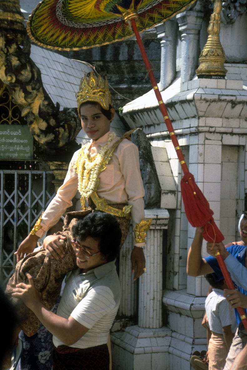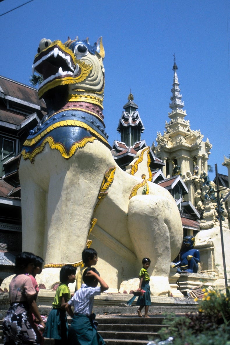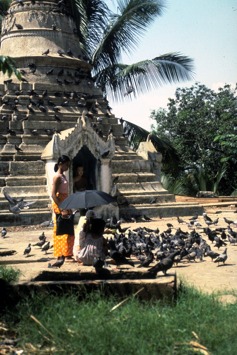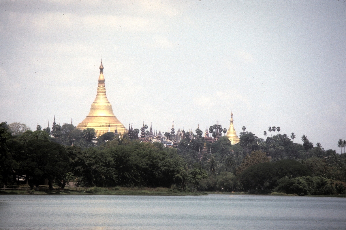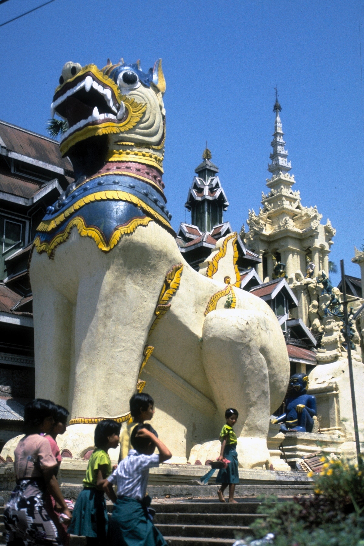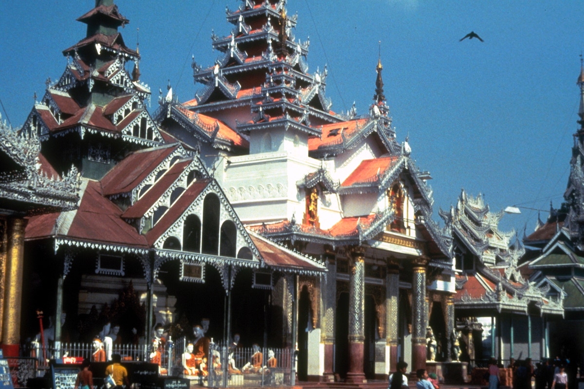 The symbol of Rangoon, this 100-metre high stupa is said to contain more gold than the vaults of the Bank of England, together with 5,448 diamonds and 2,317 rubies, and is surrounded by almost 100 smaller temples and pavilions. It is a centre of faith for Burmese Buddhists and an architectural wonder for any visitor. More than any other place seen on the study tour, it is a building that overwhelms the individual, making him or her fully aware of their own insignificance. As well as the myriad of Burmese life on display at the Shwedagon (such as Buddhist devotions, washing images, begging, selling caged birds to set free in order to gain merit, cheroot-smoking old ladies, and so on), we were also privileged to witness a part of the ordination of several young boys into the Buddhist monkhood on the central platform of the pagoda.