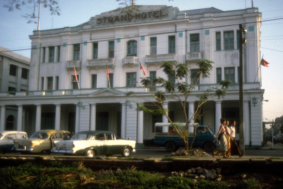 Our accommodation in Rangoon, the government-run Strand Hotel, was a Rangoon landmark. Opened in 1901 under the ownership of the Sarkie brothers, who also ran Raffles Hotel in Singapore and the Eastern & Oriental Hotel in Penang, the Strand was once one of the grandest hotels in Asia, a glorious colonial outpost in Britain’s Empire of the day. Its decline began with the Japanese occupation of Rangoon during World War II, and following Burma’s independence in 1948, it was largely neglected until taken over by the government in 1963. Since that time, it has been getting dustier and dustier as the years have marked on. No-one would mistake it for the Raffles Hotel in Singapore these days!