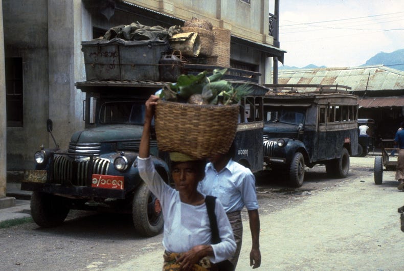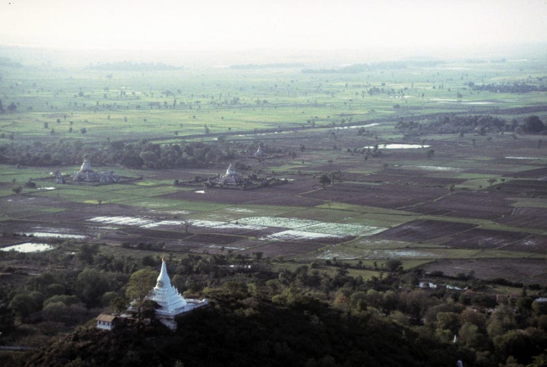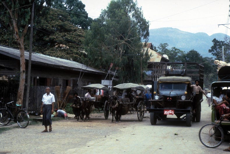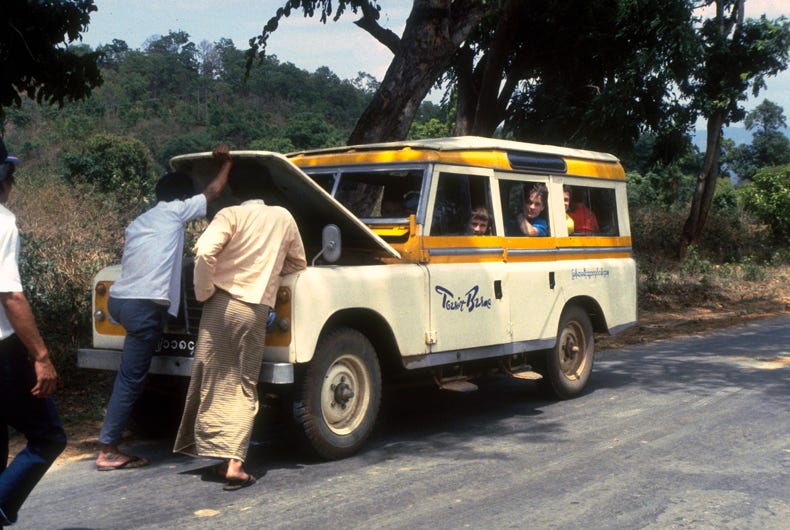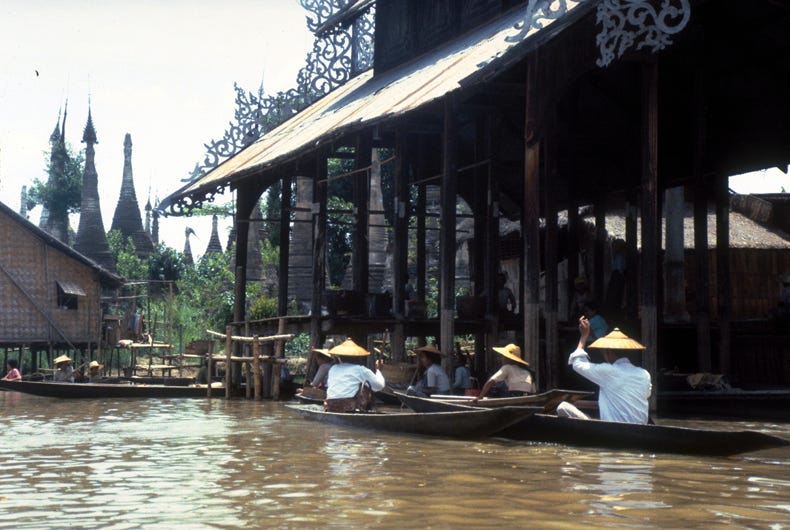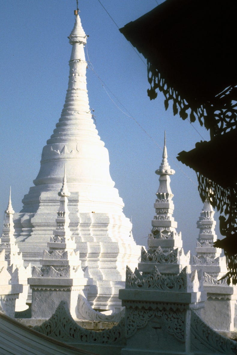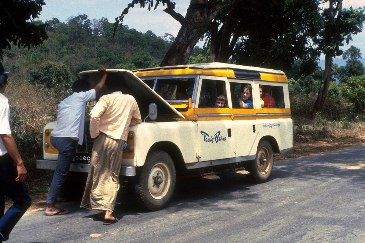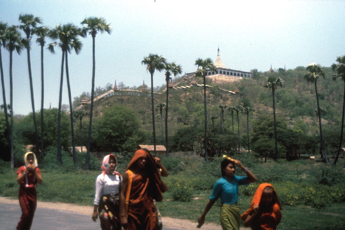 The return trip to Heho Airport saw the only breakdown of the trip, when the Tourist Burma Land Rover “gave up”.  The problem was overcome simply, however, when the group in the Land Rover transferred to the bus being used by the rest of the group.  From Heho, a short 135-kilometre half-hour flight on a Burma Airways Fokker F-27 saw the group in Burma’s second largest city, Mandalay, described as the most Burmese of Burmese cities.