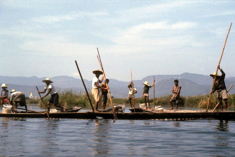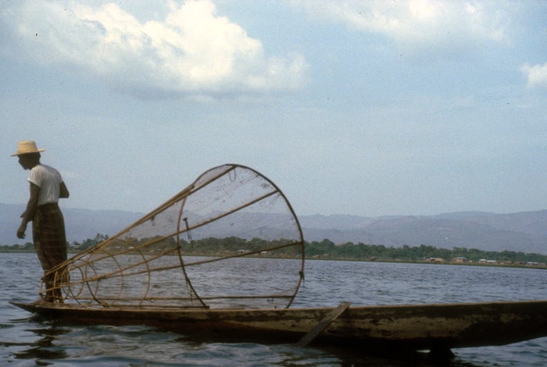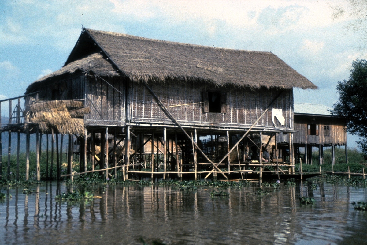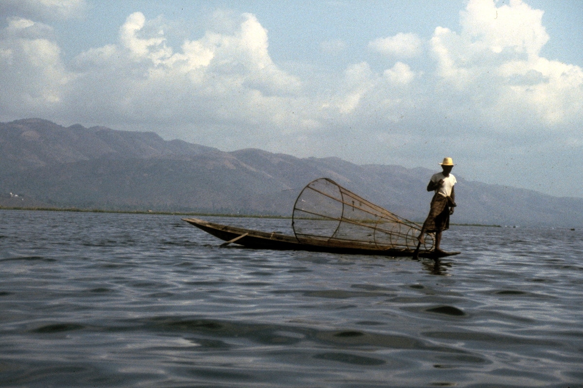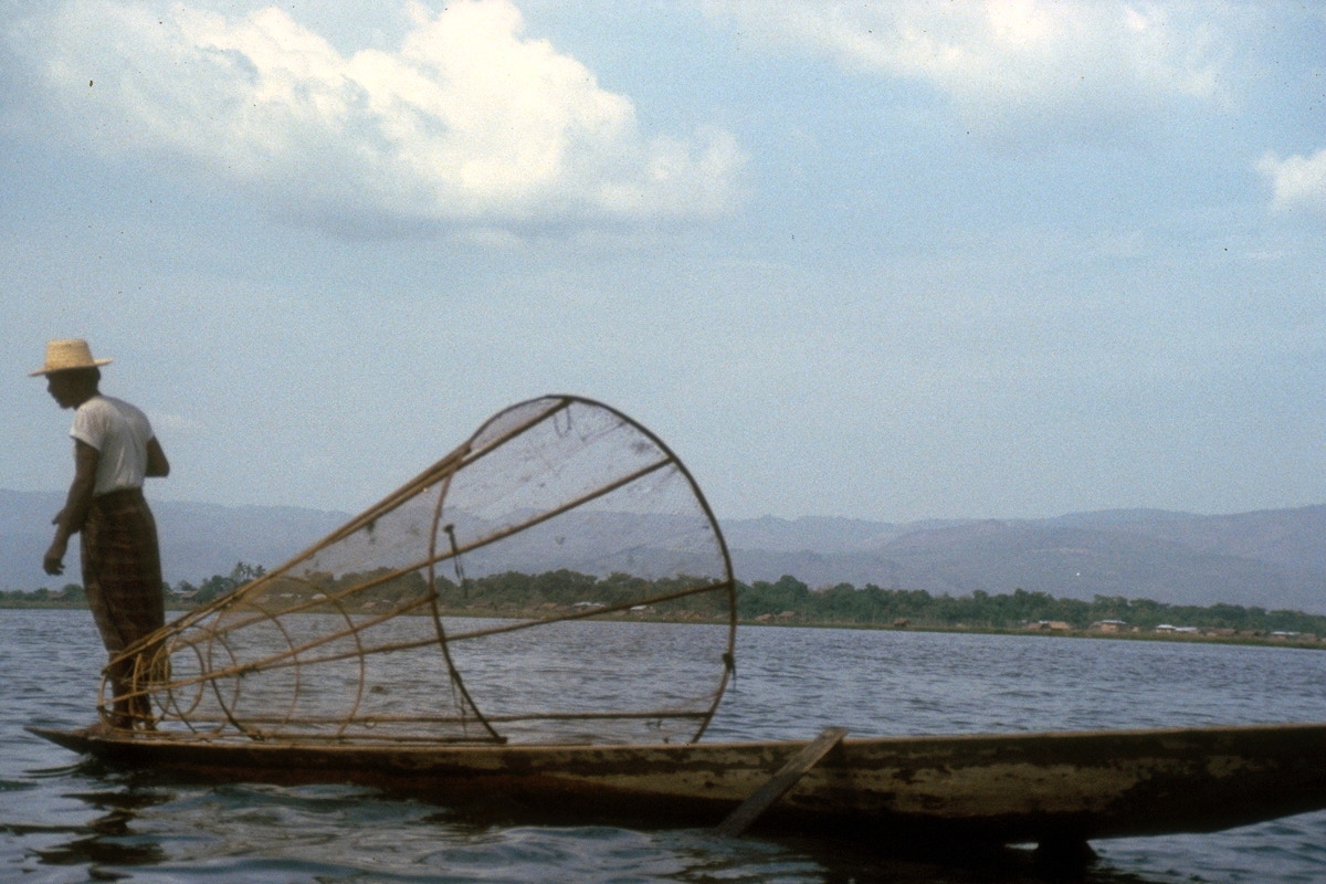 We travelled this morning from Taunggyi through the village of Shwenyaung to the town of Yaunghwe.  Yaunghwe is the largest town of the Intha people, who live on the shores of Inle Lake.  At Yaunghwe, we transferred to two motorised longboats to travel across Inle Lake to study the unique rural lifestyle of the Intha people.  The Intha have developed a technique for converting the humus at the bottom of the lake into one metre thick fIoating islands, suitable for the cultivation of vegetables.  Furthermore, the Intha people have developed a unique system of fishing, using woven basket-like cones to catch the fish, propelling the boat with an oar pushed with one leg to free both hands for fishing.  At the southern limit of the Inle Lake excursion, which was the village of Ywama, we visited a weaving workshop, a floating market and the Phaung Daw U Pagoda.