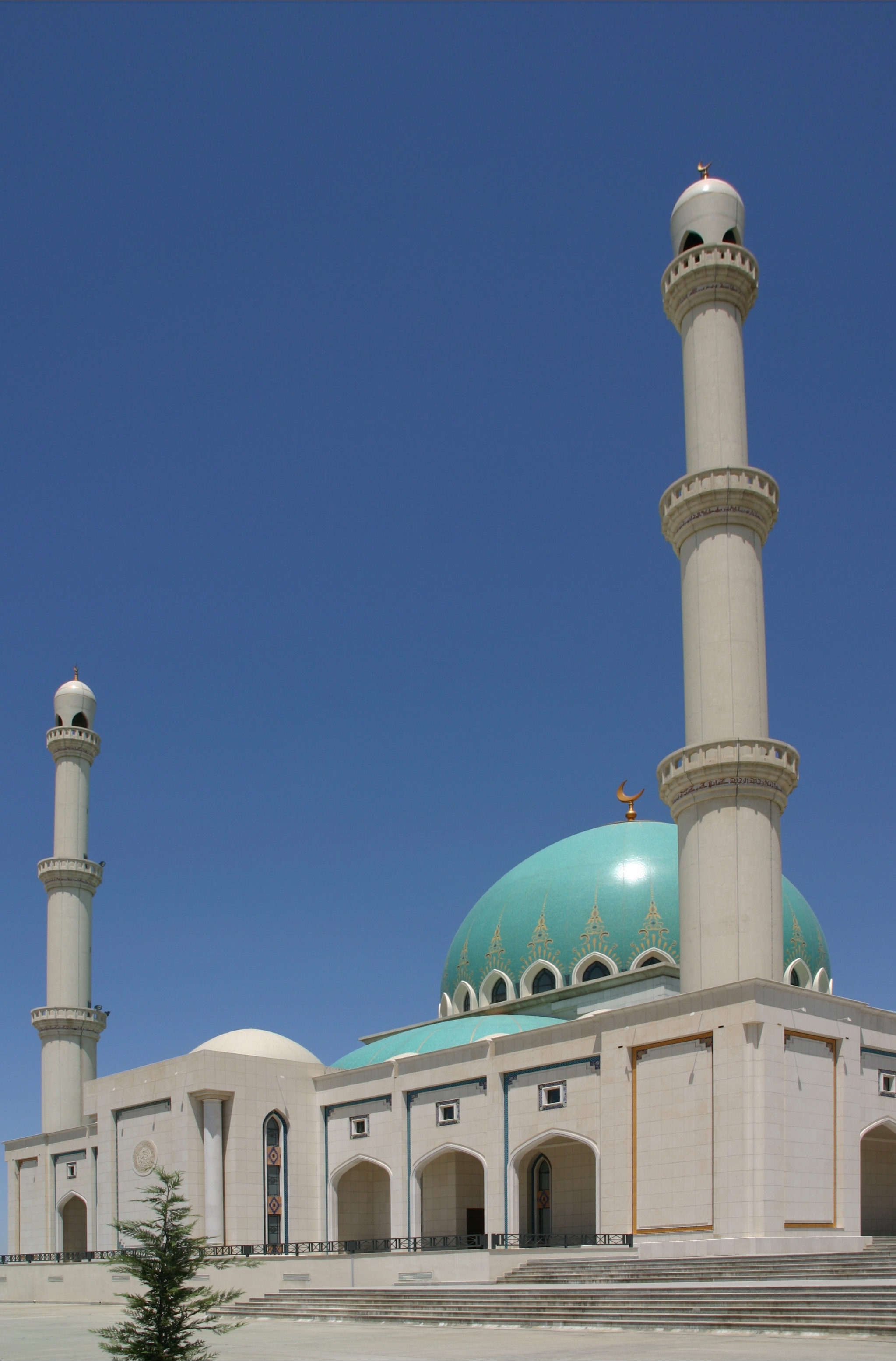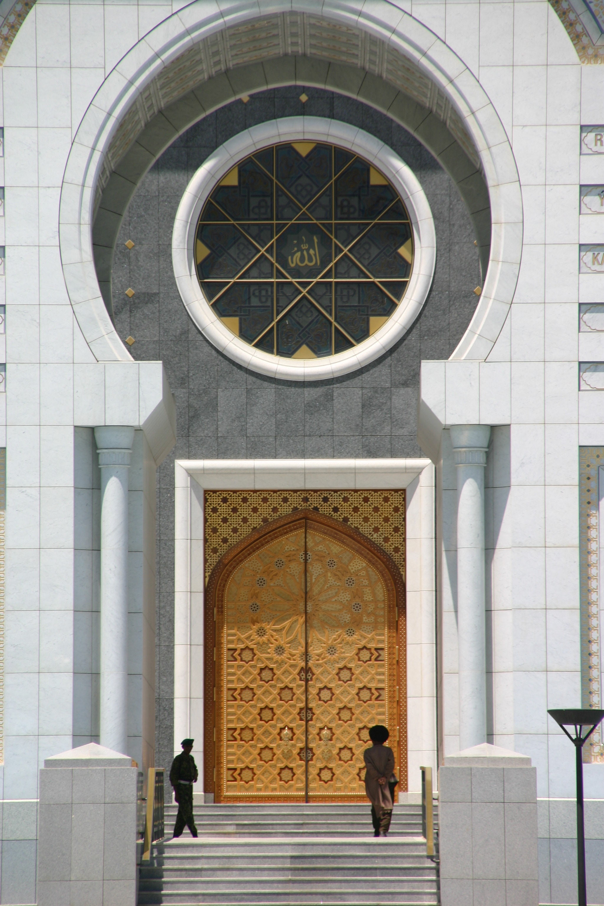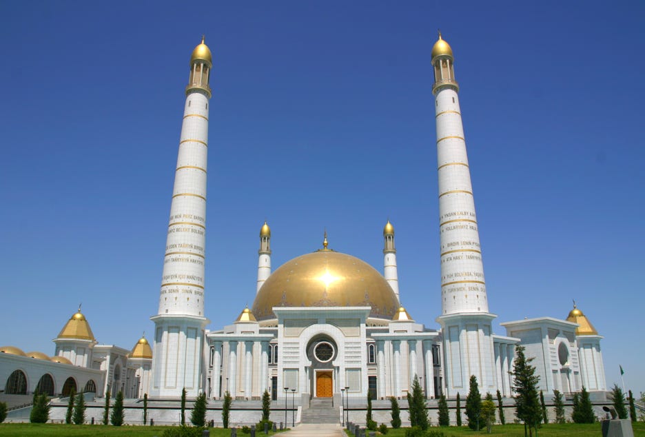 After checking out at 10 am, we went to the markets to stock up on water for the next few days in the mountains near the Turkmenistan-Iran border, and then headed off to the north-west of Ashgabat. Our first stop was in Kipchak, the village on the outskirts of Ashgabat where President Niyazov was born. On the edge of town we visited the huge, golden-domed mosque which was finished two years ago, and which is now the largest mosque in Central Asia.