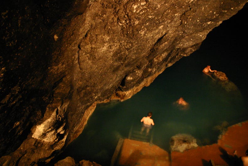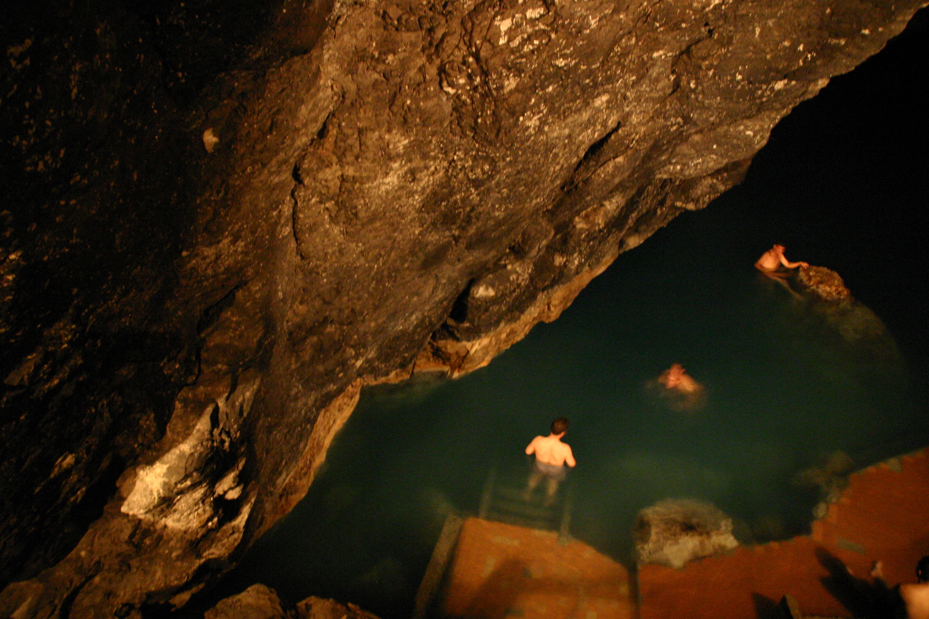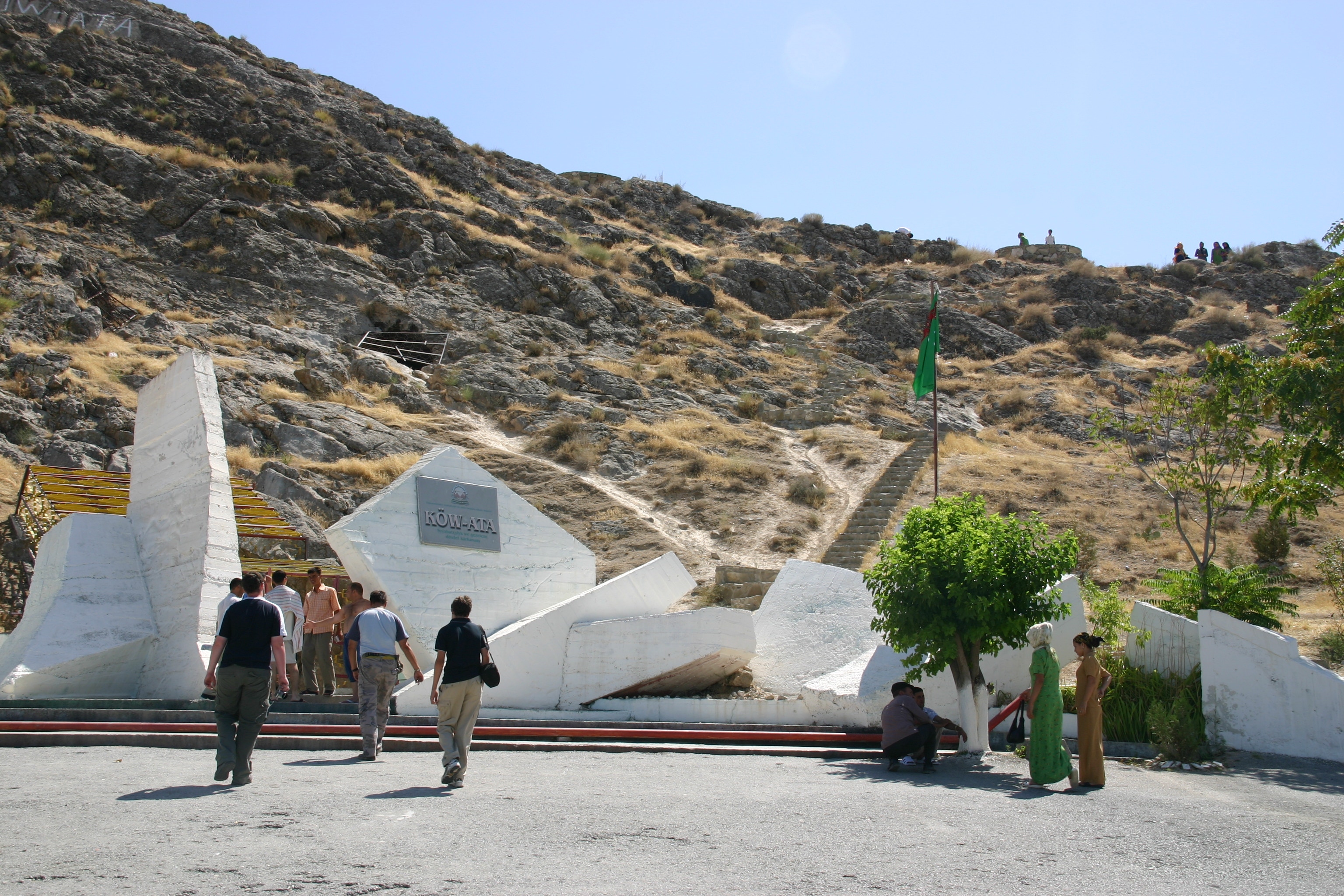 More driving across the flat plain took us along the route of the ancient Silk Road, following a narrow well-watered corridor with the mountains on our left and the desert on our right. We eventually arrived at Köw-Ata Underground Lake, which sounded like some exciting geography to be observed! As our guidebook had indicated an entrance fee of $2 per person, I was a bit surprised to be asked for 100,000 manat each for Andy and myself, a total of 200,000 manat – which really blew my budget for the next few days. However, expecting something really special, I paid and we descended the steps 65 metres down into the base of a rocky mountain. What we found at the bottom was a dimly lit, hot, sulphurous pool with a few local people swimming in it, a long way short of the spectacular Guilin-like experience I was half-hoping for. We stayed for a few hot uncomfortable minutes and then returned to the comparatively refreshing air outside, feeling pretty ripped off.