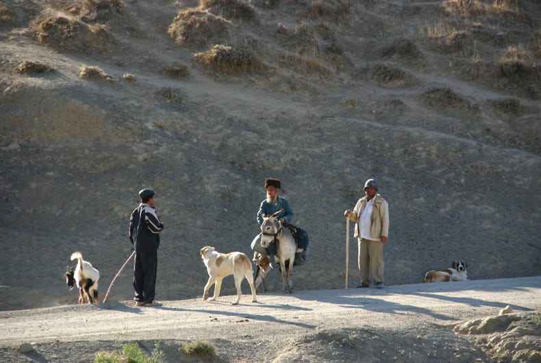 After a very late lunch of chicken kebabs and coke, we left Köw-Ata at about 4:30 pm and continued our drive up into the mountains that form the border between Turkmenistan and Iran. This was by far the most spectacular scenery of the day, with barren, rugged, rocky mountains surrounding our winding road. We passed through the village of Nokhur, which was to have been our destination until a recent change in government regulations banned foreigners staying in people's private houses. We therefore continued our journey about 11 kilometres further up into the mountains to a beautiful semi-alpine valley called Chandybil.