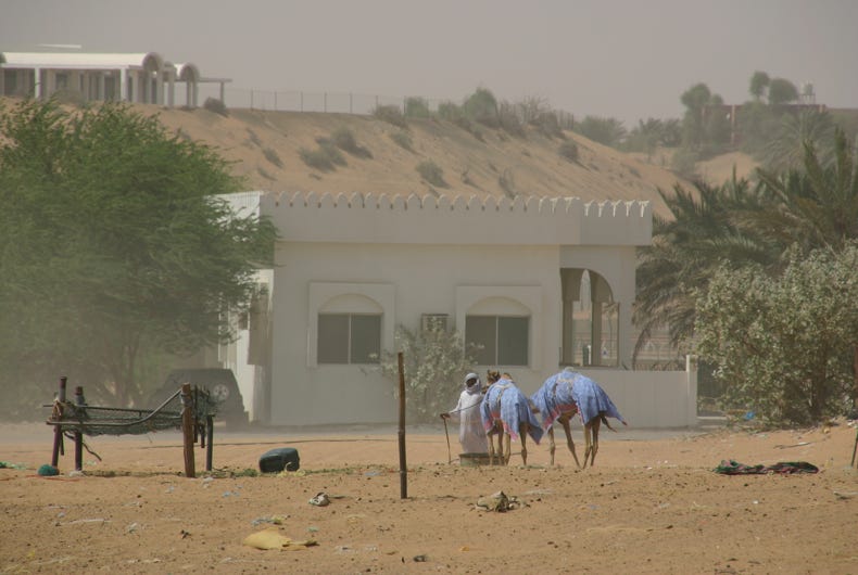 Driving further inland took us into "serious" sandy desert, with sand drifts blowing across the road as a we proceeded. A highlight of the trip was a group of wild camels grazing right beside the road among the xerophytic vegetation – a great photo opportunity, of course.