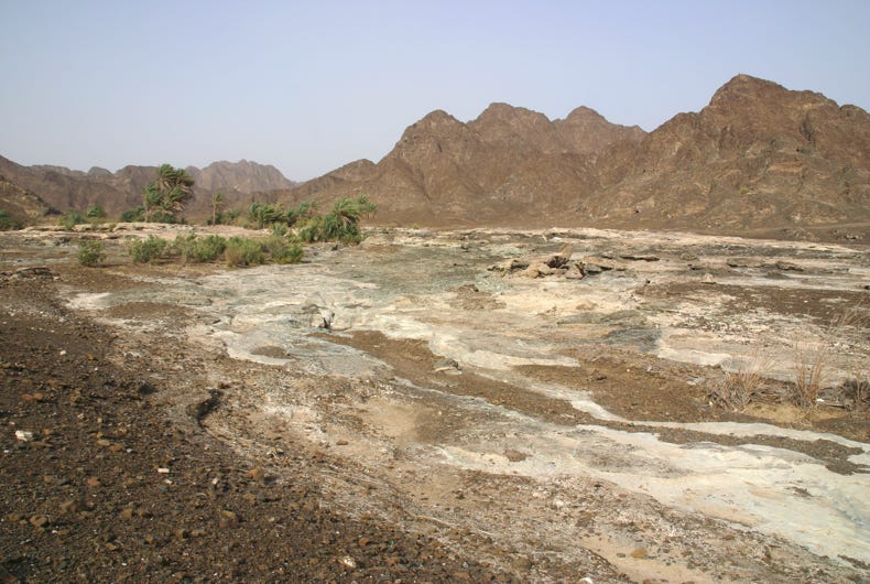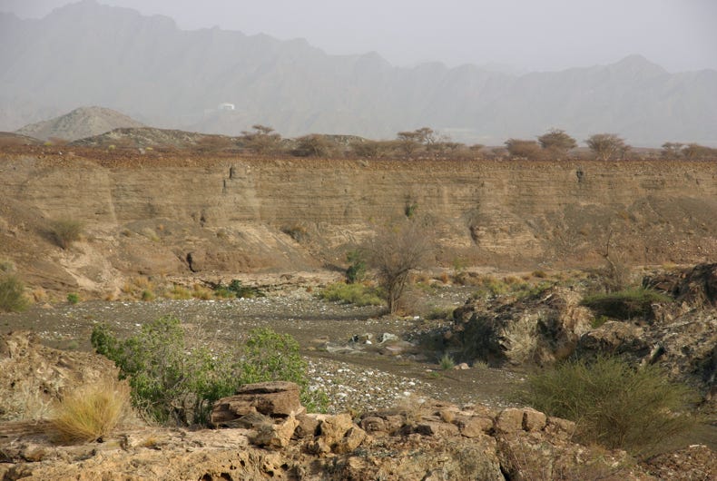 Our drive continued a large circuit, first heading east to the town of Dhayd but then turning towards the south as the road continued. We crossed the border into Oman, using a road that did not require passport checks – quite legally, fortunately, as we did not have visas for Oman. The 65 kilometre drive south to Bureimi was wonderful, a real highlight of the day, as it wound through rocky hills, across wadis, past canyons and through stunning desert vegetation.