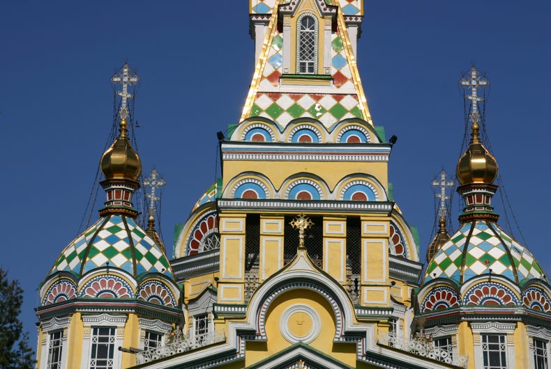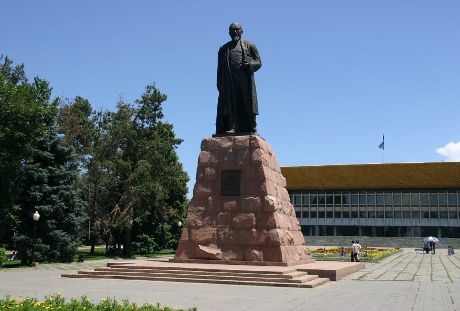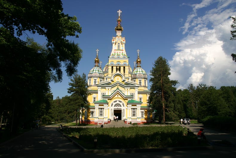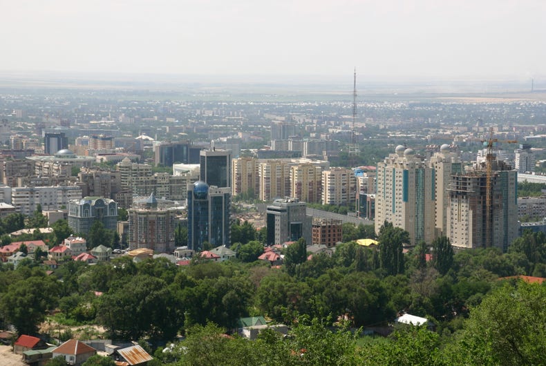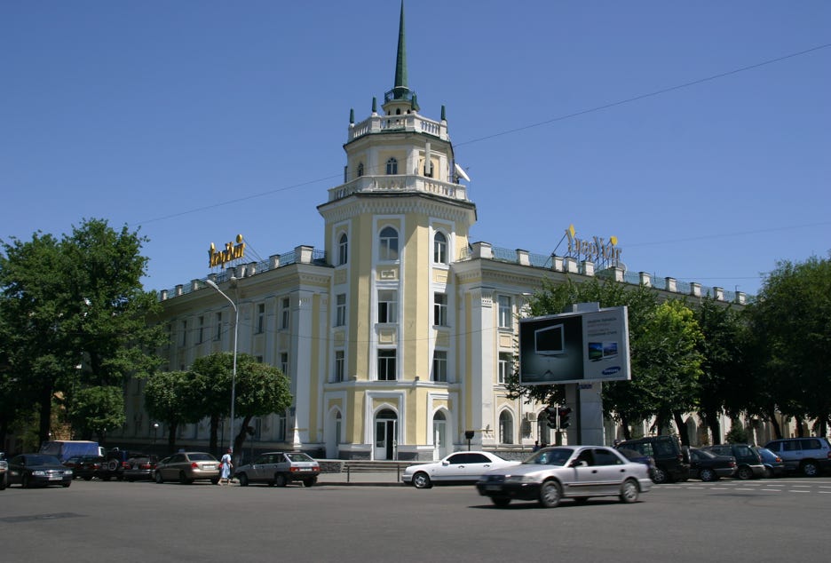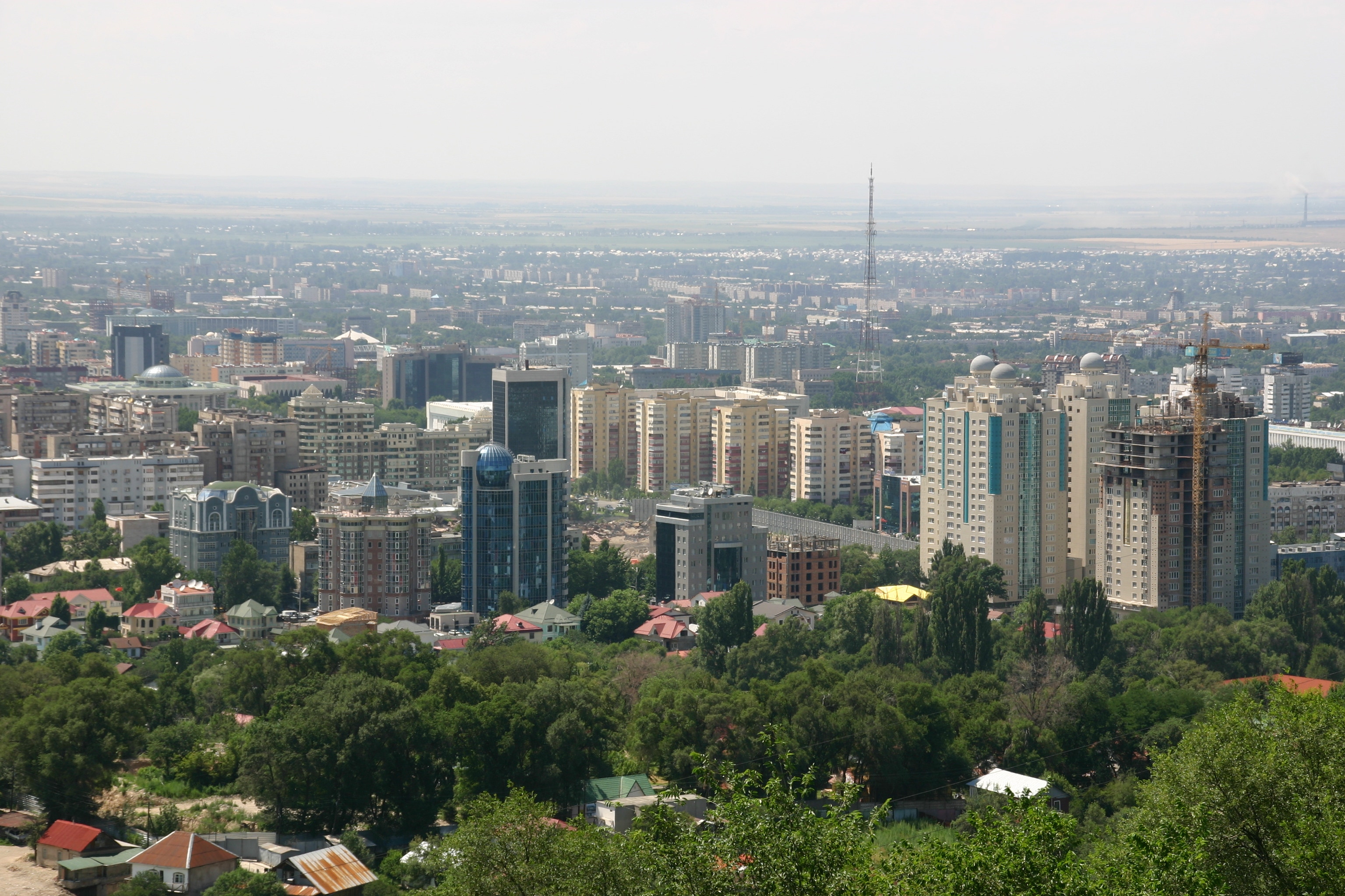 After an hour to settle into the hotel and, of course, obtain some local currency (this time at a rate of 118 tenge to the US dollar), we began an extensive tour of Almaty. We started by seeing some of Almaty's Soviet-era grand buildings and plazas, stopping for some time at the Palace of the Republic before driving and then walking up to the hill to Köktyube for spectacular views across Almaty, backed by its snow-capped hills to the south – and some very welcome cool drinks. Almaty is a young city that is almost totally Russian – indeed Soviet – in character, but its mountain backdrop provides a very pleasant and at times spectacular setting.