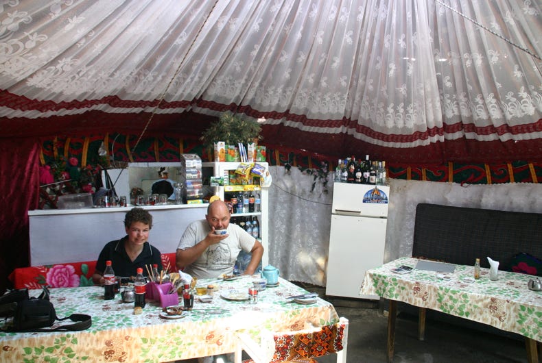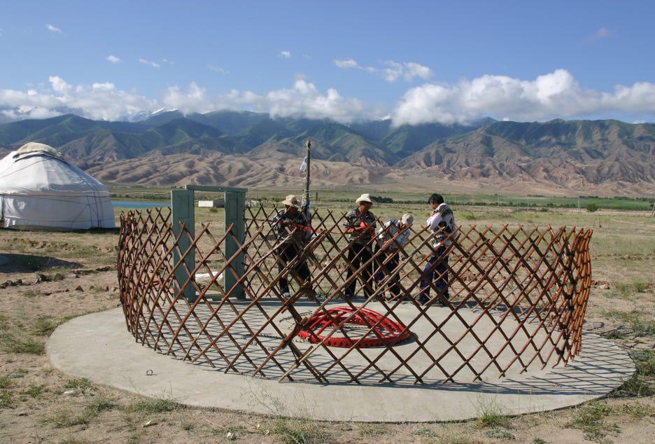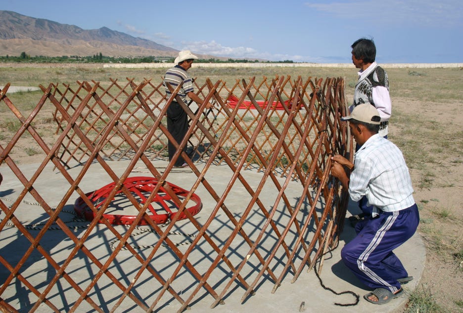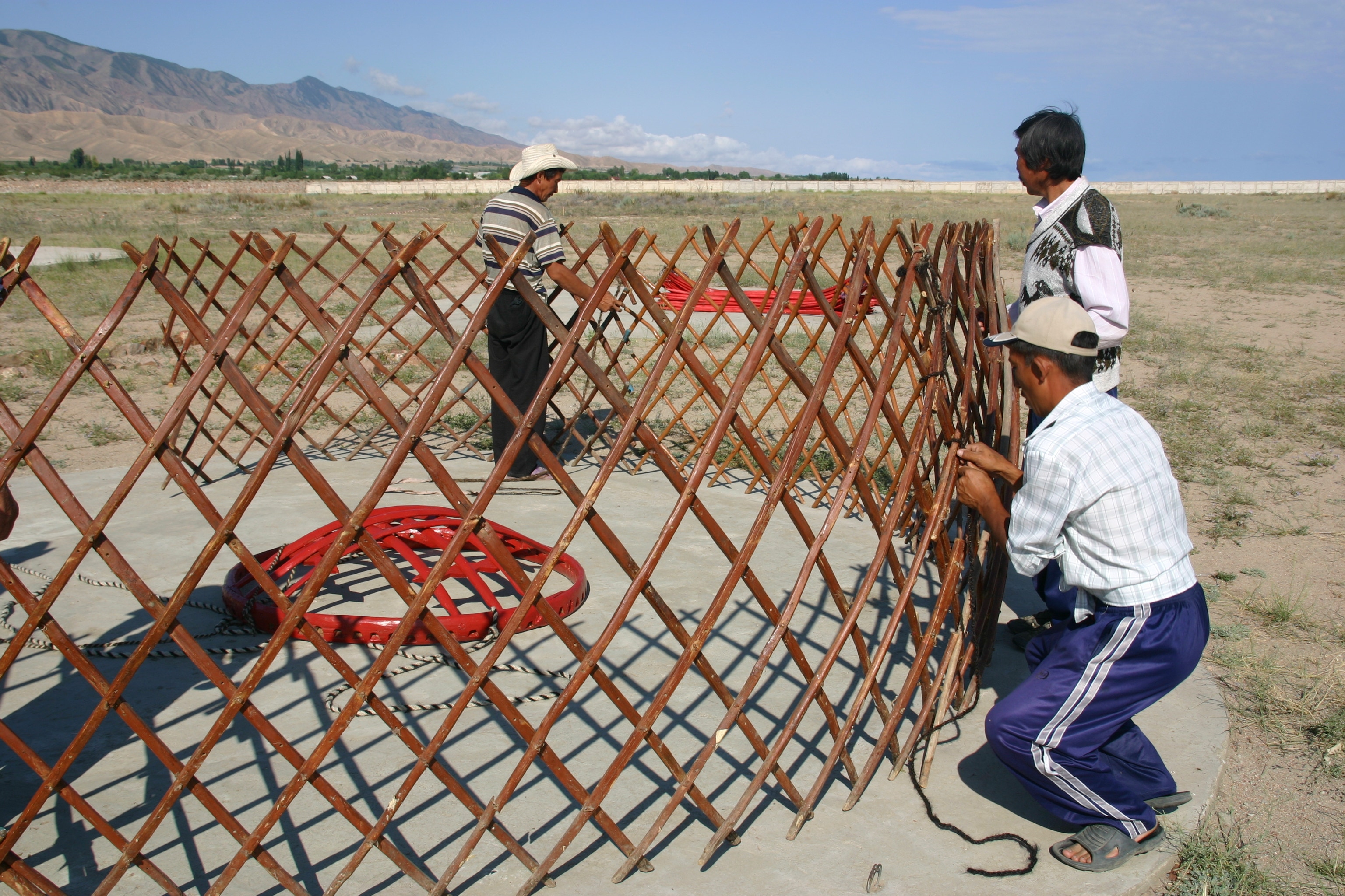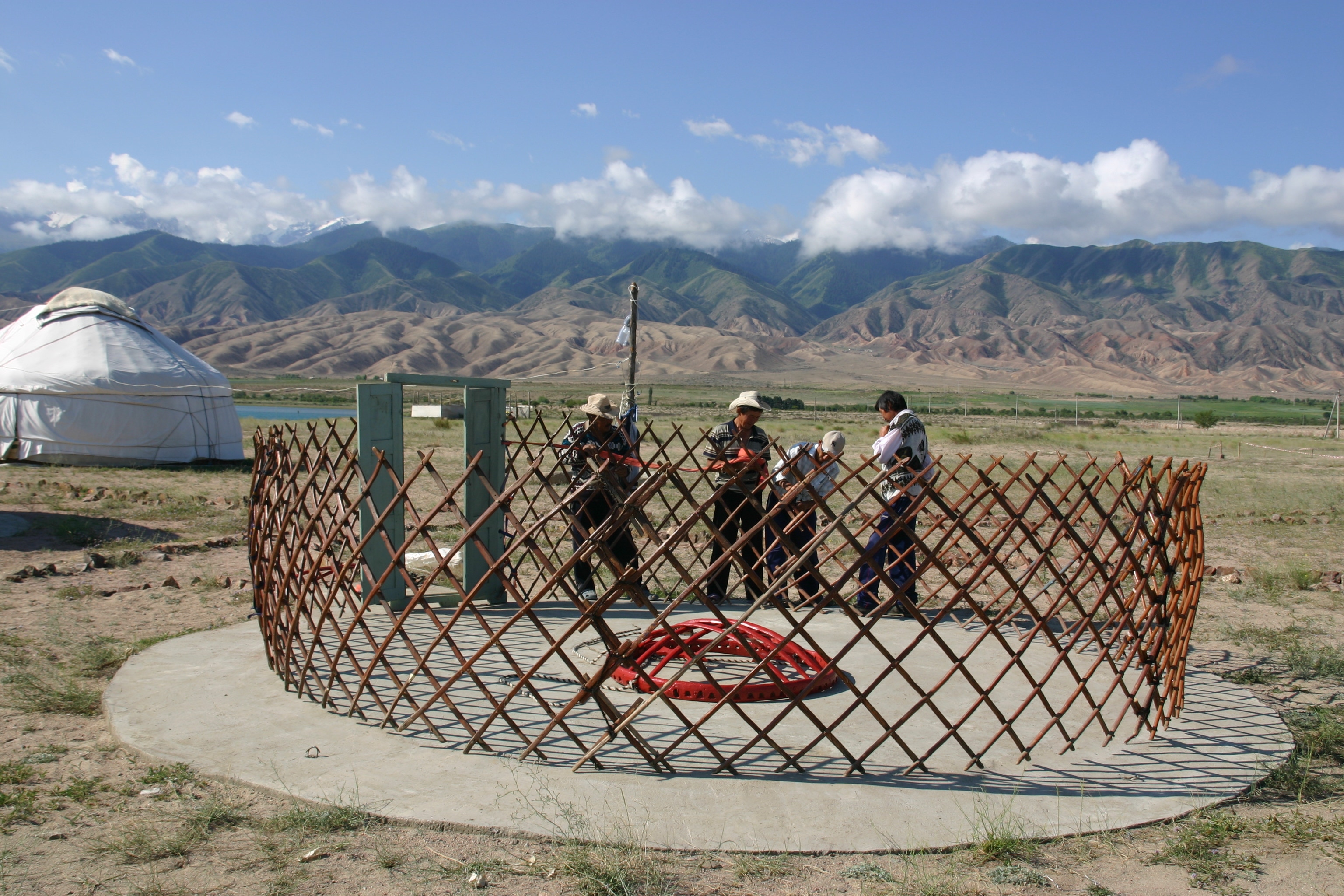 After a great breakfast of porridge, hard boiled egg, Kyrgyz doughnuts and dry bread, we took a while to watch a new yurt being erected before departing. They say that a champion team of yurt builders can erect a yurt in 50 minutes. I guess this means that team we were watching was not a champion team!