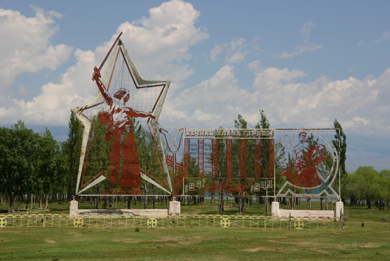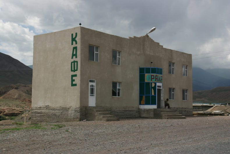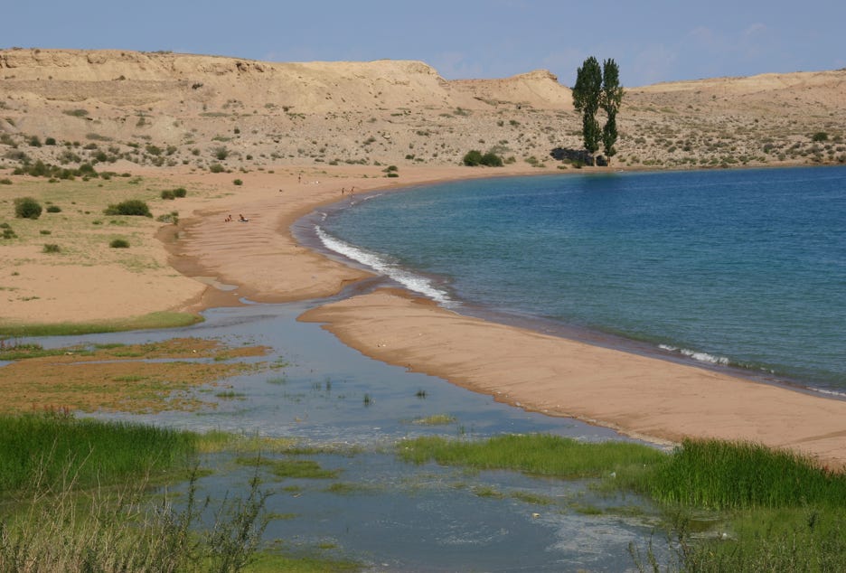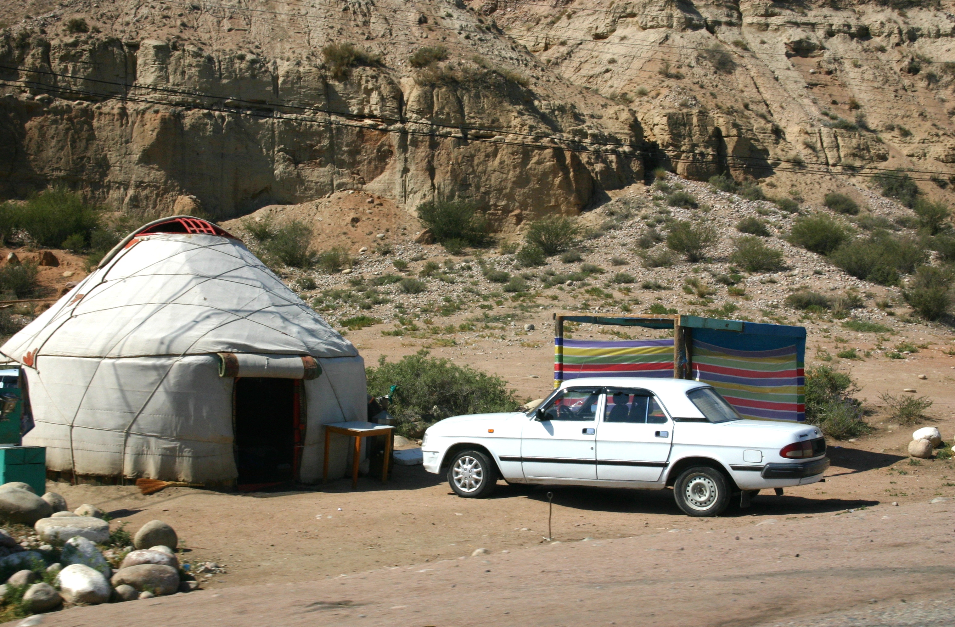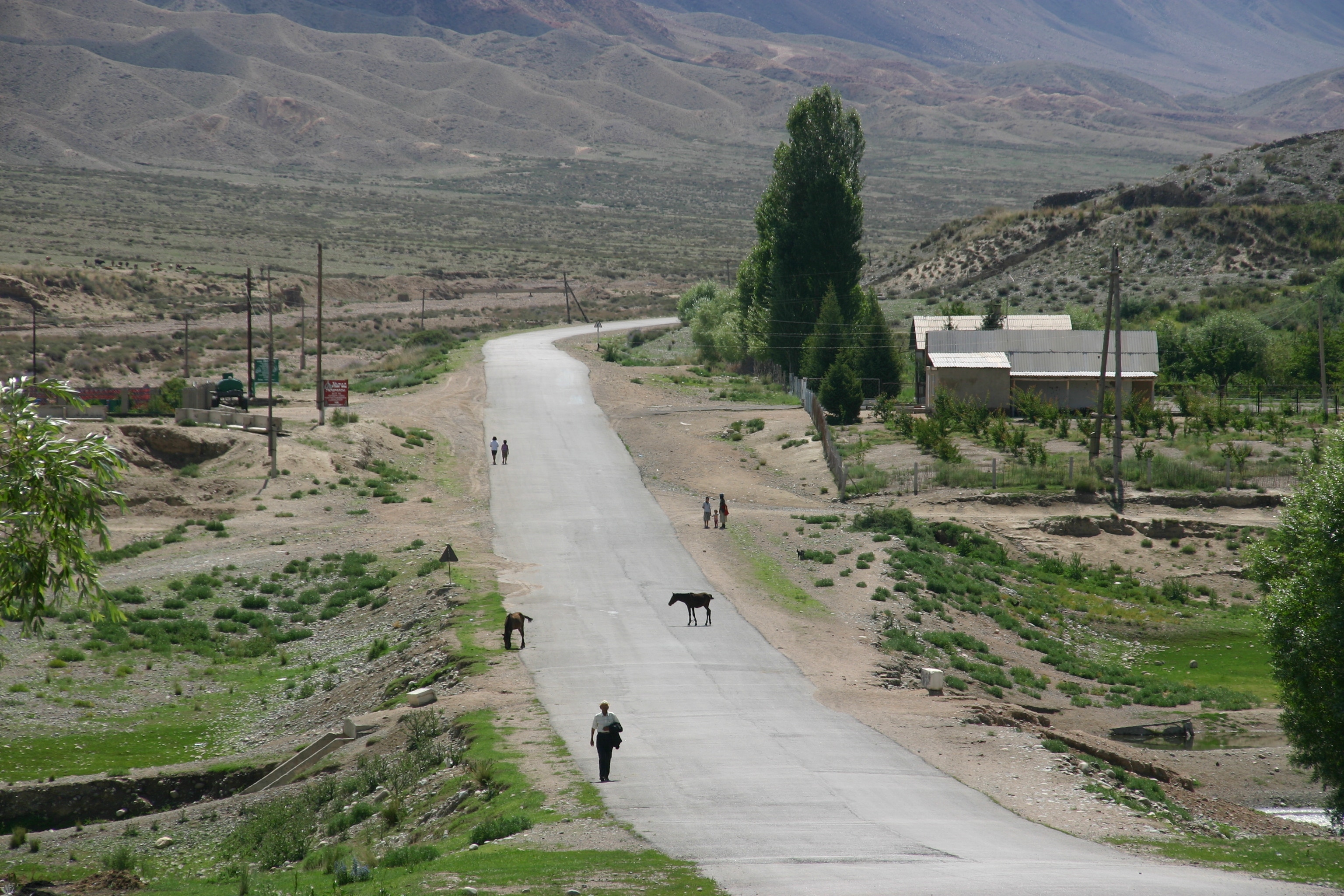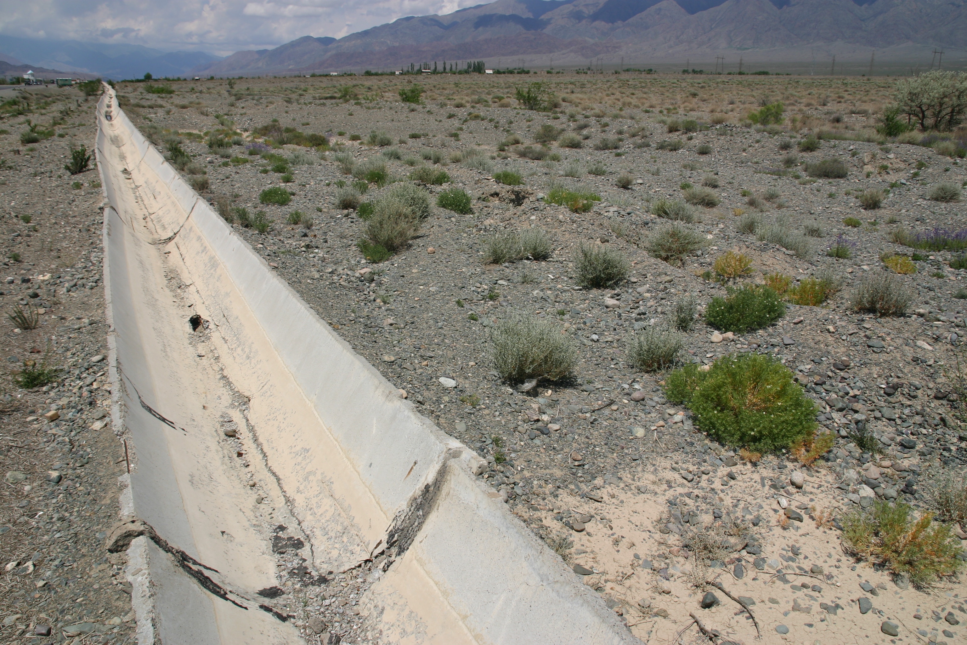 In several places, I noticed concrete irrigation aqueducts beside the road that seems to be in disrepair and disintegration. I asked Marat about these, and he told me that these irrigational aqueducts had been built in Soviet times and had transformed the area into irrigated farmlands. After the Soviet Union collapsed in 1991, the collective structures to maintain the aqueducts evaporated, and they started to break down. Then local people, usually officials who were above the law, began to take away sections of the concrete aqueduct for their own private purposes, often using bulldozers and heavy equipment. As a result, the irrigation system has been destroyed and the land has reverted to desert.