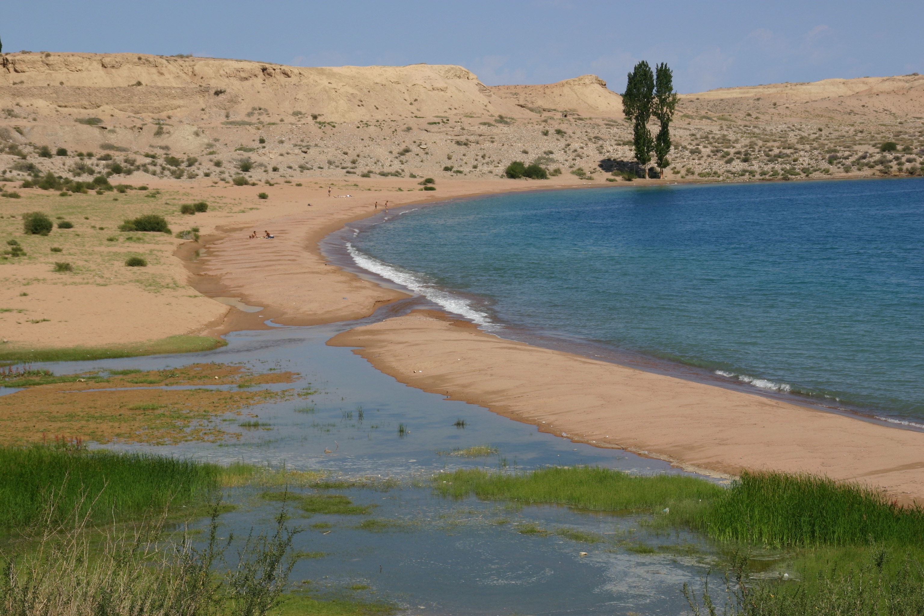 The drive along the southern shore of lake Issuk-Kul provided a great variety of scenery. As we progressed to the west, the land became progressively drier, and the land soon took on a semi-arid appearance with brightly coloured badland scenery that had been eroded into often bizarre shares and forms. Always backing the nearby scenery to the south were snow capped mountains, while to the north the waters of Lake Issuk-Kul were a brilliant deep blue colour, often lined with bright sandy beaches or spits. It is was interesting to see obviously coastal landforms on the side of this alpine lake, sure evidence that the lake is large enough to produce landform-shaping waves.