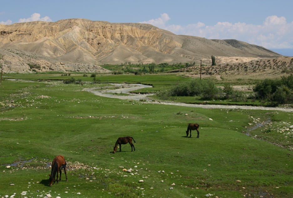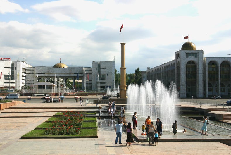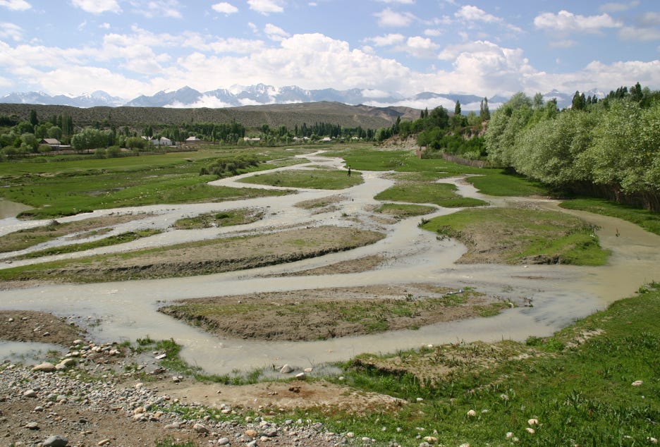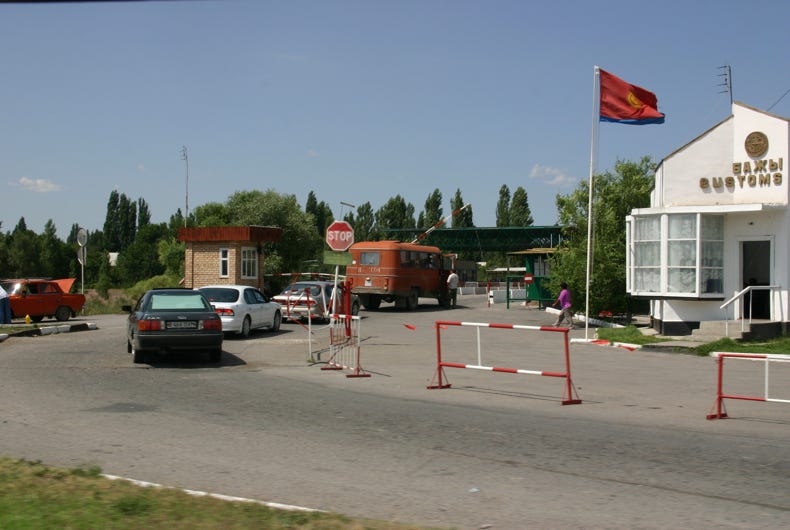 Towards the end of our journey into Bishkek, our road followed the river that marked the border between Kyrgyzstan and Kazakhstan. In many places, the river was quite narrow and it was possible to wade across this international border, even considering the turbulent brown flow of the river.