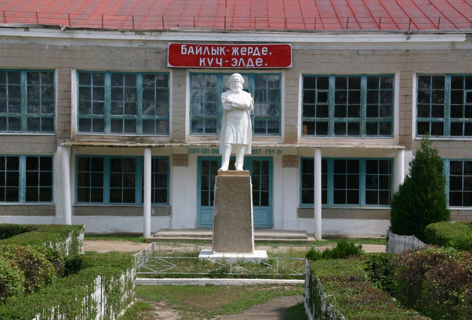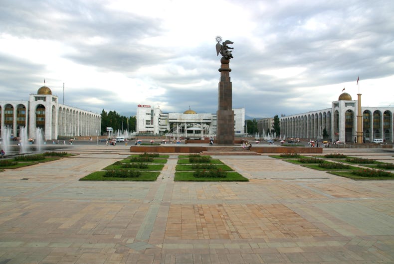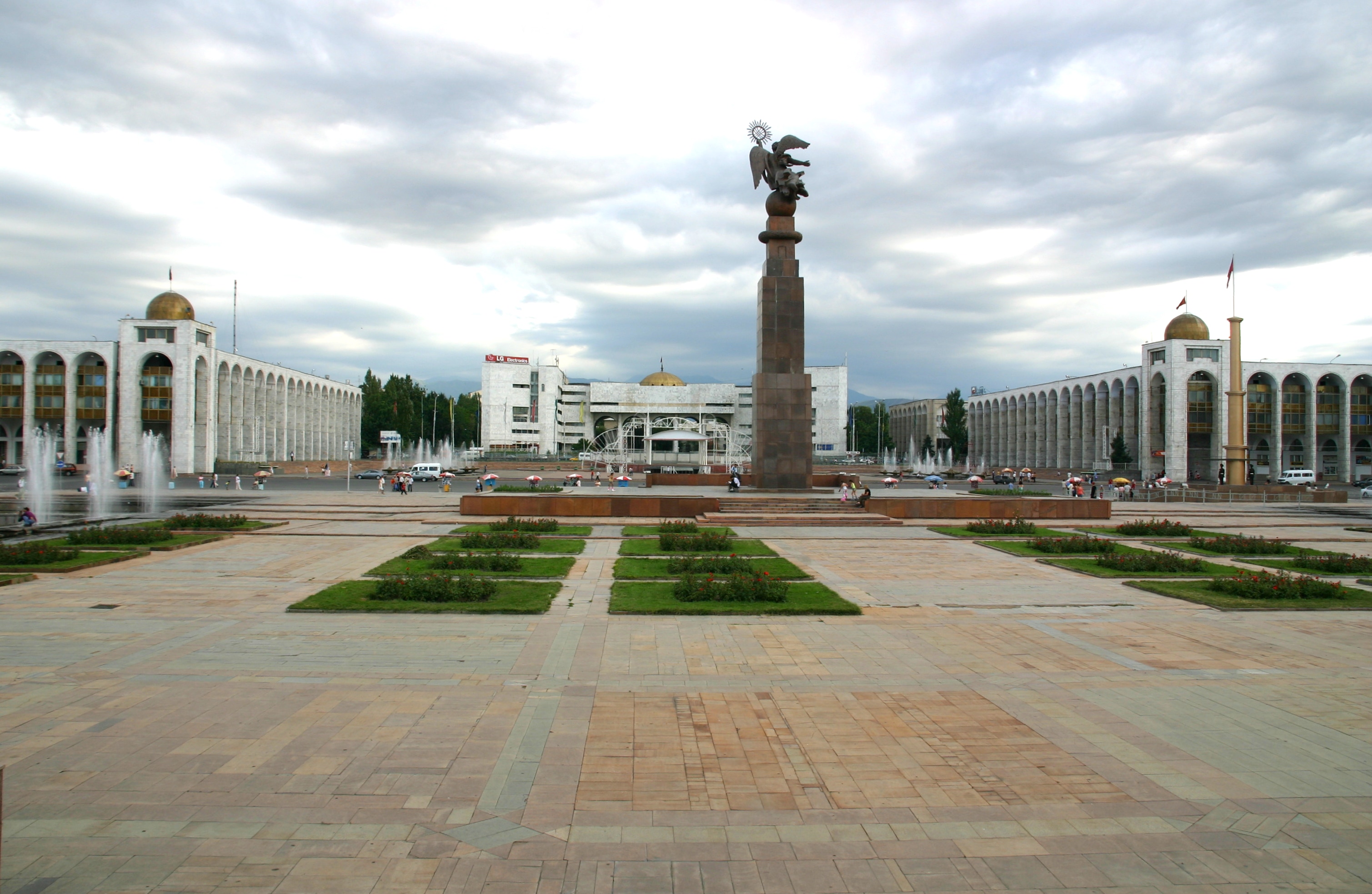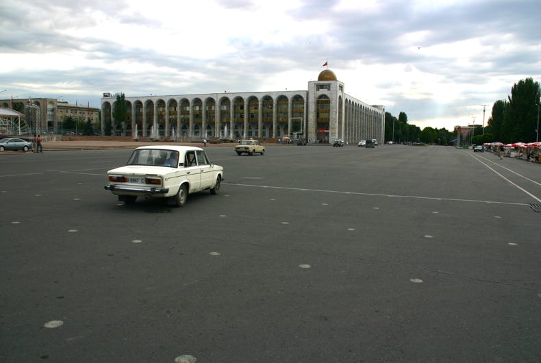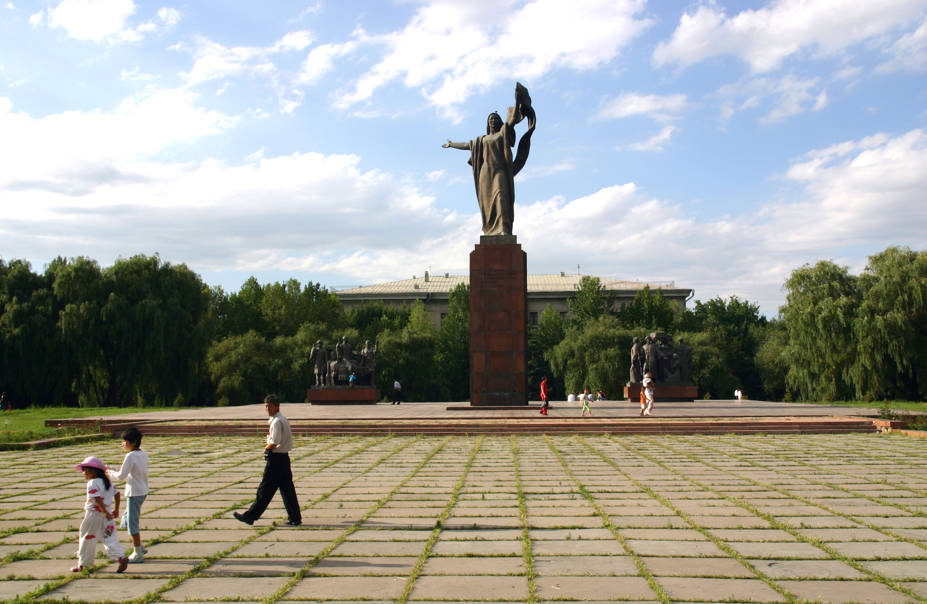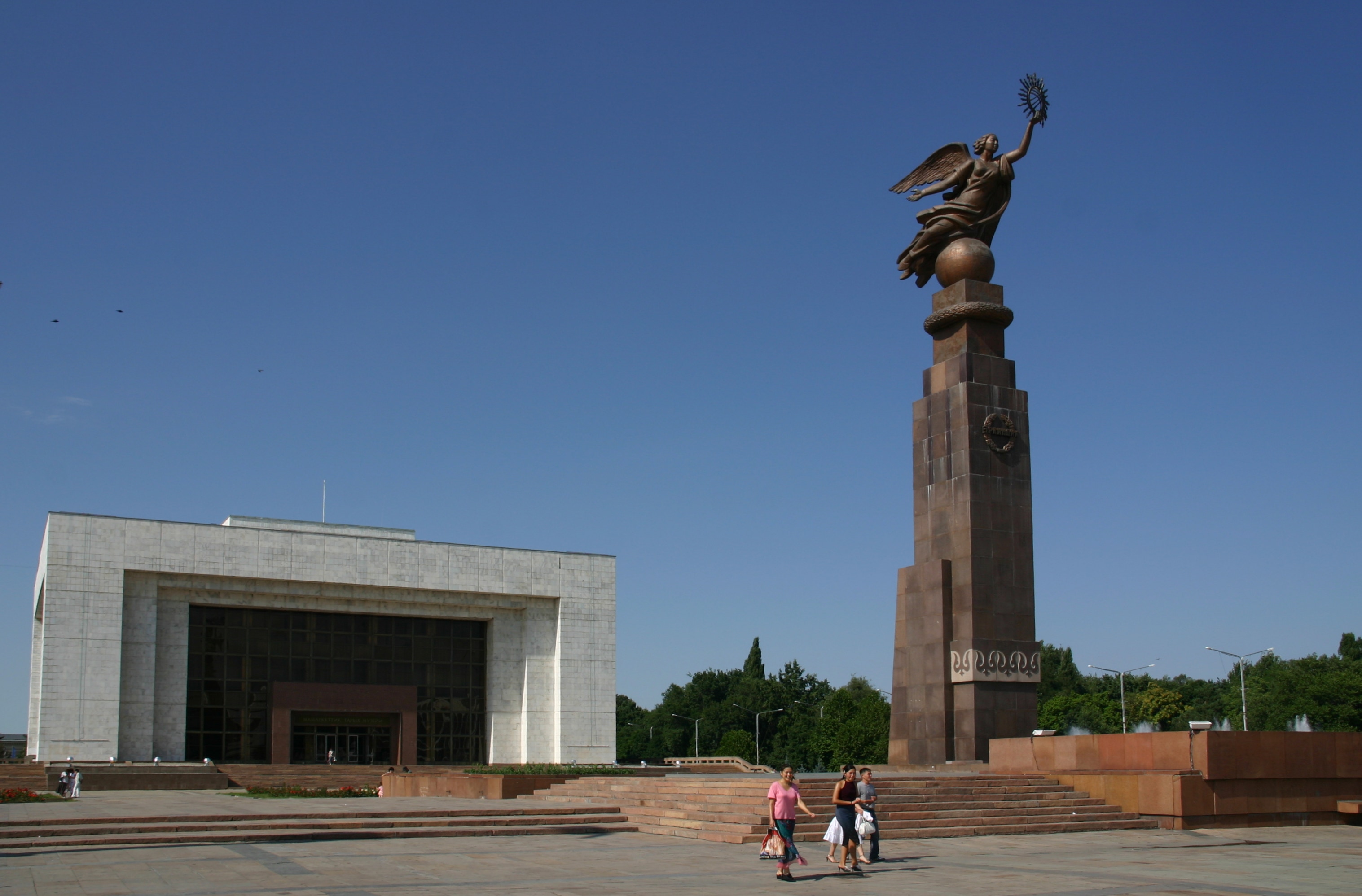 We arrived in Bishkek at about 4:00 pm, and proceeded first to our hotel, the Silk Road Lodge, perhaps the most comfortable night of our trip. The aim was to check in and proceed immediately to the State Historical Museum, but as our rooms were not yet ready, we went immediately to Ala-Too Square, which marks the city centre. The square used to be dominated by a large statue of Lenin, but this was recently replaced by a statue of Freedom. Unlike many other ex-Soviet cities, however, Lenin was not removed in Bishkek, just relocated, in this case to a smaller but nonetheless significant square one block away. After walking through Ala-Too Square and seeing the Freedom Statue and its associated fountains, Andy and I went around the back of the State Historical Museum to see the statue of Lenin before then returning to go inside the Museum.