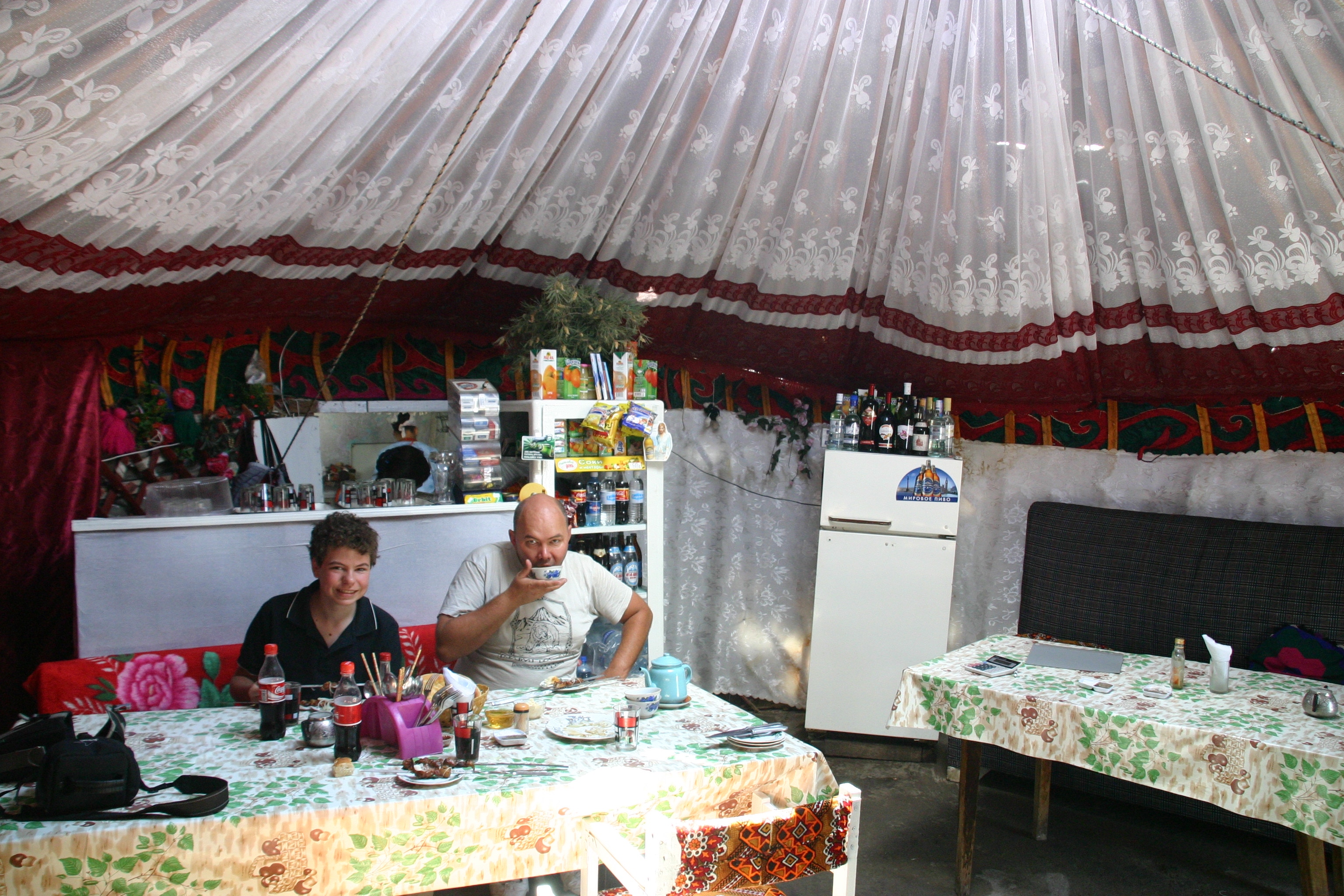 Andy and I both had a wonderful sleep last night. The beds in the spacious yurt were very comfortable, the temperature cool and refreshing (20 degrees as we went to sleep, 18 degrees as we woke) and the environment on the sand spit stunning – a mountain backdrop overlooking the waters of the lake, with fresh air and quiet surroundings. Now if only the toilets had somewhere to sit instead of squat, and if they were less than 300 metres away, and if Timothy's husky pup didn't spend all its time trying to jump on us and run around us as we walked, we could be in heaven! Actually, I found a way this morning to stop the dog jumping and running around us all the time – I trod on it (accidentally of course), and after a high pitched yelp, the dog spent more time limping and licking itself than chasing us.