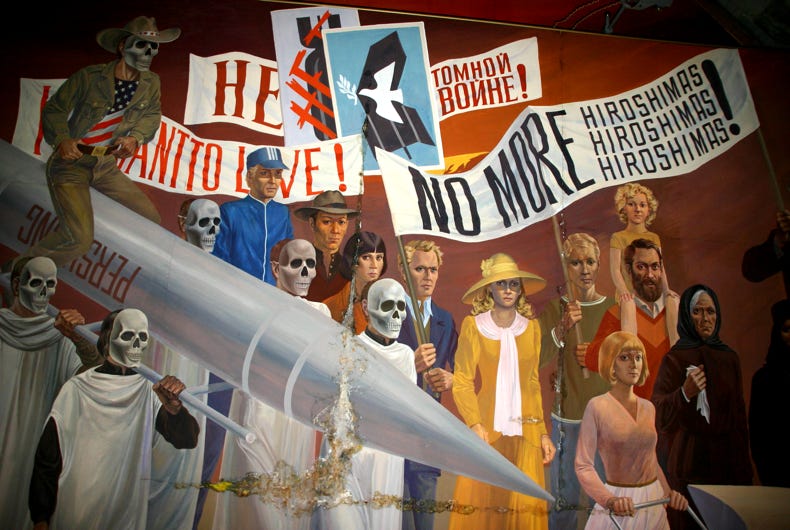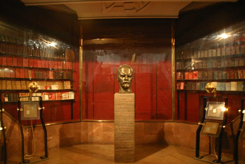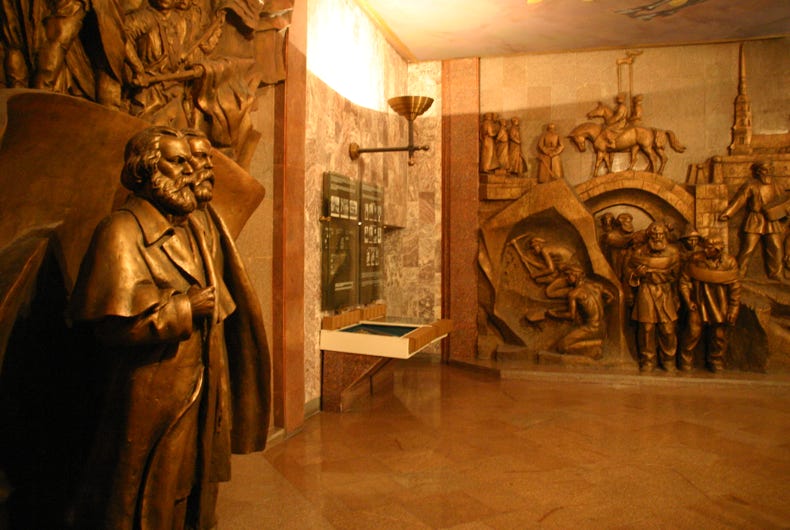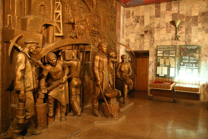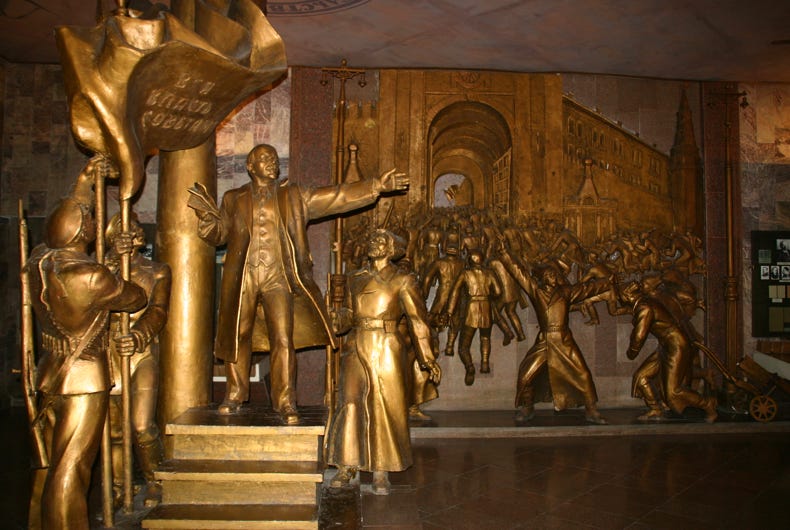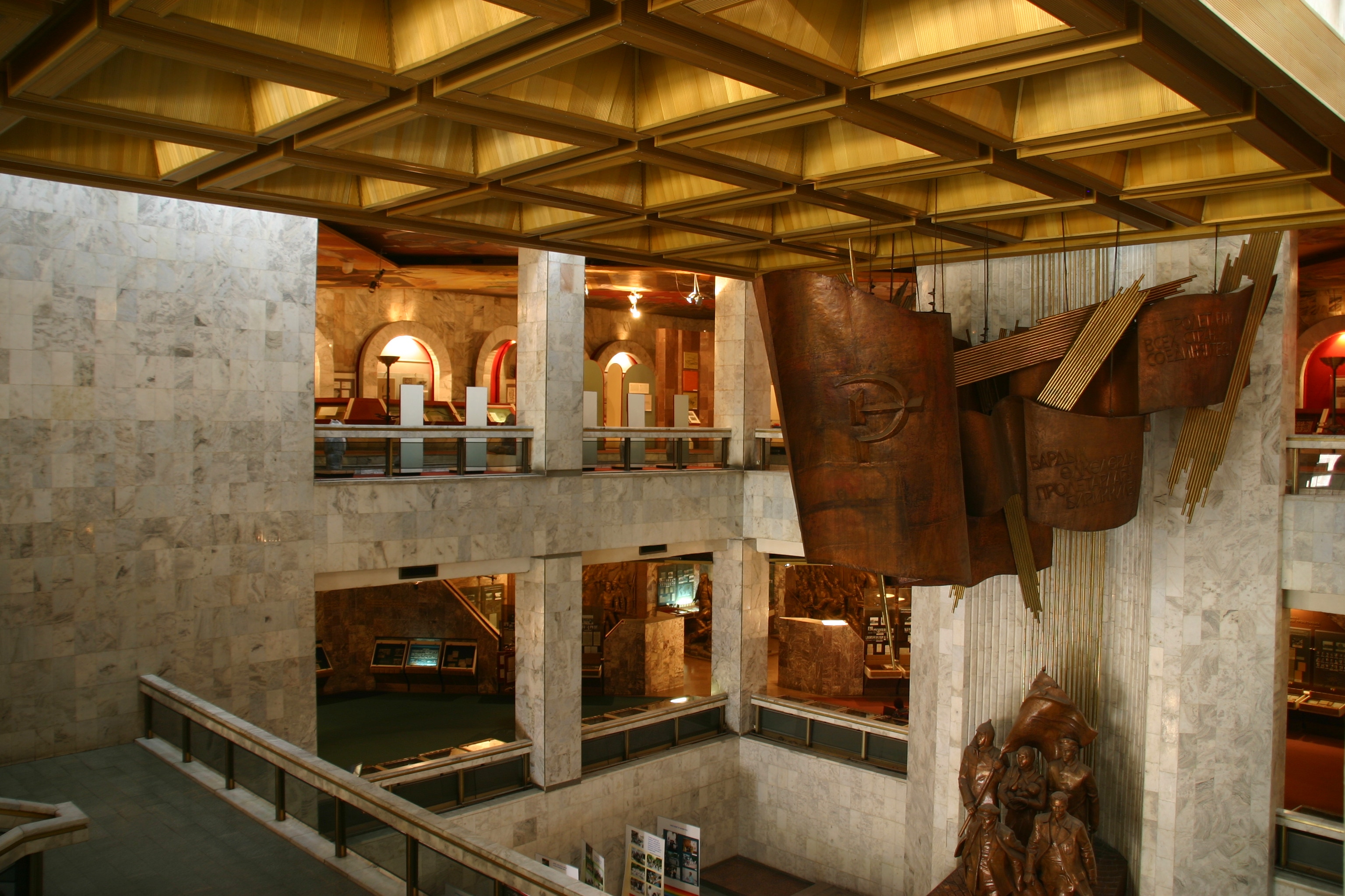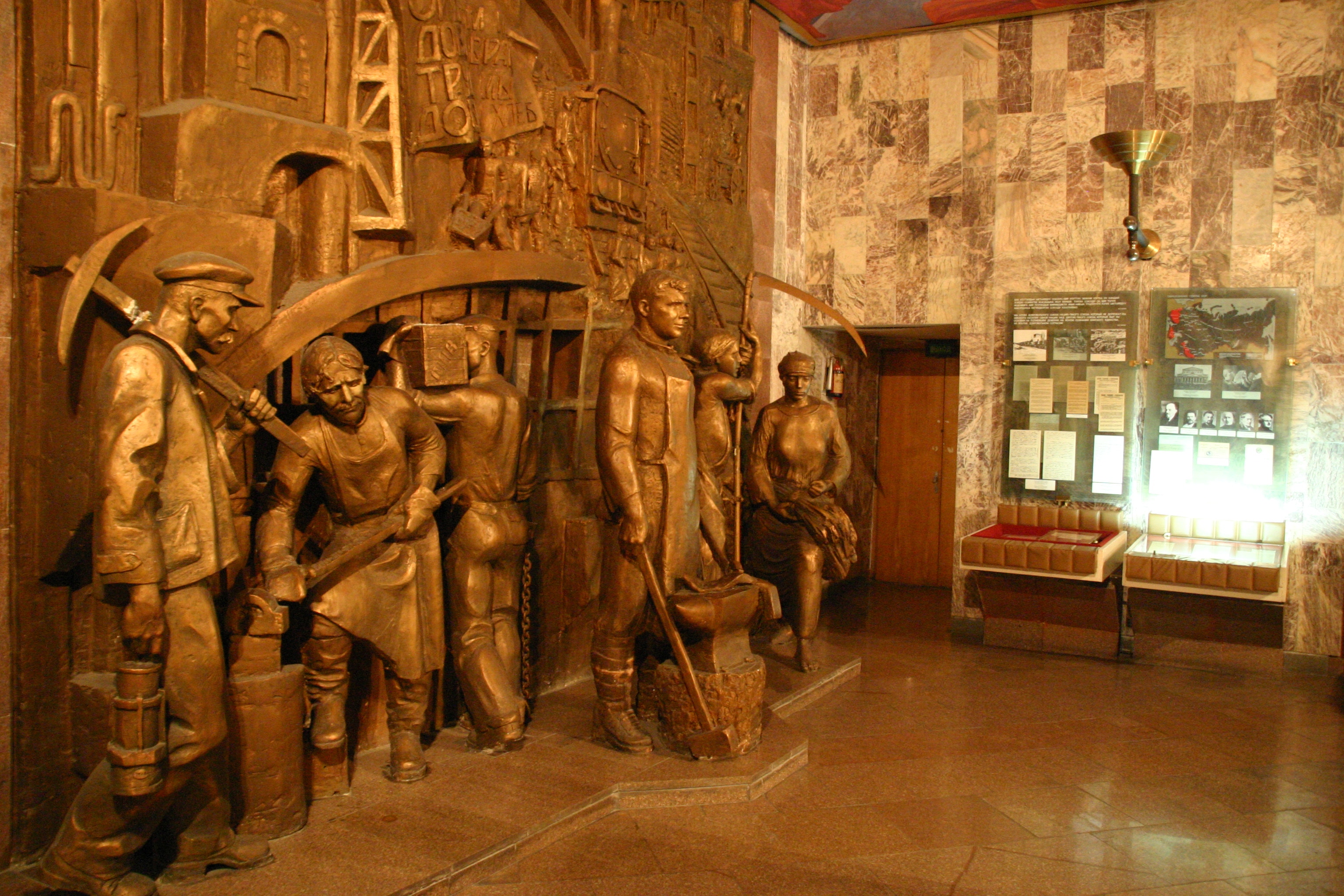 The top floor of the museum traced the history of humanity according to the Marxist sequence of collectivism, serfdom, feudalism, capitalism, socialism and, the final highest stage of development, communism. The middle floor of the museum was pure Leninism, comprising fabulous bronze sculptures in the socialist-realist style, amazing ceiling paintings showing revolutionary scenes, all supplemented by photos of Lenin's life. The story seems to stop just prior to Stalin's rise to power, so the significant but perhaps less revolutionary aspects of Soviet history under Stalin, Krushchev, Brezhnev, Andripov, Chernenko and Gorbachev are notably absent.