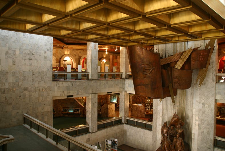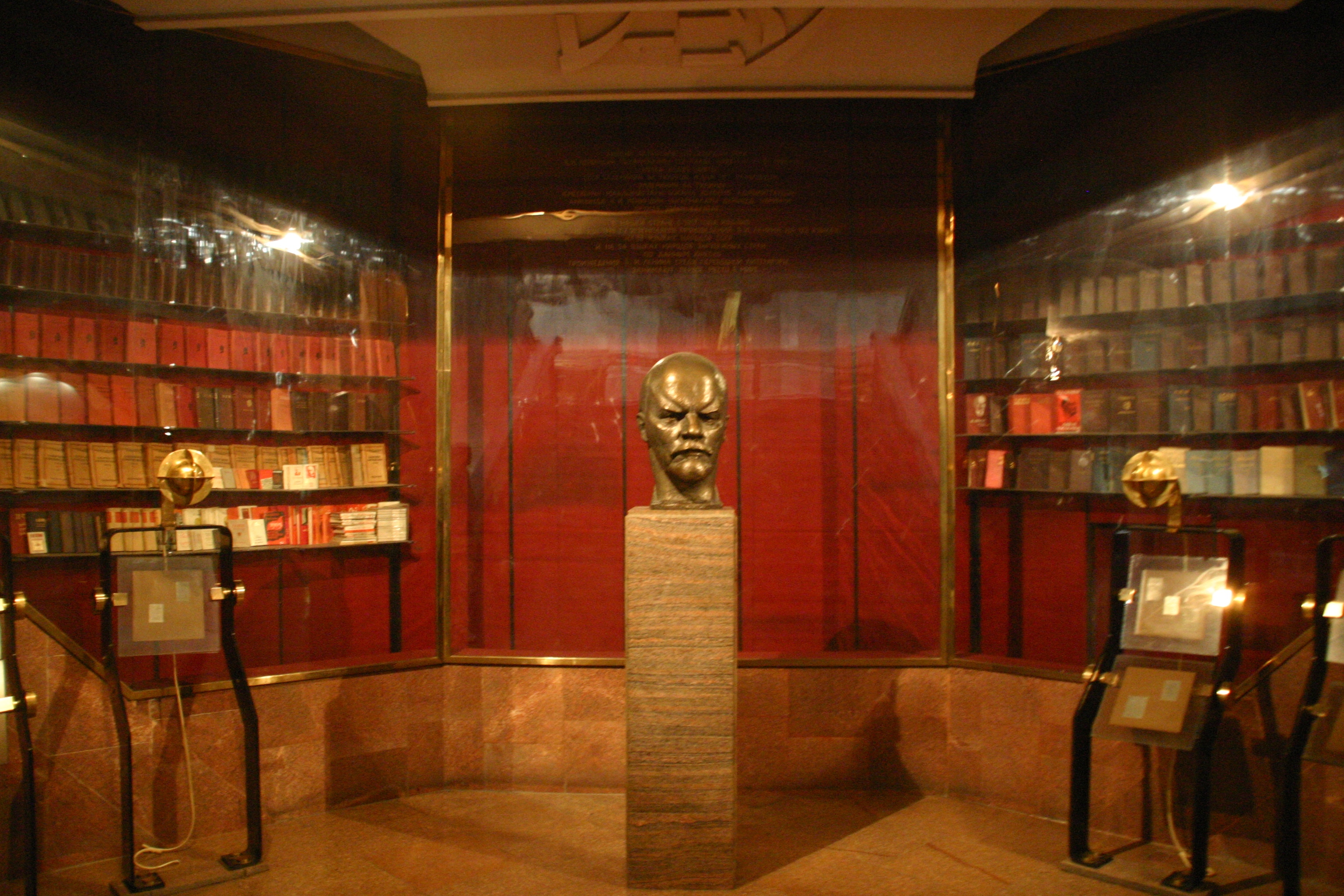 What a Museum! It was opening in 1984, and the Soviet-era display is still intact! It was like walking back in time to the Soviet Union in the 1980s. On entering the museum, we were greeted by a huge bronze statue of Lenin leading a group of flag-carrying workers, over which another huge bronze flag displayed am enormous hammer and sickle. Ascending the stairs, we could not miss the shrine to Lenin, comprising a bust surrounded by copies of his books.