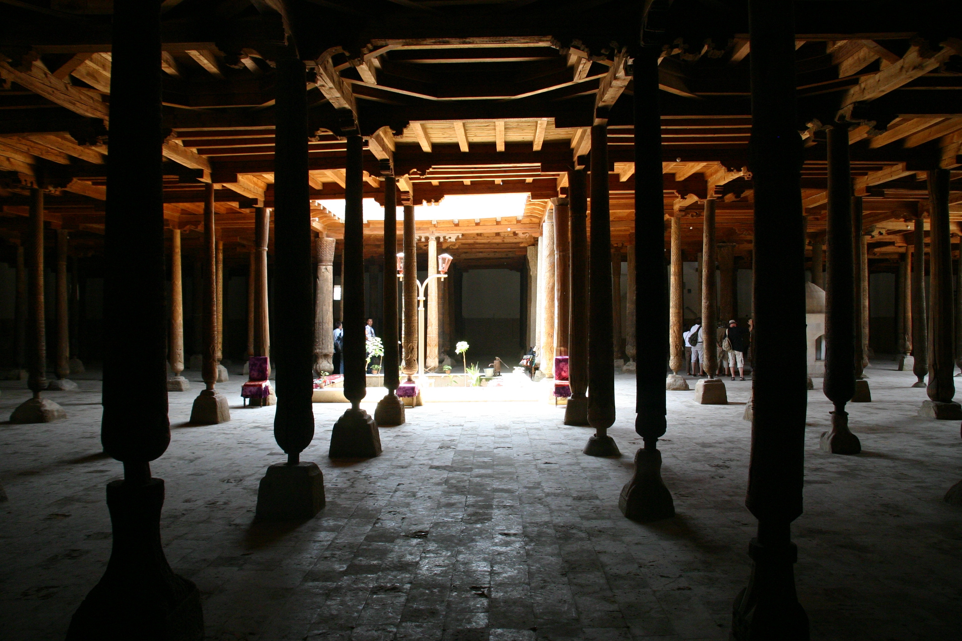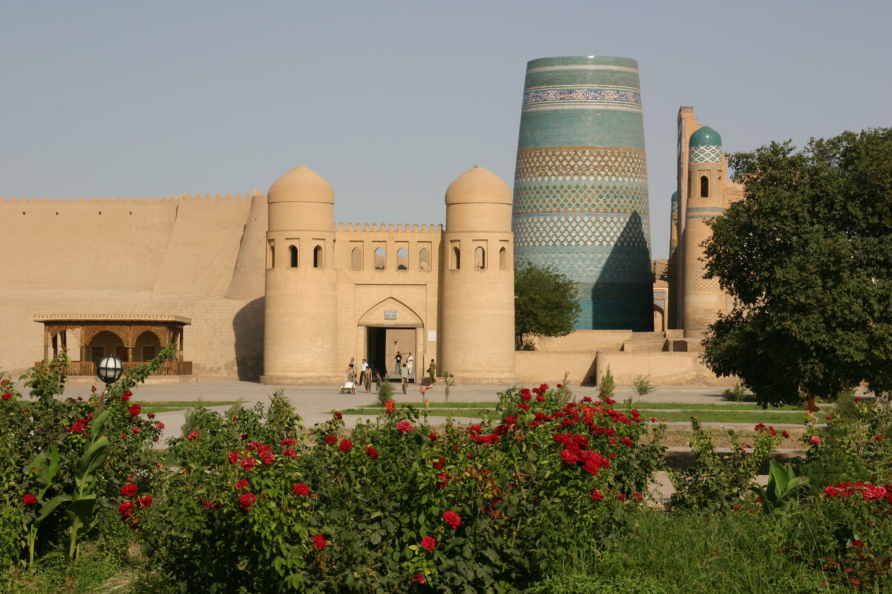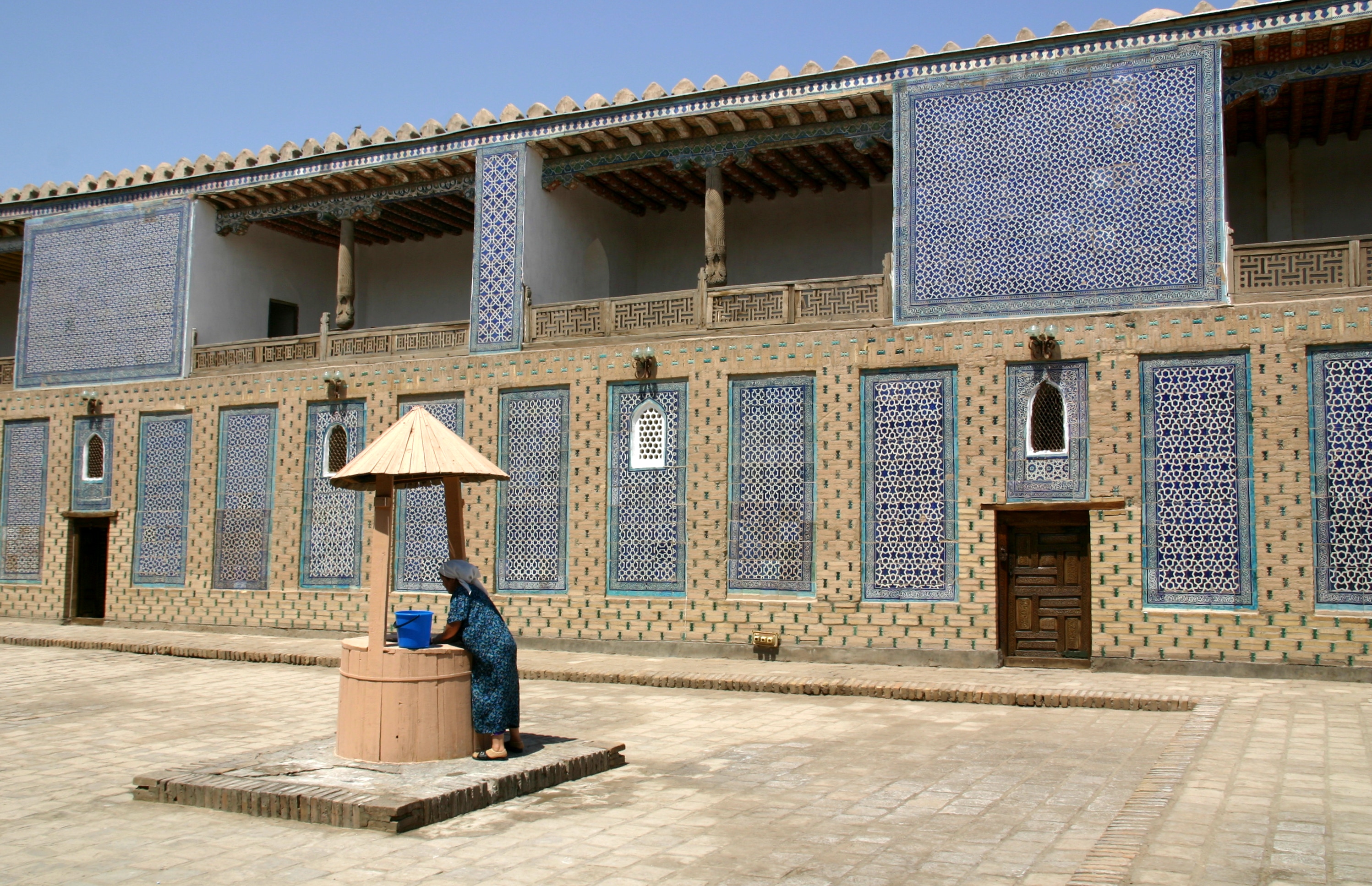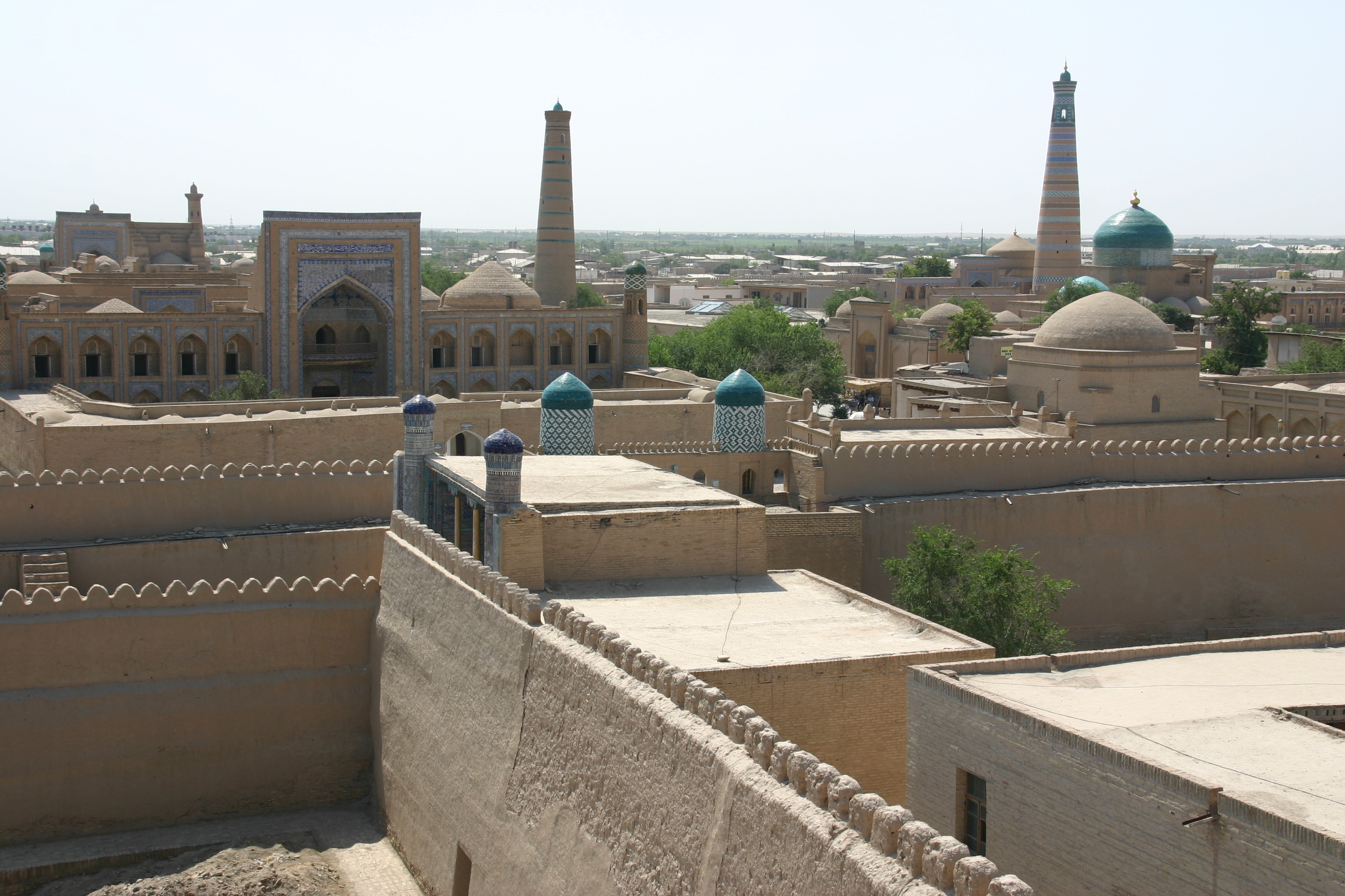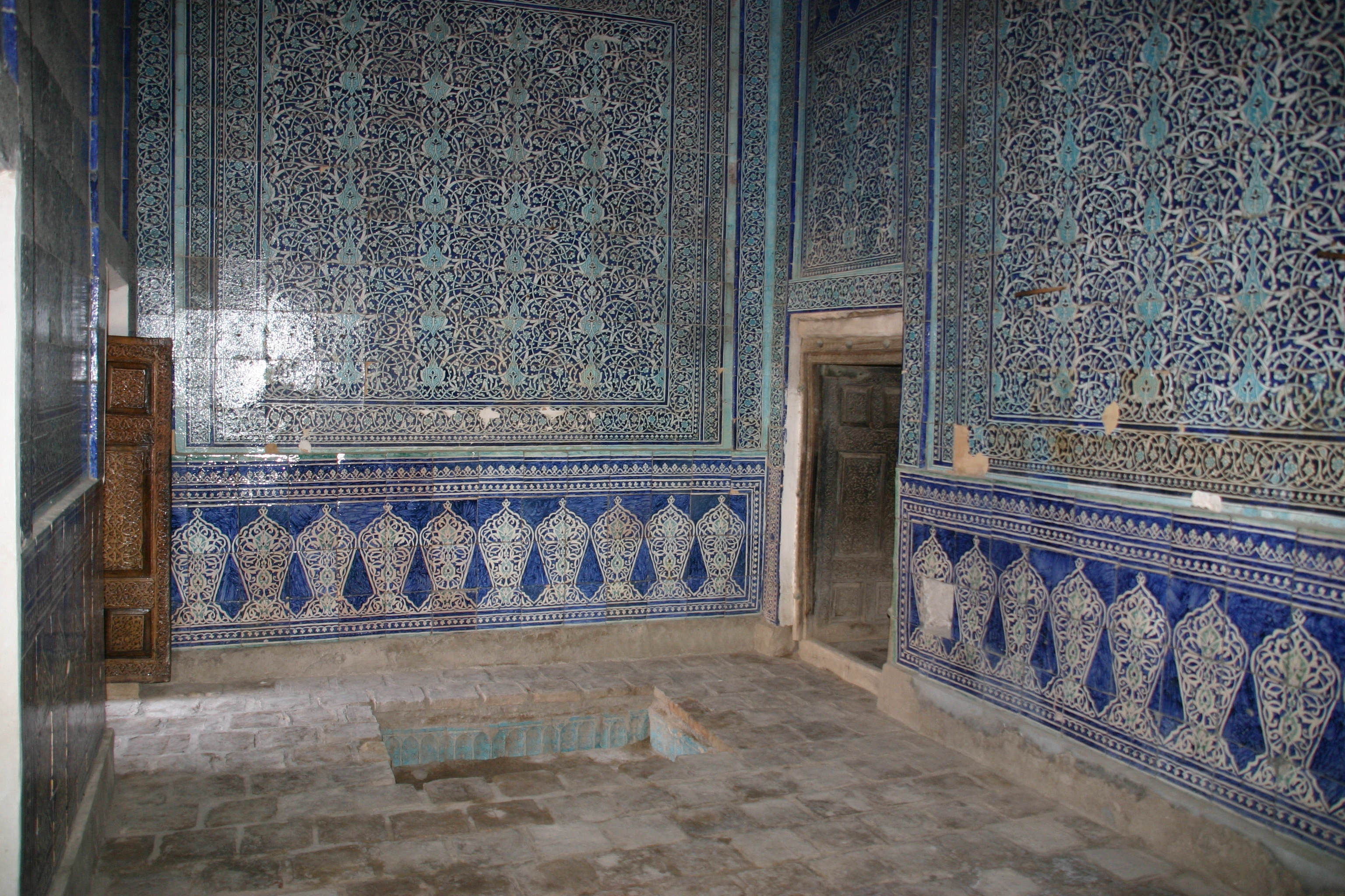 Our two hour siesta lasted from 3:15 pm to 5:15 pm, during which time I relaxed by watching television, writing postcards and doing my daily diary, and Andy slept. At 5:15 pm, we set off for an evening stroll through the old town in the cooler temperatures and the beautiful afternoon light. Our first stop was a return to the viewing platform in the Kukhana Ark, which gave superbly views of the old city in the afternoon light. From there we walked to the Pahlovon Mohammed Mausoleum, Khiva's most revered mausoleum. Pahlovon Mohammed was a poet, philosopher and legendary writer who died in 1326; the present mausoleum was rebuilt in the 1800s. The interior had wonderfully intricate blue-and-white tiled walls and high ceilings – an amazing sight. When we first arrived, I felt we were intruding as a regigious ceremony was underway, but Andy and I were made welcome nonetheless.