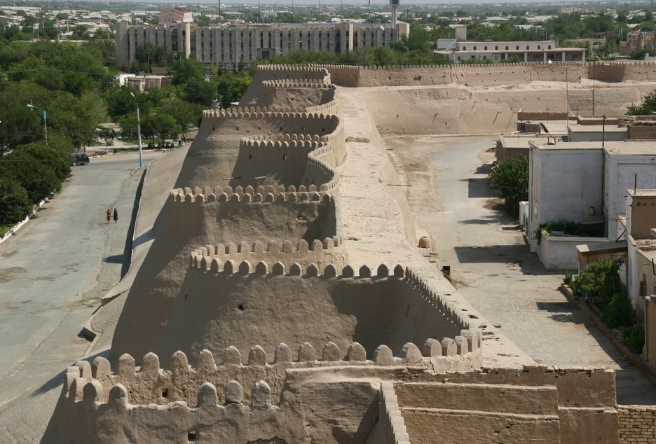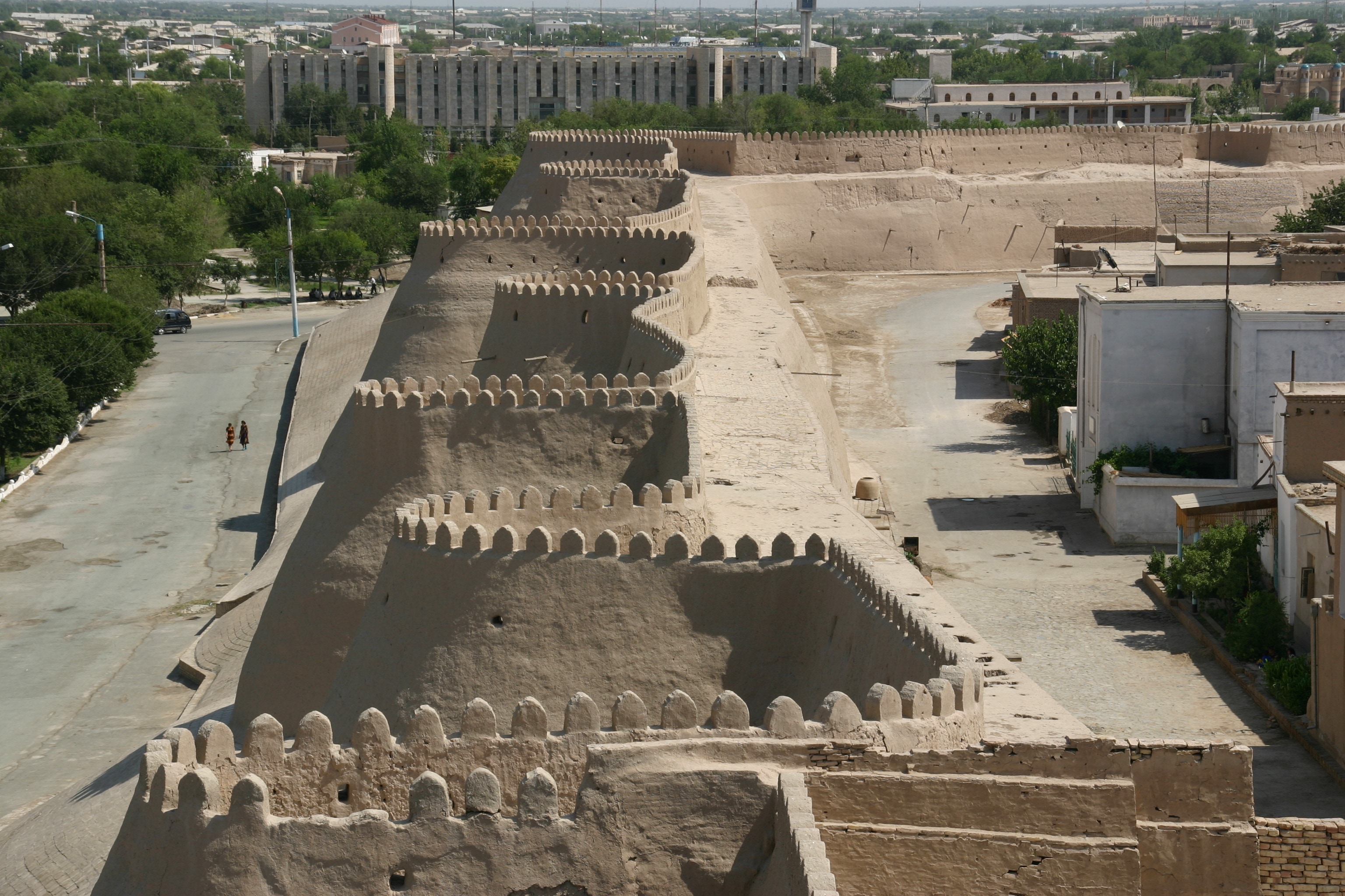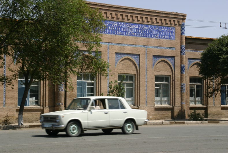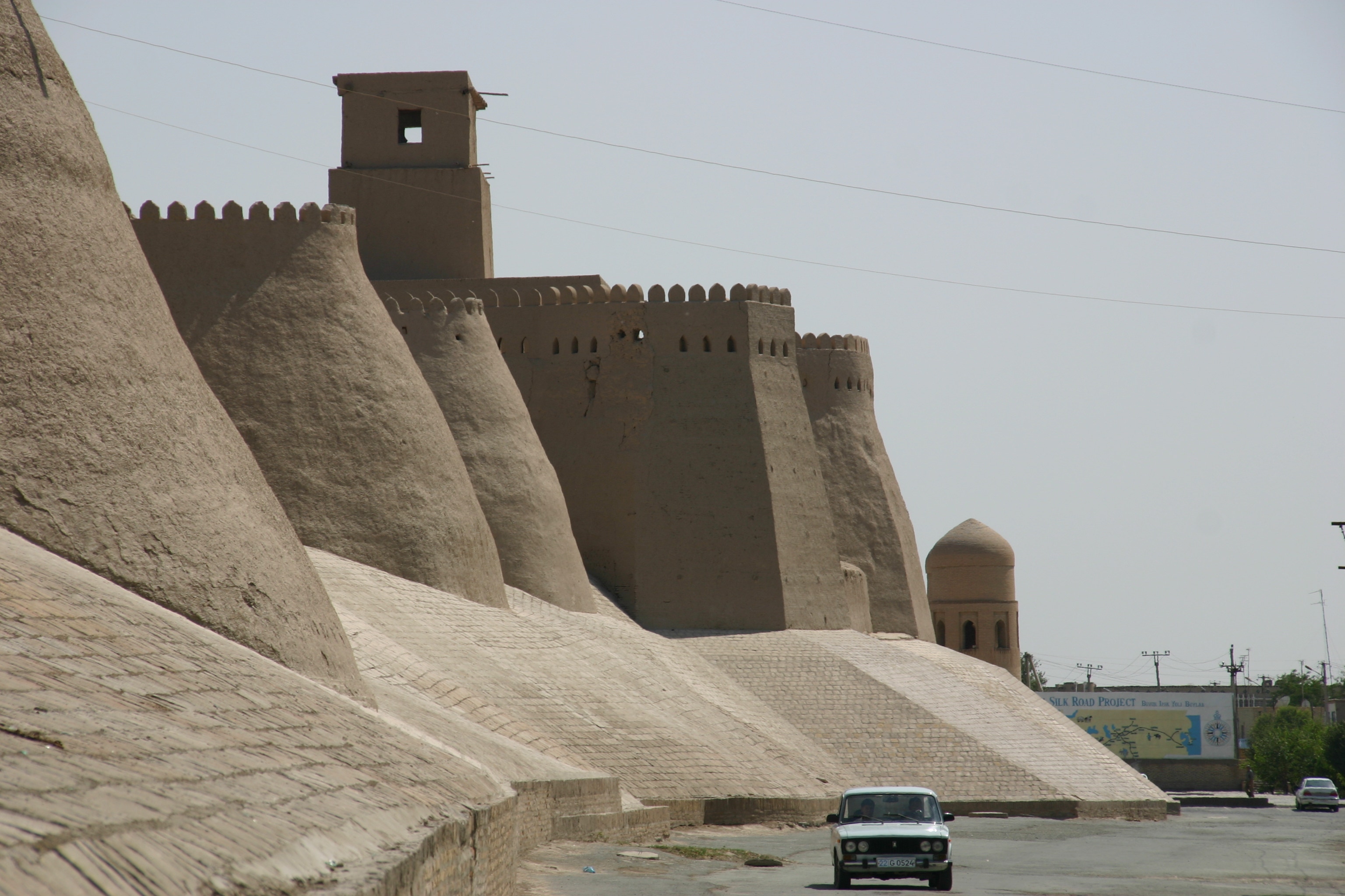 We then headed across the road to the Tosh-Khovli Palace, purported to have sumptuous interior decoration, but this reputation seemed to be based on just one of the palace's 150 rooms. The heat of the day was setting in by this time, so we headed north through the city gate (stopping for a brief climb up the walls for the views) to the post office (650 metres north of the North Gate) to post the postcards I had bought at the Kukhana Ark in the morning. Unfortunately, the combination of not having a pen with me, and a closed post office, made posting impossible, so we returned to our hotel for a siesta, buying another large bottle of mineral water on the way.