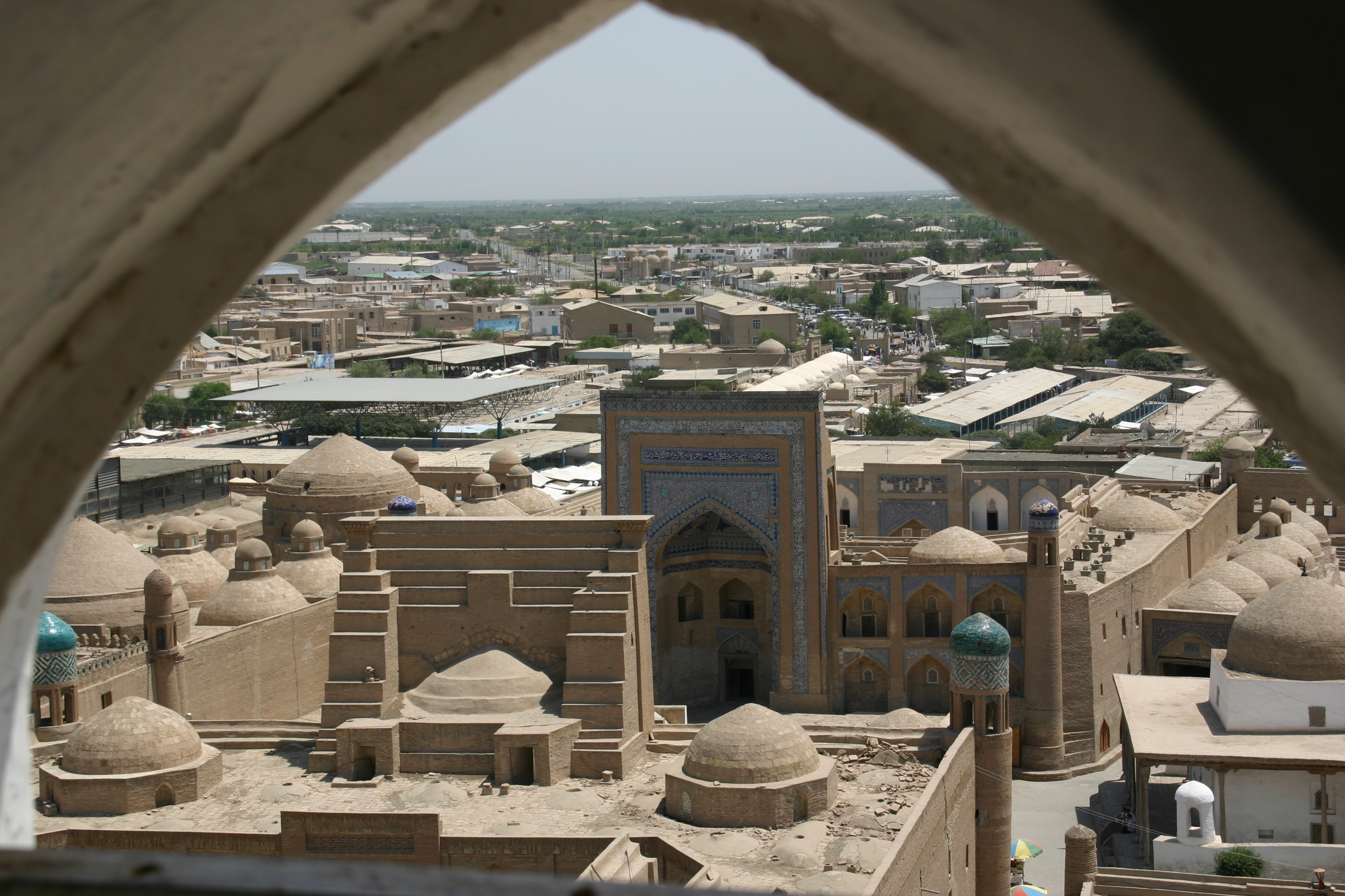 Our next stop was the Juma Mosque, with its impressive cool interior supported by 218 carved wooden columns. There was another minaret to climb, even steeper and darker than the last, but fortunately only 81 steps this time, and with the reward of more spectacular views over the city. A walk to the east gate brought us another cool drink, mineral water this time before we headed north through the Alloquili Khan Madrassa to the local markets. The interior was cool but fairly ordinary, selling just household goods such as soap, detergents, hair shampoo and television cabinets. The outside was much more interesting with stalls selling huge melons, an Uzbek specialty. One of the sellers insisted on having his taken with Andy, and was delighted to see the image on the back of my digital camera.