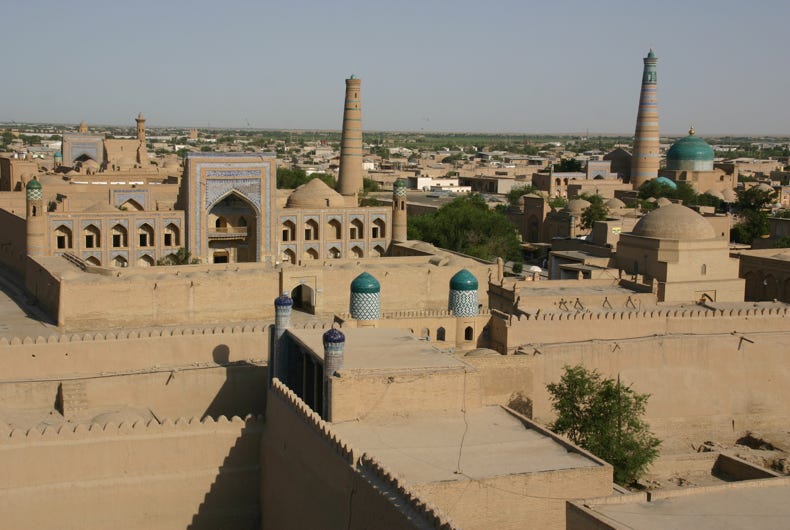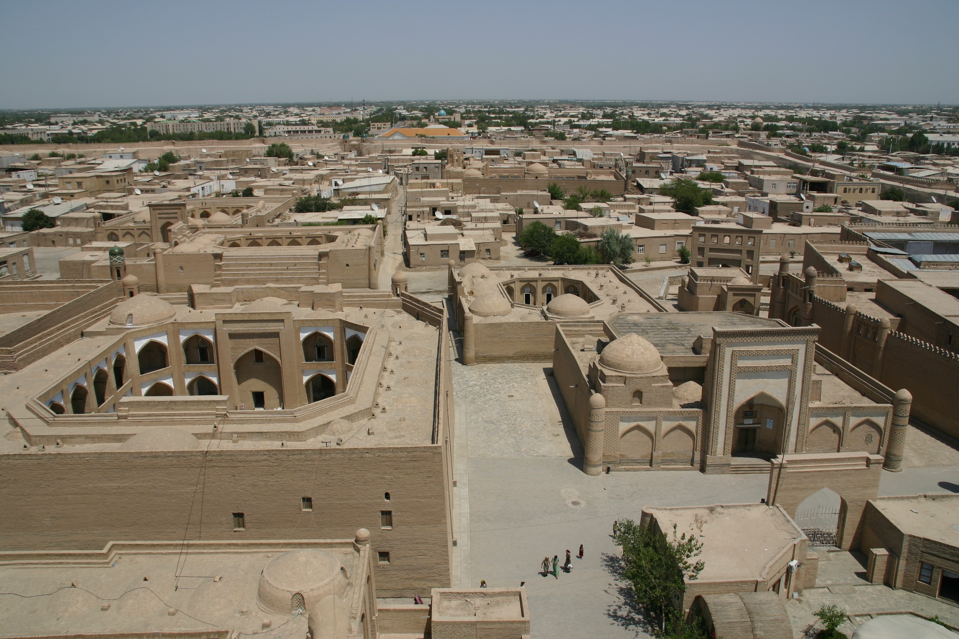 We began our exploration of Khiva at 9:15 am, and stayed out walking for 6 hours. Our first stop was the Kukhana Ark, a large former palace of the khans near the west gate that we had visited yesterday afternoon, though too late to ascend to the viewing tower on the west wall. Today we arrived in plenty of time to ascend to the viewing platform, which provided stunning views across the old city, and the area to the west of the city walls. After some more stops in the Kukhana Ark, including the throne room, we headed east to the Islom-Huja minaret, where we climbed the 118 steep and unlit steps to the top for another spectacular view right across to the edge of the city where the green oasis vegetation gave way to the sands of the Karakum Desert. It was only when we descended and stopped to share a Coke that Andy and I noticed the large cracks in the minaret – probably not a good place to be caught in an earthquake!