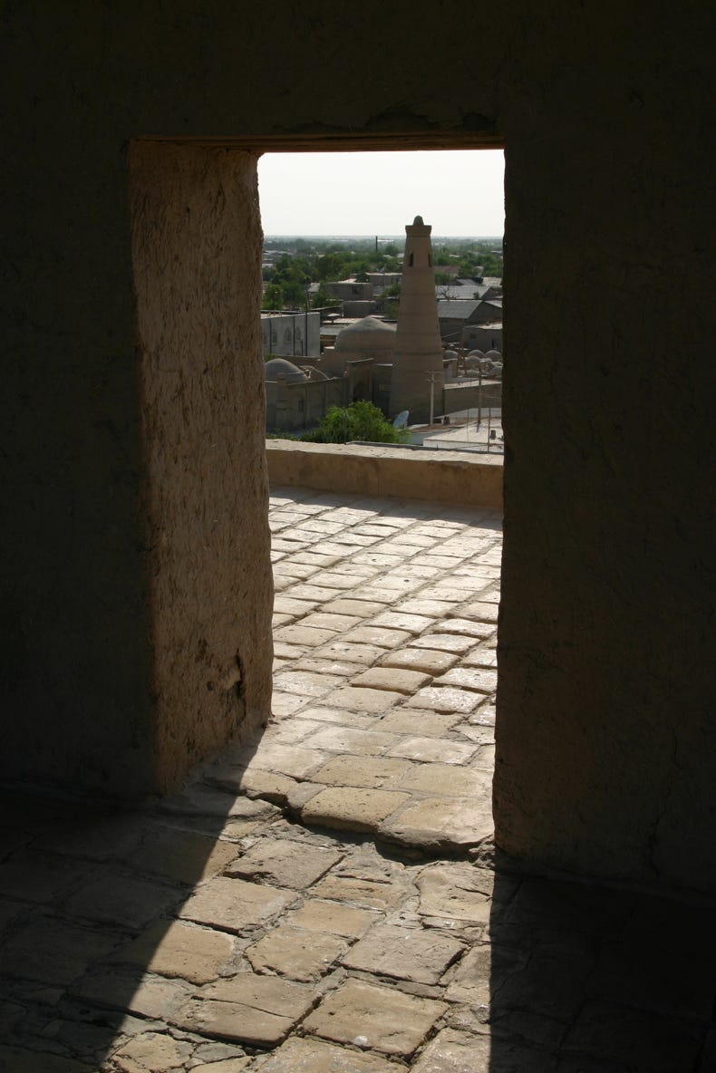 Today has been a lovely day of exploring the ancient city of Khiva by ourselves. Not having to get up too early because we were free just to set our own agenda, we slept in a little – though not as much as I had hoped because although I had changed my watch, my alarm clock was still in Kyrgyzstan time. And so thinking we were having breakfast at 8:30 am, we discovered that it was in fact 7:30 am – not so good for sleeping but great for getting extra time to explore the city. We had a leisurely breakfast at the hotel, served to our table, comprising a curious mix of fried eggs with potato fritters, pancakes with honey, cheese and pressed meat, accompanied by blackcurrent juice and coffee. And playing on the television set in the dining room was an inane American movie dubbed into Russian, following the usual pattern that white guys are dumber than black guys, all guys and dumber than females, and all humans are outwitted by animals (in this case, two very smart and agile dogs). I don't know what the move was called, but I do not think it was anything with a deep explicit philosophy.