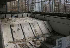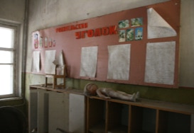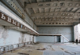 In the abandoned school, many books are still on the shelves where they were left in the hurried evacuation of 1986 (although many others have been strewn across the floors by 25 years of summer winds and winter blizzards. The floor of the school canteen is strewn with gas masks and radiation overalls. In the store-room of the city’s theatre, Soviet-era propaganda posters, flags and portraits lie ready for the next political event that will never come. The indoor pool is empty and filling with wind-blown dirt, and the dodgem cars lie rusting away in the fun park where they were abandoned by children as they left to escape the radiation, 25 years ago.